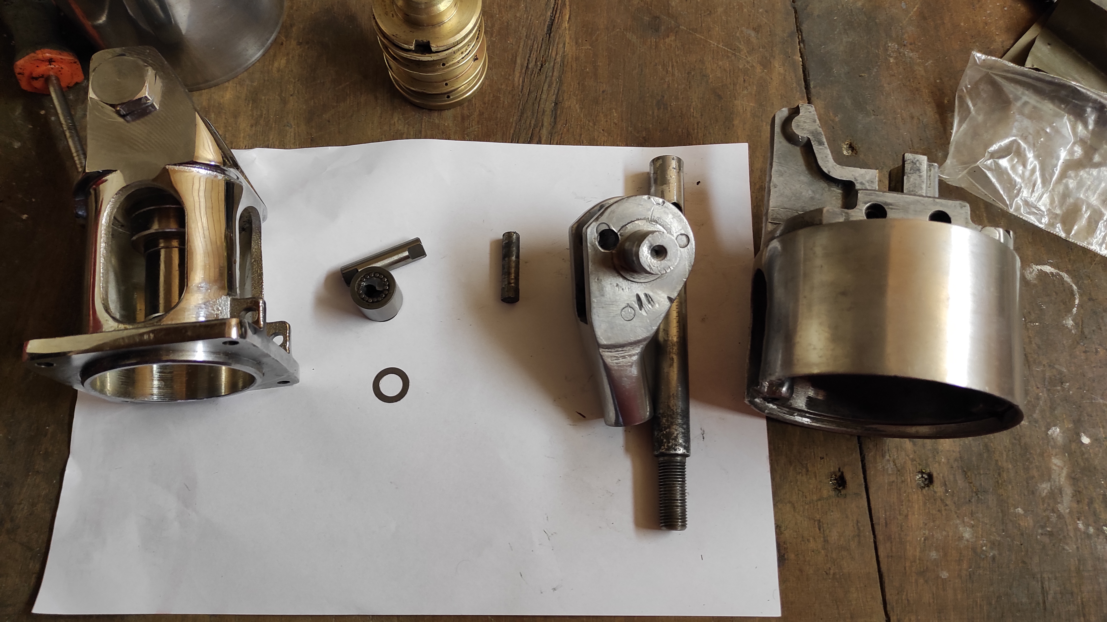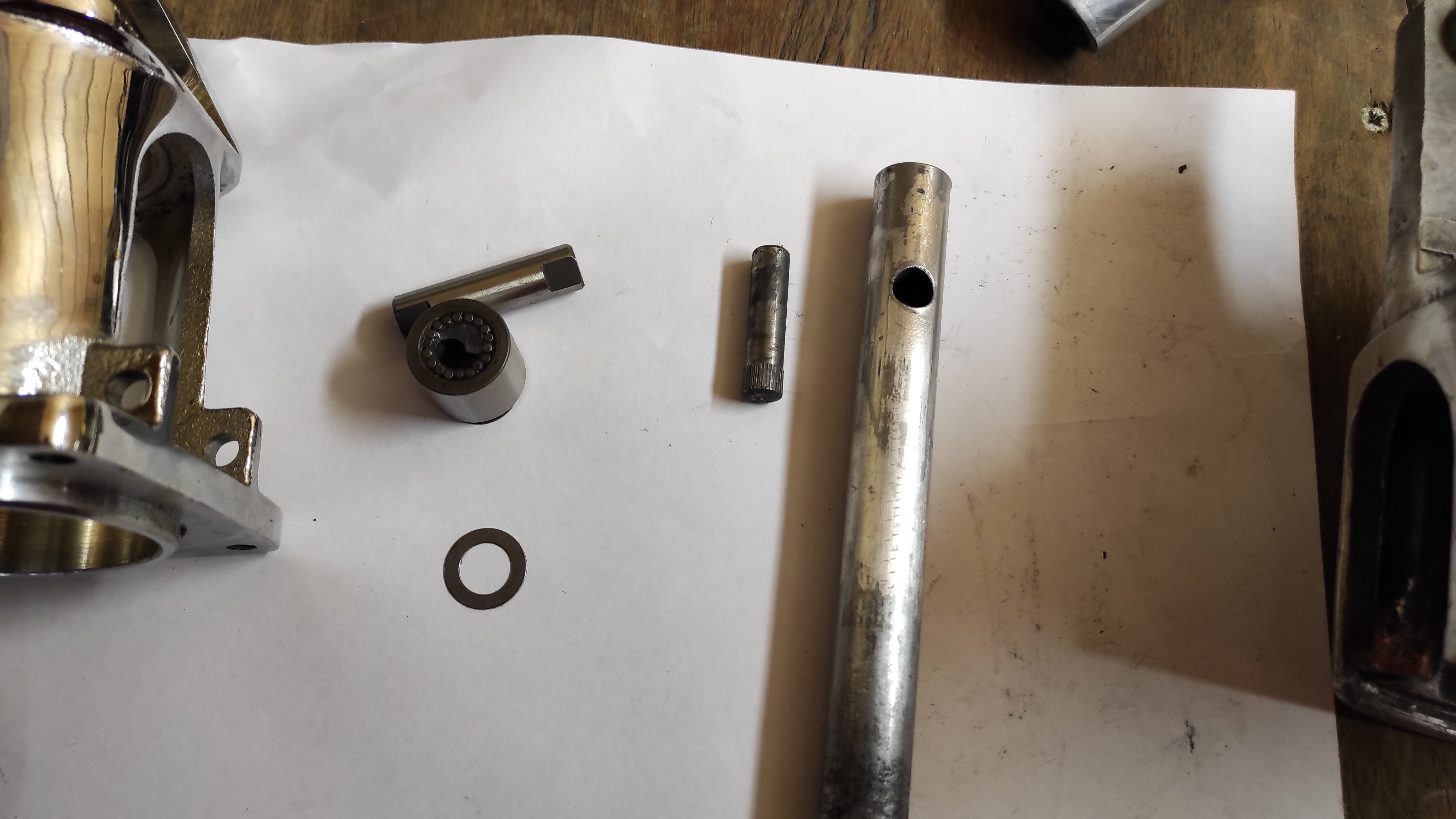 De verbinding tussen de zuigerpen en vork bestaat uit een paar gaten waar een pen doorheen gaat. Geen lagering .Uiteraard slijt dit en dat is ook bij de mijne te zien.