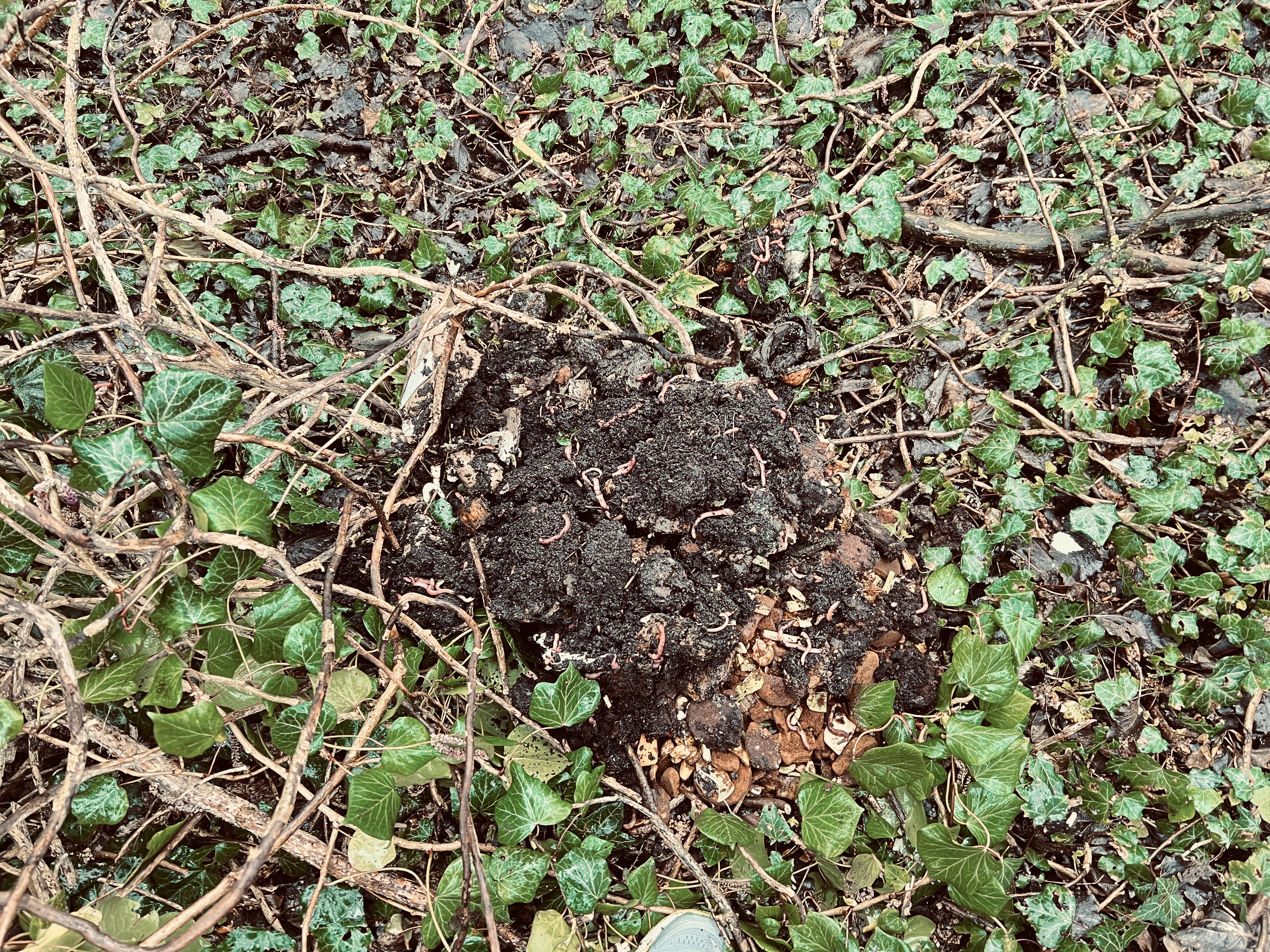 De laatste dagen probeerde een aantal pieren uit de sterk toegenomen populatie steeds de omgeving te verkennen op zoek naar meer grond om in weg te kruipen maar er is op mijn balkon niks voor ze. De forse emmer raakte ook behoorlijk vol en het is mij niet duidelijk waar al die pieren heen moeten als het voedsel opraakt dus ik heb alles naar een park gebracht en op een mooi plekje tussen de bomen waar veel klimop groeit geleegd.