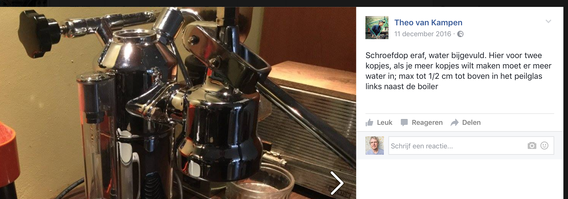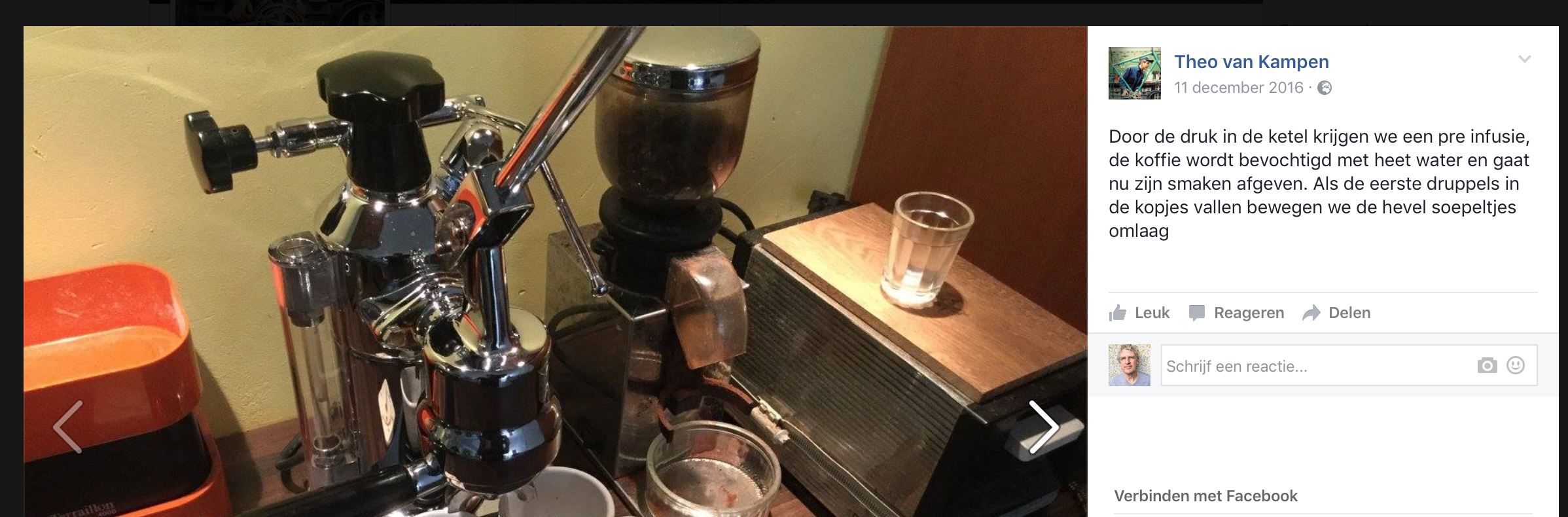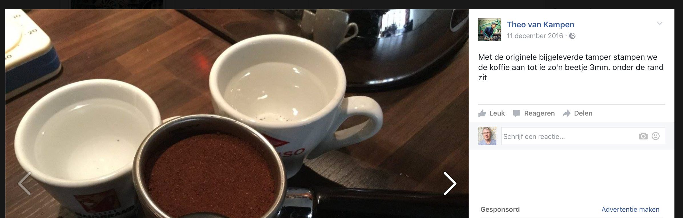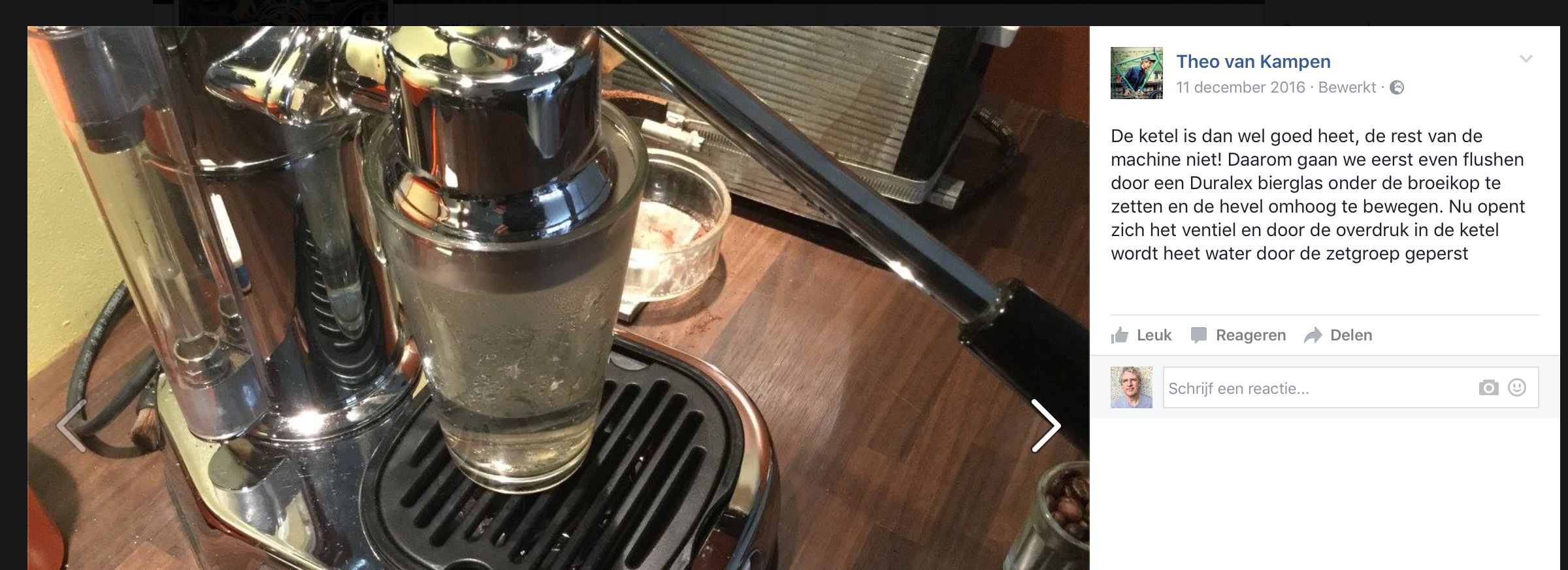 Tevens zat ik nog te denken over de opmerking dat ik twee espresso gemaakt had en niet twee ristretto. Als ik de handleiding van La Pavoni (waar bij nadere bestudering wel degelijk -zij het op de valreep en op een heel onlogische plek in de tekst- de preflush wordt geadviseerd) goed begrijp maak je één espresso door 't kleine filterbakje met koffie te vullen en de hendel 1 maal omlaag te bewegen. Als je datzelfde doet -dus de hendel 1 maal omlaag bewegen- met 't grote filterbakje in de broeikop krijg je dus 1 eenheid water voor twee maal zoveel koffie in het portafilter. Zo wordt ie relatief een stuk sterker. Toch? La Pavoni zegt dan ook in de handleiding dat je voor twee kopjes espresso: