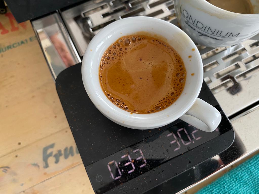 De espresso boon heb ik nog fijner gemalen. Merk dat de Sylvia het dan wel lastig krijgt om het eruit te persen, maar uiteindelijk krijg je na 2/3 seconden langzaam de koffie eruit al dan niet druppelend of een heel dun lijntje.