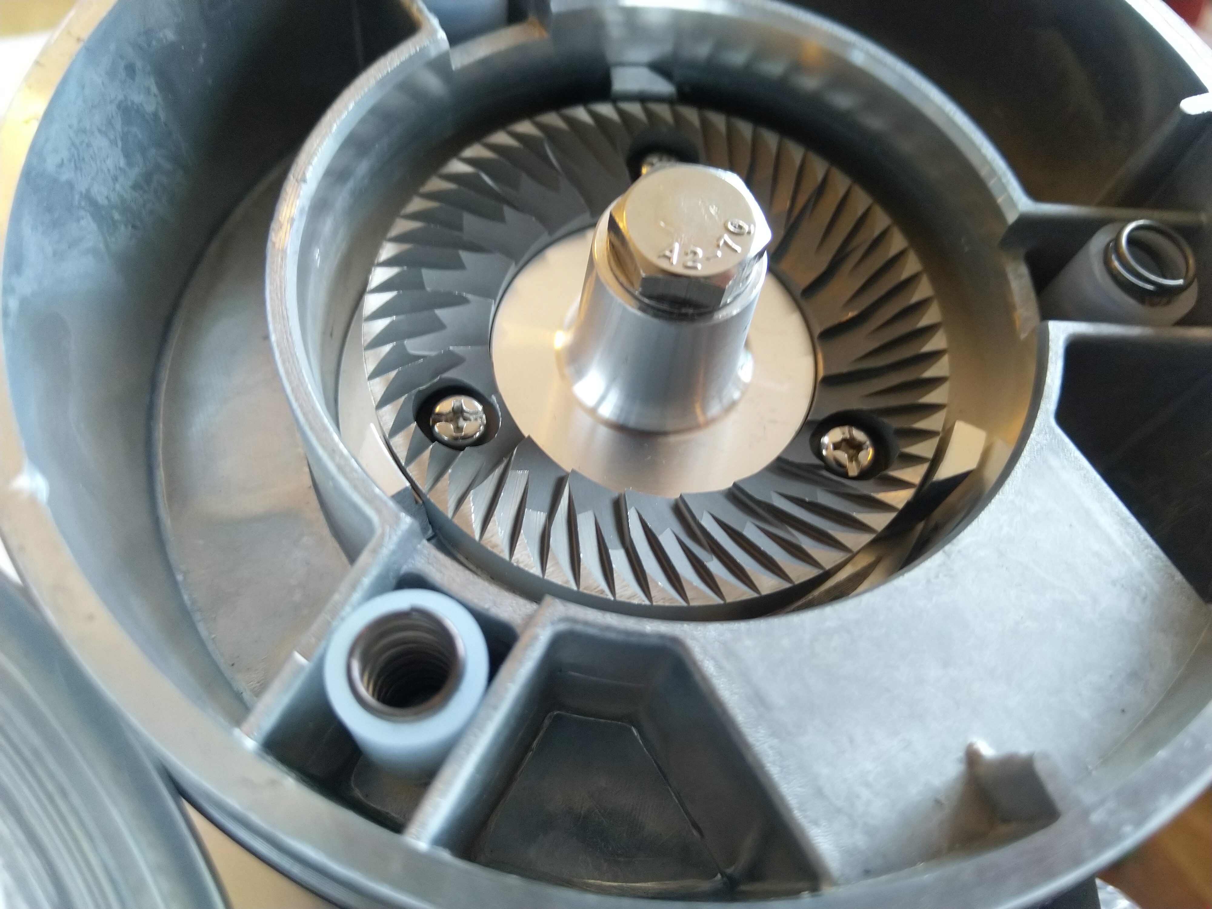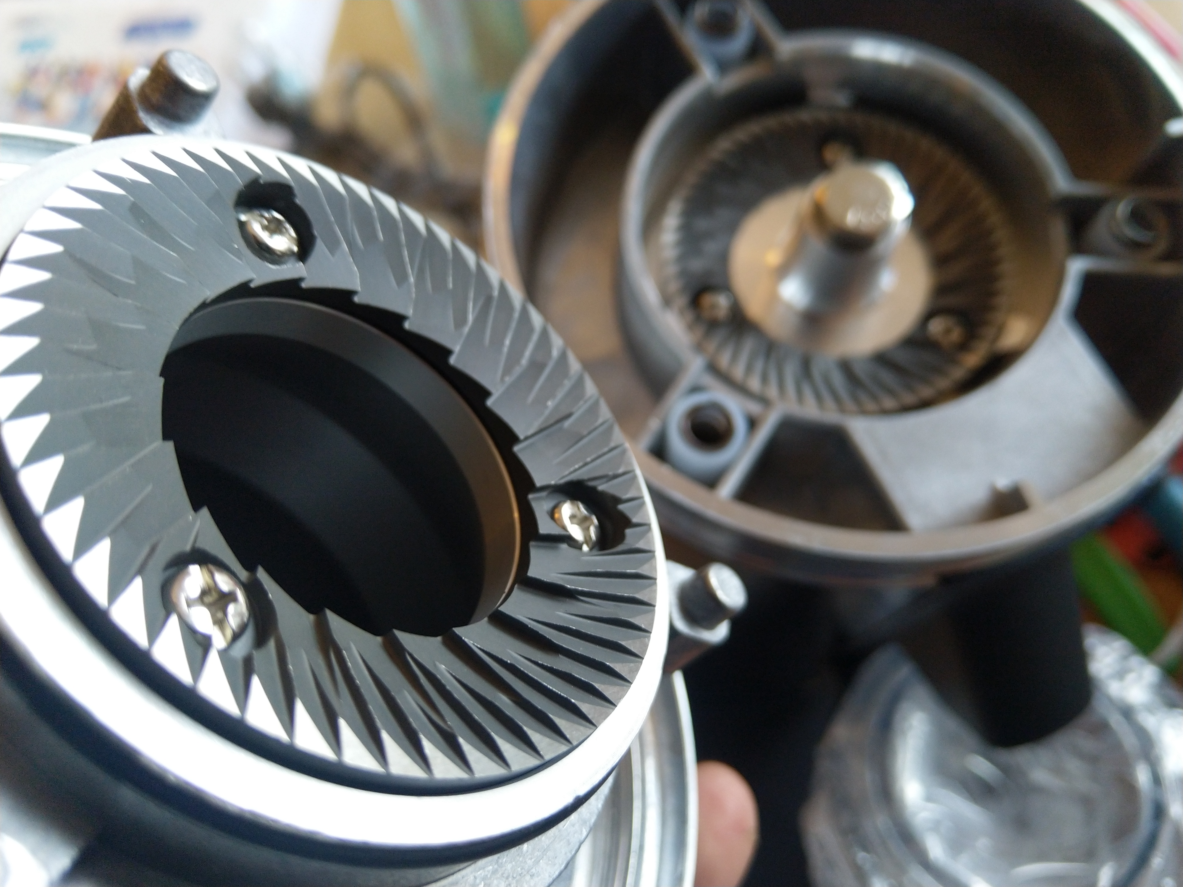 Het is niet zo dat het 'upgraden' van schijven pas recent is bedacht. Toen ik mijn Mazzer Mini kocht, bijna tien jaar geleden, nam ik er al de schijven van de Super Jolijt bij, die net zo goed pasten. Belasten de motor iets meer, zijn daardoor niet geschikt in die combi in een café.