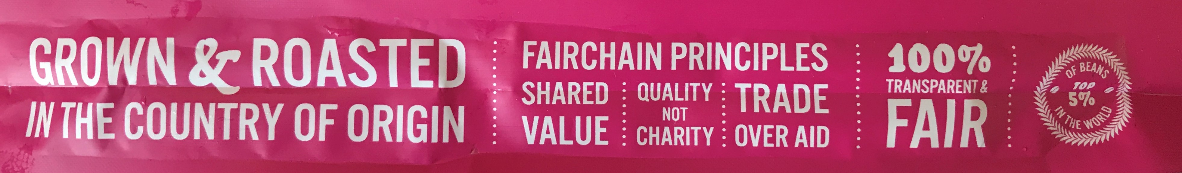 Het is ‘FairChain’ koffie en zoals ze zelf omschrijven; De ‘holy grail’ van FairChain: ‘lokaal branden! Hierdoor verhogen we de hoeveelheid geld dat achterblijft in de producerende landen met 300%’. Shared Value, Quality, not Charity en Trade over Aid zijn verder de omschrijvingen die de verpakkingen sieren. Enigszins schreeuwerig, maar zo valt het wel op in de winkels.