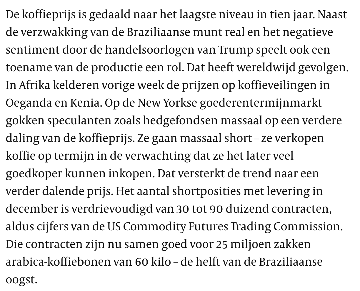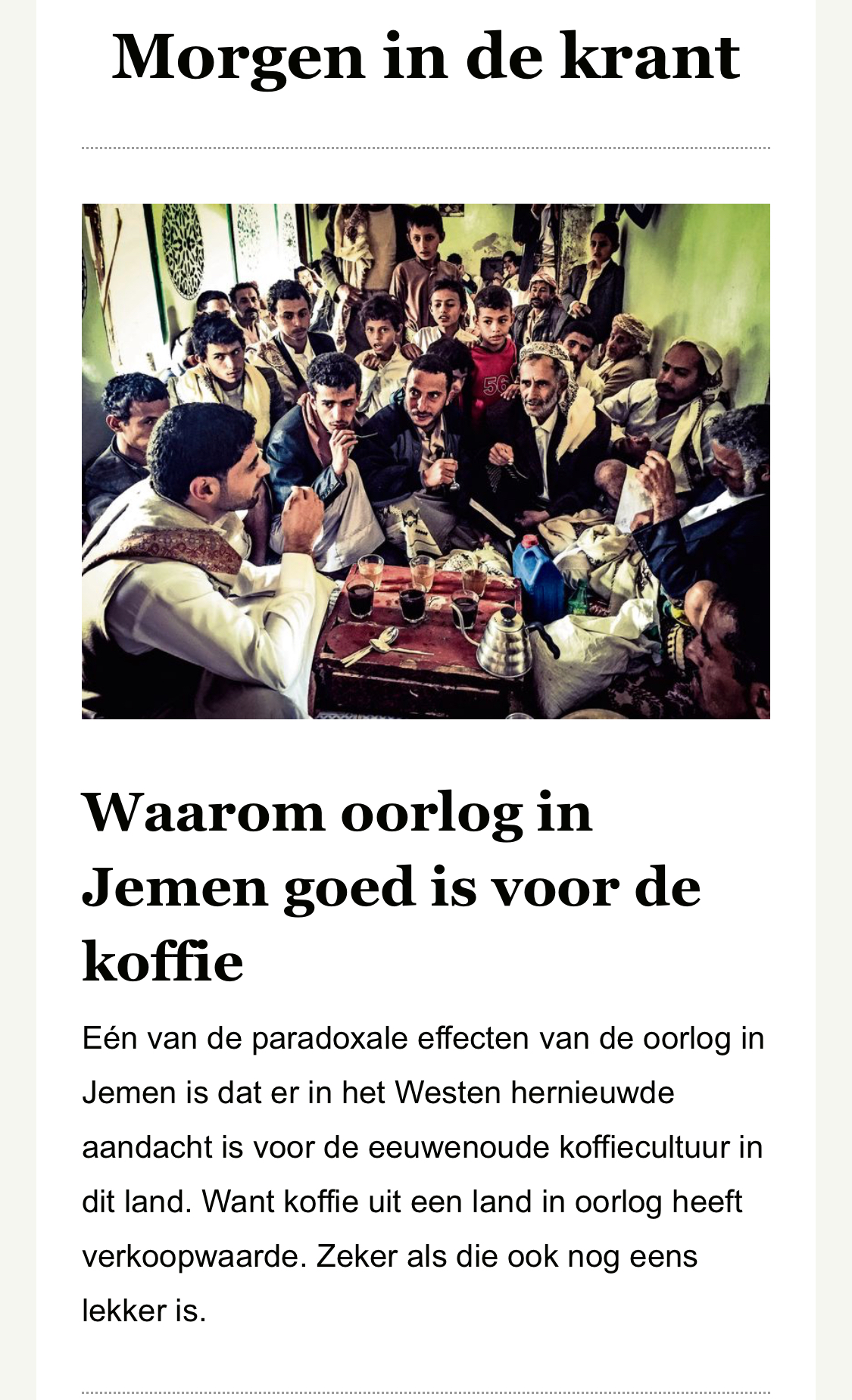 Ja. Verder een wat vaag en rommelig artikel. Een concurrent van de "Monk of Mokka" wordt gesproken, boeren die er maar mee ophouden omdat koffie niks oplevert, zeker vergeleken met het snel verbouwen van het verslavende qat wat de meeste mannen daar 's middags kauwen. Men gaat liever in het buitenland werken en geld opsturen naar vader die daar dan weer qat van kan kopen.