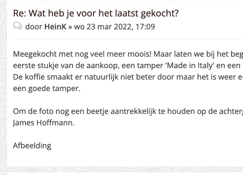 Meegekocht met nog veel meer moois! Maar laten we bij het begin beginnen.... Als kleine teaser nu dus het eerste stukje van de aankoop, een tamper 'Made in Italy' en een 'JoeFrex Tamping Station Exclusive, Black'. De koffie smaakt er natuurlijk niet beter door maar het is weer eens wat anders. En ik moet zeggen, het is een goede tamper.