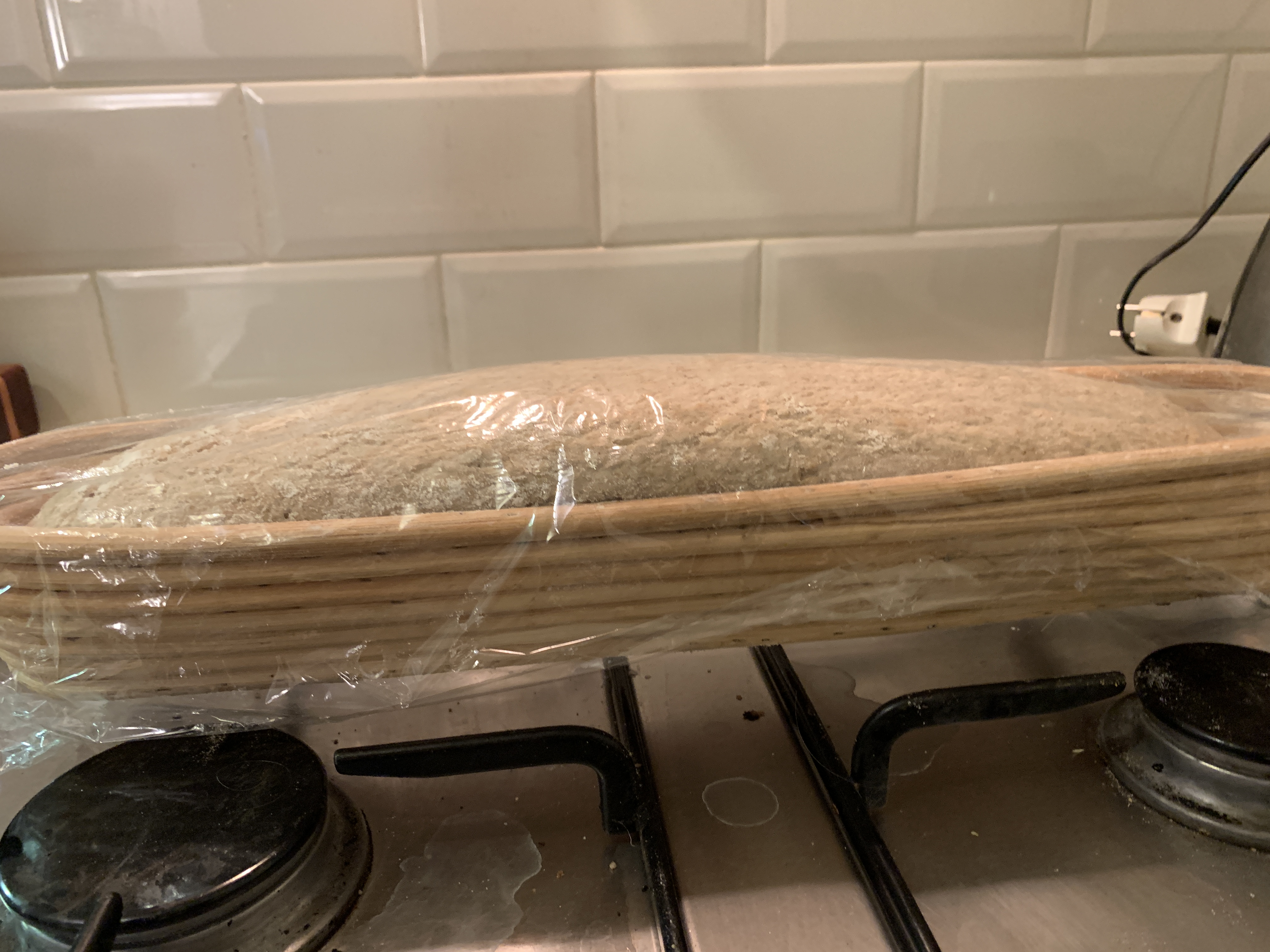 Oh ja zo zou je het kunnen zien! Ik heb een poos gelee twee mandjes weggedaan omdat ik die nooit meer gebruikte, maar deze lange dunne kwam ik toch nog tegen achterin een keukenkastje. Meteen geprobeerd, vergeten voldoende meel te strooien dus geheel vastgeplakt wat een blubber opleverde die uit de oven toch lekker was.