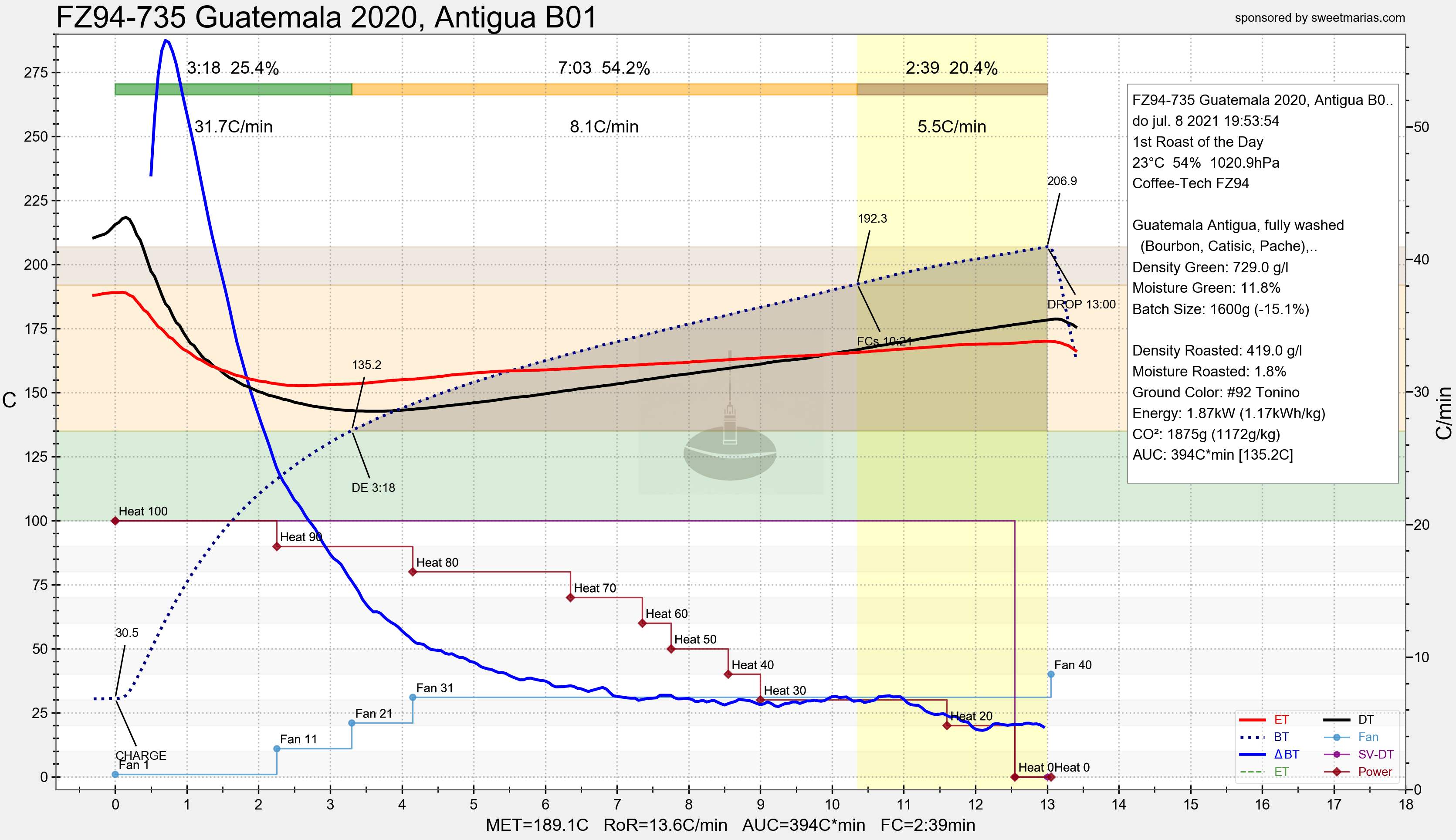 Nog even terug gekeken naar het profiel. FC kwam iets later dan gewoonlijk en ik liet de ontwikkeling 20s korter duren dan gewoonlijk hetgeen de lichtere smaak mede verklaart. De nieuwe Artisan laat ook zien hoeveel energie in kWh de branding kostte en wat ik aan CO2 uitstoot ermee "op mijn geweten heb" ;-)