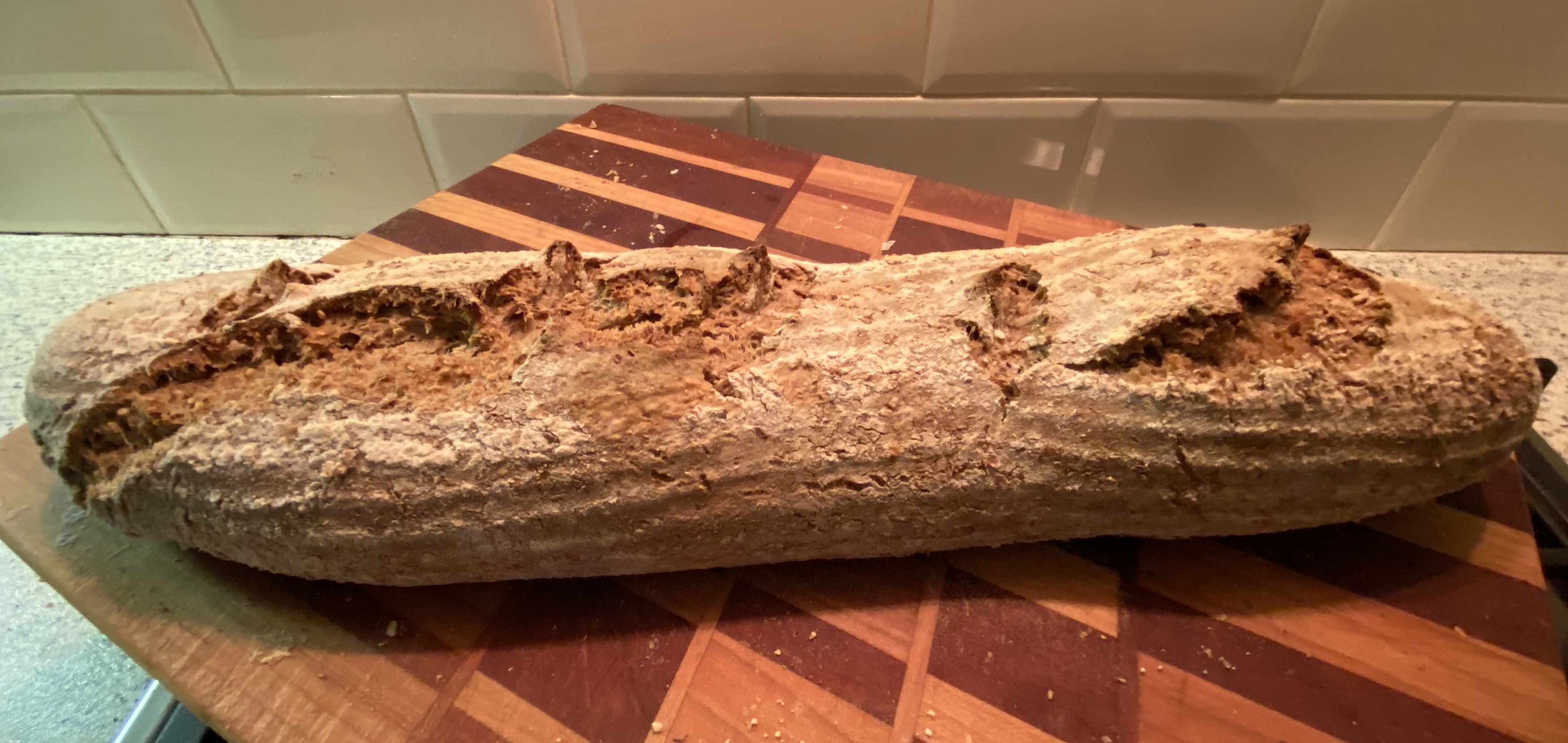 Dankje! Ik doe er heel weinig aan. Als alles gemixt is en een uurtje of twee uurtjes heeft kunnen rusten, smeer ik wat olie op het aanrecht, schep het deeg vanuit de kom op het aanrecht, rol het wat rond zodat het een bol is en dan heen en weer zodat het een langwerpige vorm krijgt, ik houd het mandje erbij zodat ik zie of het al lang genoeg is en rol het er dan zo in, dek het af met plastic folie en wacht tot het behoorlijk is gerezen. Gister ging ik het huis uit toen het eiglijk de oven in moest, heb het dus in de koelkast gelegd en later op de avond er weer uit gehaald, de oven aangestoken (dwz ingeschakeld), en na verloop van tijd toen ik de indruk kreeg dat het deeg weer wakker was, dit bestrooid met bloem, dan omgekieperd op een dun plankje dat Bobbee ooit voor me uitzaagde, wat knipjes erin en de oven ingeschoven op de metalen plaat (de pizza stenen had ik een poos geleden al weggegeven), na 35 min op 225ºC eruit.