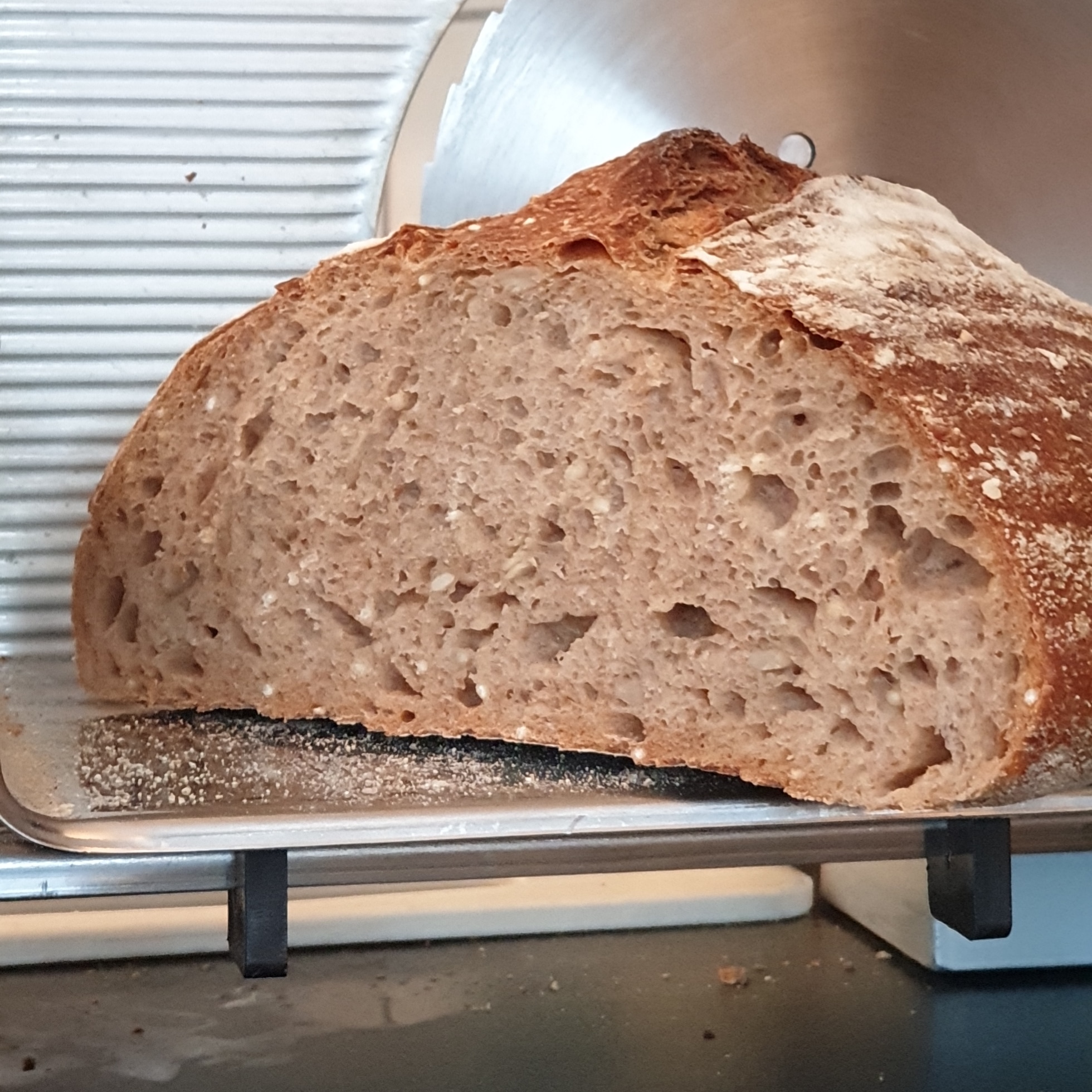 Deze vd week nog gemaakt. Met 50% versgemalen tarwe en iets van 10% versgemalen rogge, de rest goedkope bloem. Is 78% hydratatie.