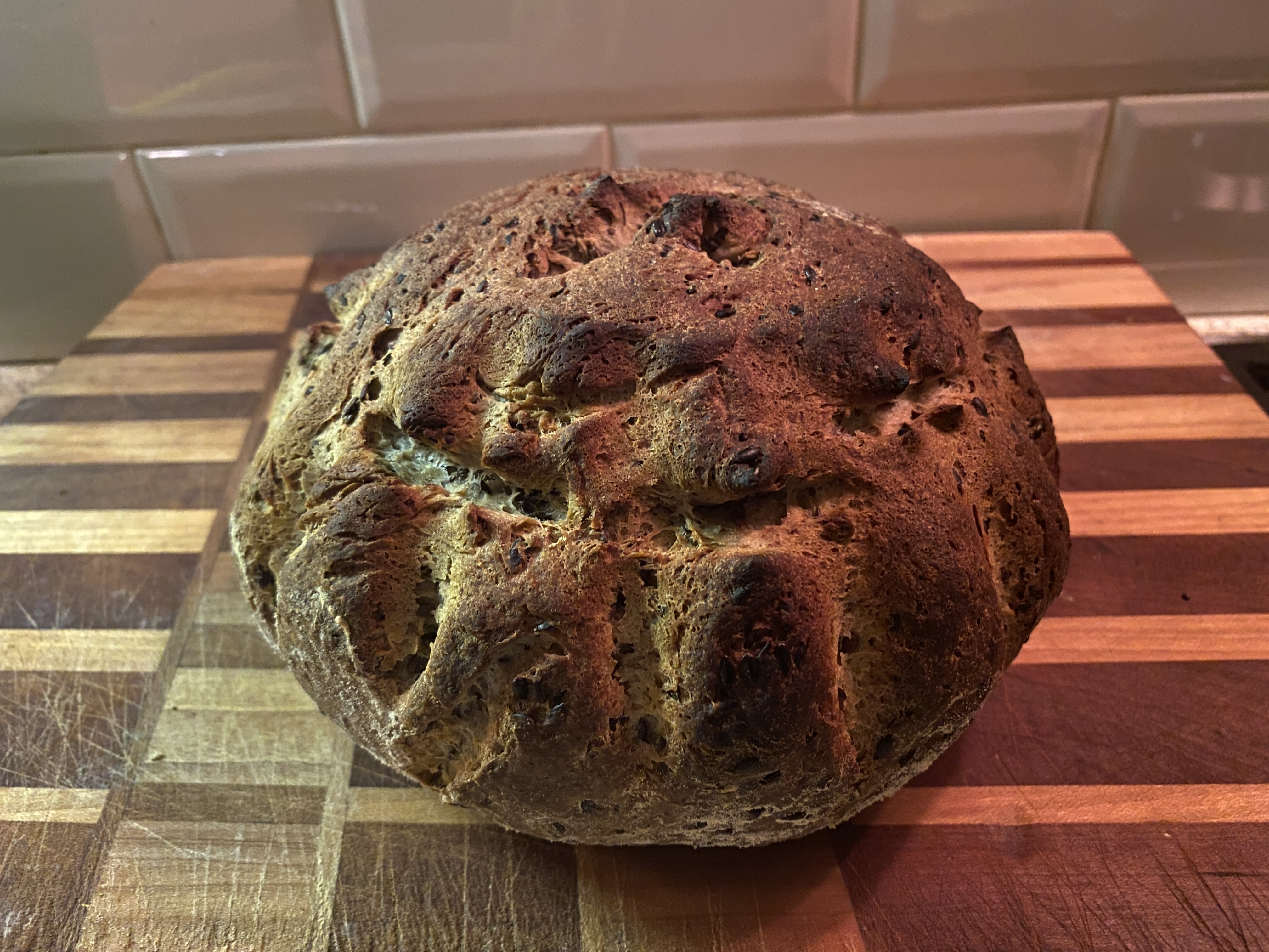 2604Lijnenzaad. Ik deed ditmaal de 210g water kokendheet uit de Londinium bij het zaad, zodat het zaad als het ware kon in- en voorweken. Toen het desem flink actief was, was het zaad een vochtige kluit geworden dus zat er weinig extra water bij om te kunnen kneden. Ik heb er bijna 20g extra water bijgedaan en daarna was het brood lekker actief in de rijs. Vannacht in het broodmandje in de koelkast laten slapen en vanochtend kalm laten opwarmen, daarna 40min in de oven.