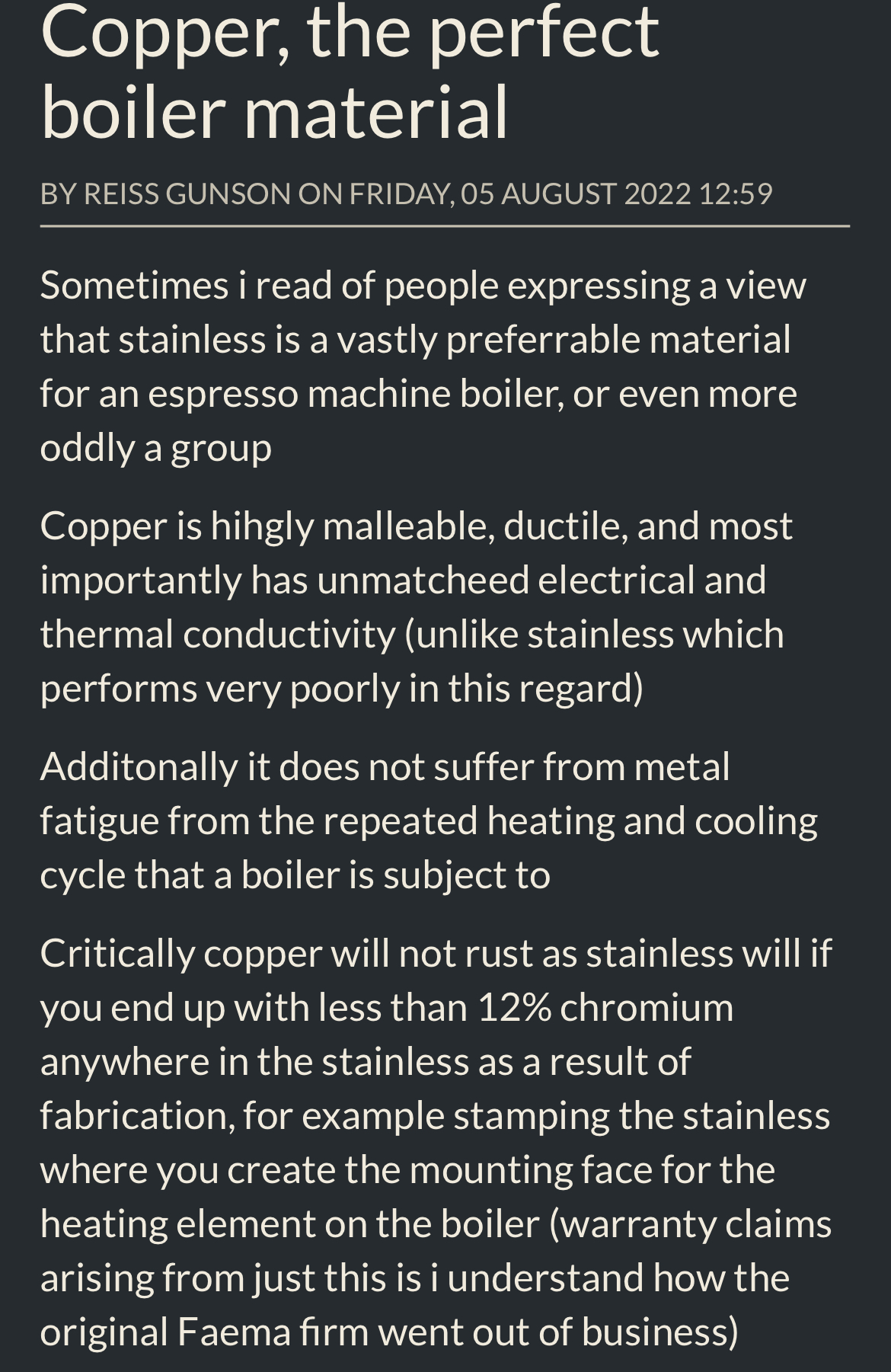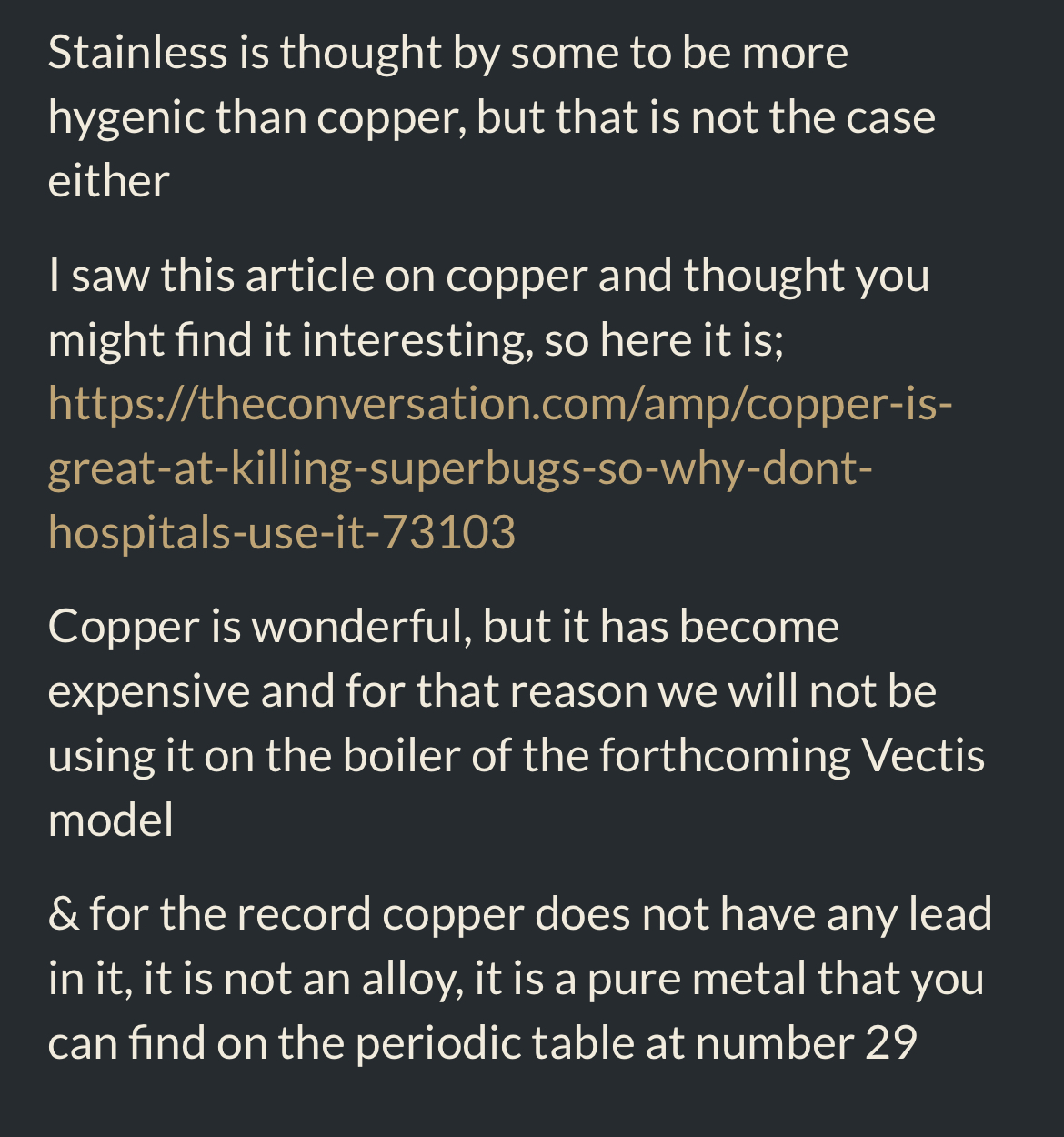 2785https://theconversation.com/copper-is-g ... e-it-73103gilleko B. schreef: wo 14 dec 2022, 09:32Ik kom helaas niet rechtstreeks in deze topic.fransg schreef:Pti schreef: vr 09 dec 2022, 11:13 Het RVS van toen rot gewoon door het is niet zo mooi als het prachtige 314 of 316 waar ze nu vaak boilers van maken. Daarnaast hebben de machines met rvs boilers veel minder gangbare leidingen, dus als de boiler of een van de leidingen wordt afgekeurd voor revisie heb je gelijk een grote uitdaging (lees kostenpost).
