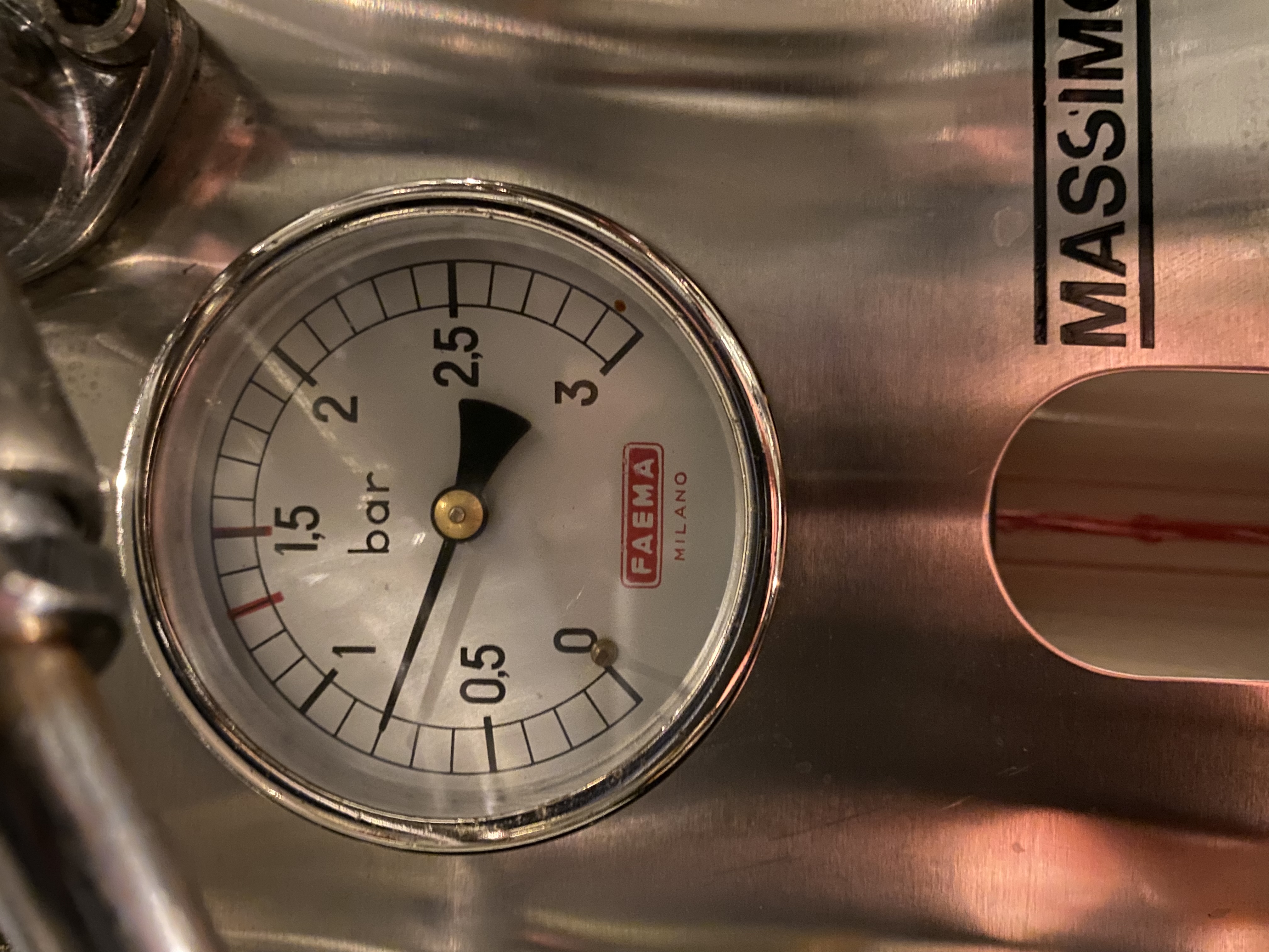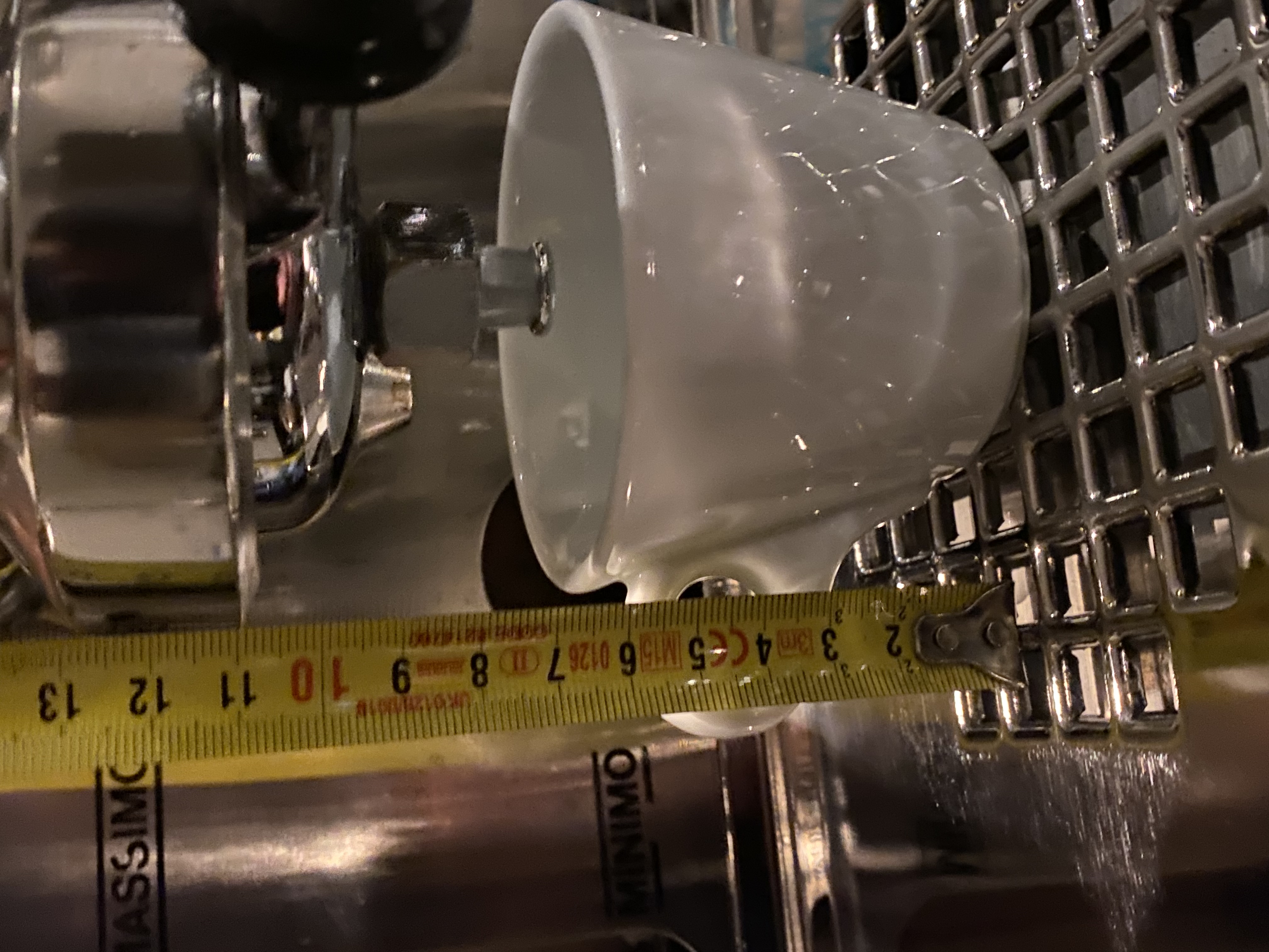 Met uitloop portafilter met rechte uitloop (origineel faema jaren 60) gaat het echt precies, kopje schuift zonder aanraken op een haar ruimteh eronder