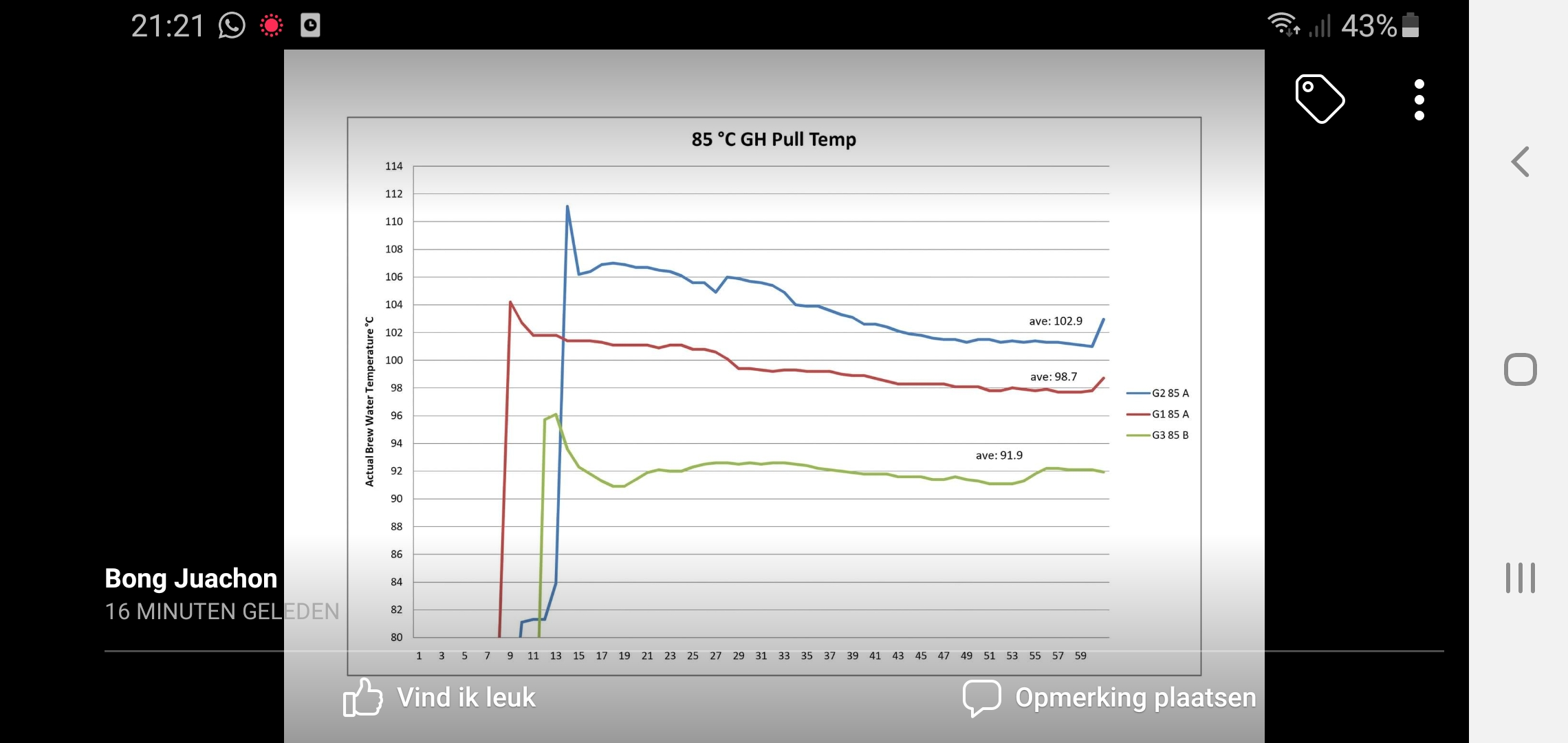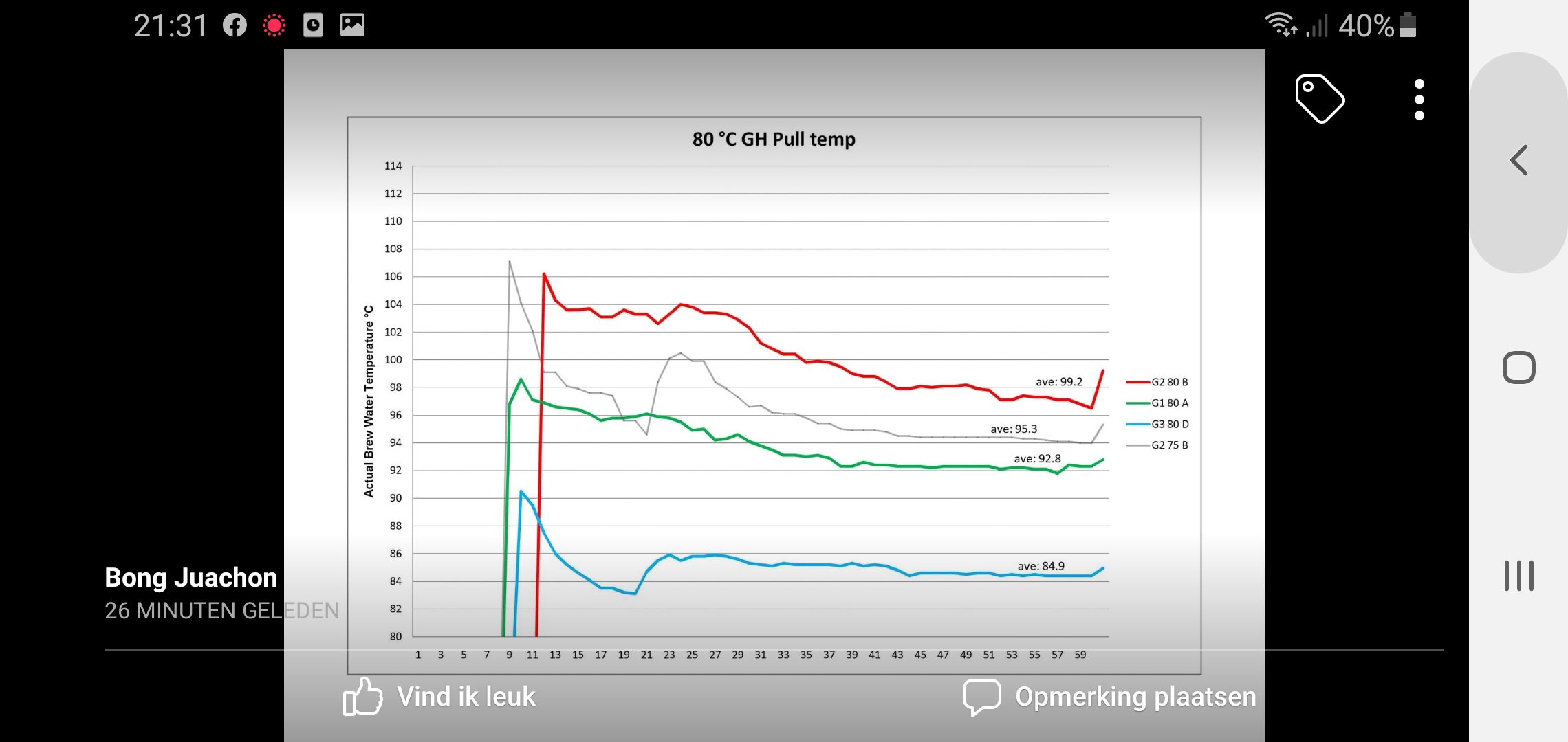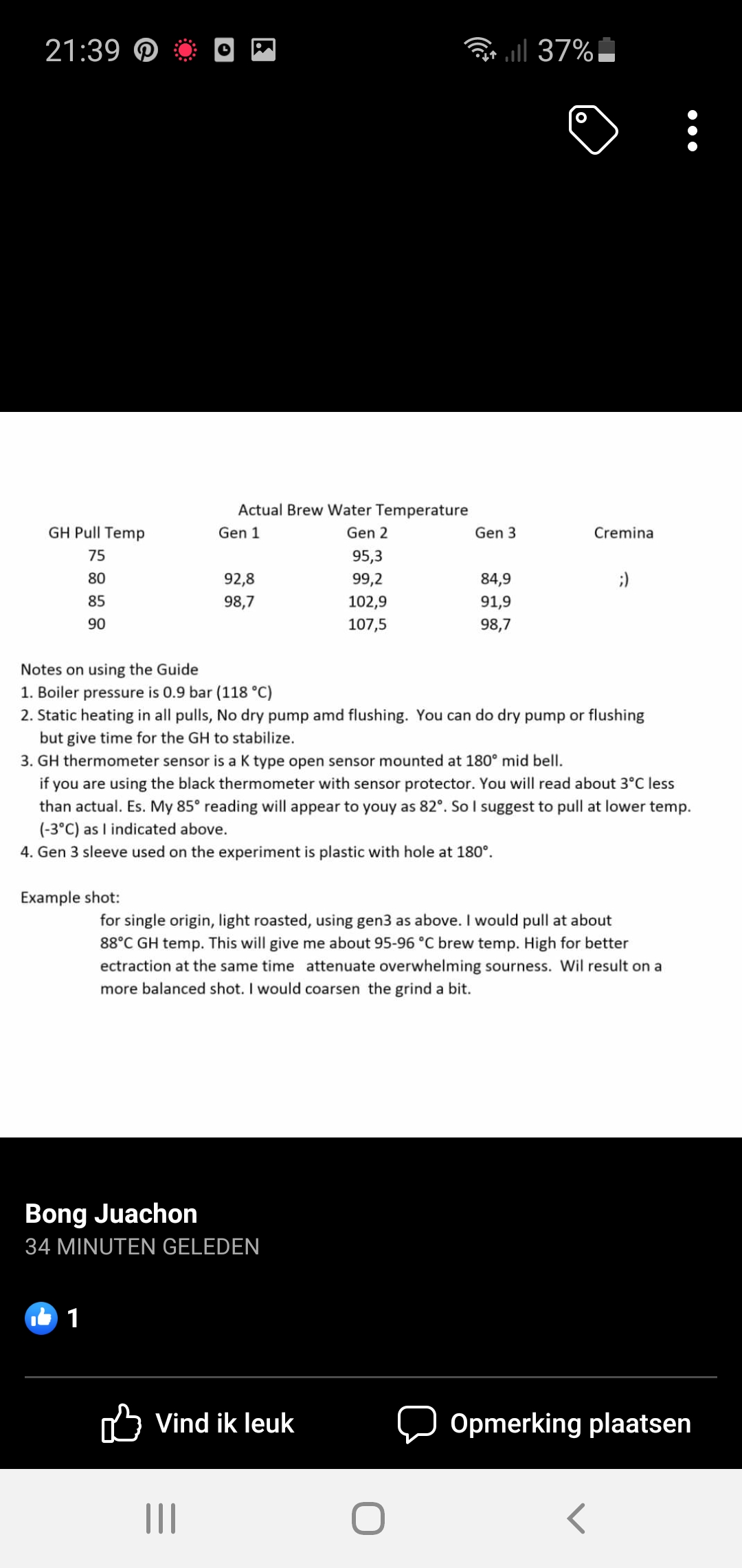 Overigens zijn er net op de Pavoni owner's facebook groep door Bong mooie resultaten gepubliceerd over de relate tussen de groep- en extractietemperatuur: