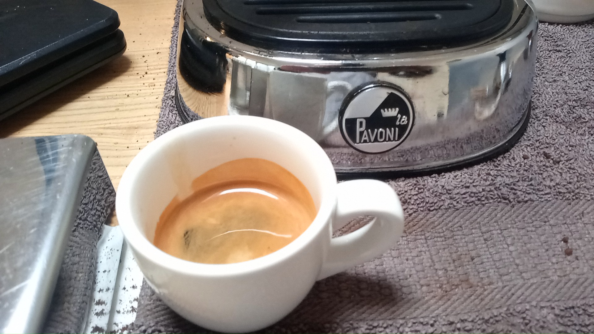 Doorlooptijd was rond de 40 - 45 seconden, te lang dus. Hoeveelheid koffie: 28 gram. De smaak was wat vlakker, dunner dan op de Pavoni. De cremalaag ook nu een lichte dunne laag.