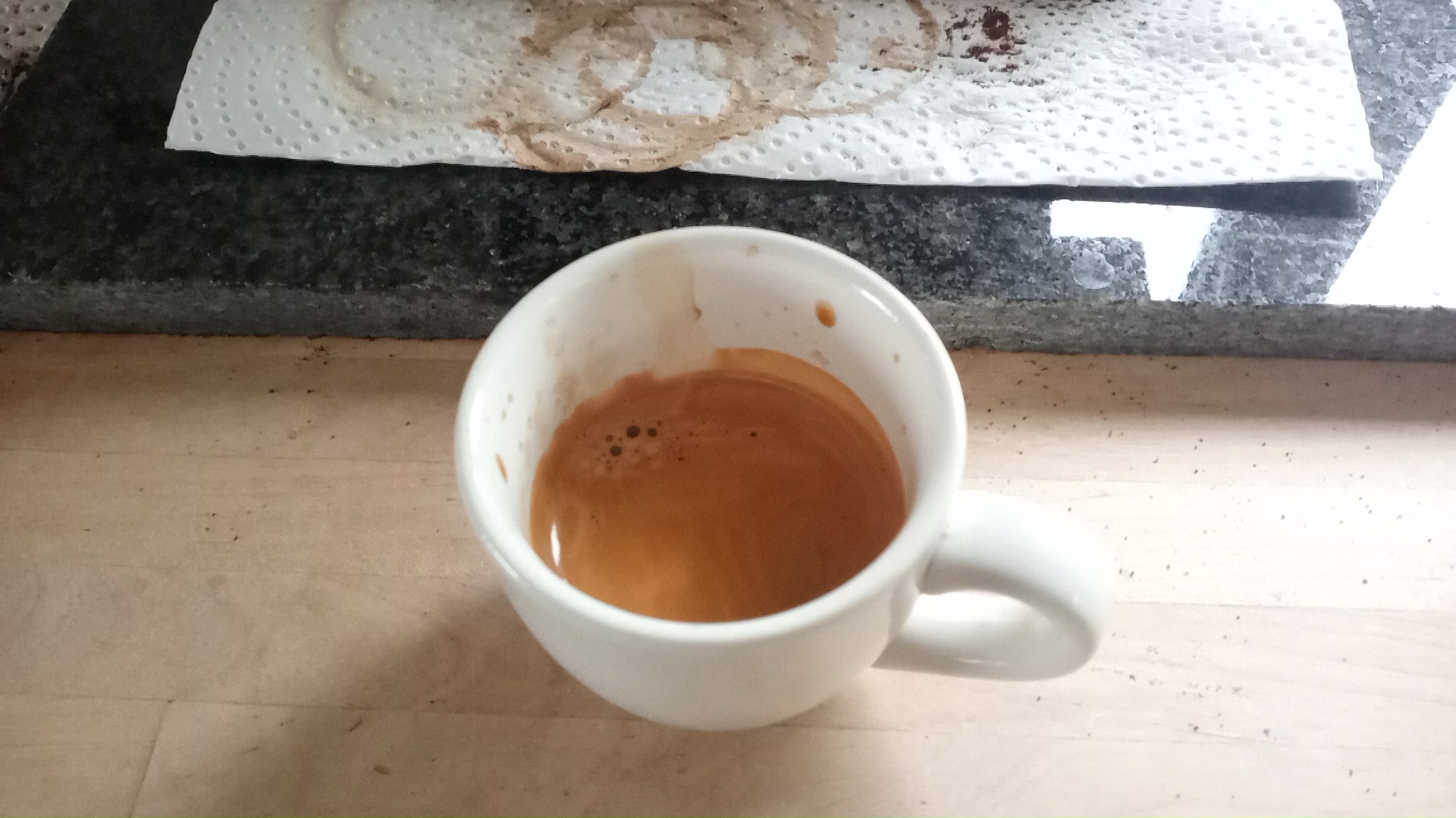 En vanmorgen een No 42 Sumatra Giling Basah espresso gezet met de QuickMill. Enkel bakje. Dat werd 11 gram, zelfde maling als gisteren, dus redelijk fijn.