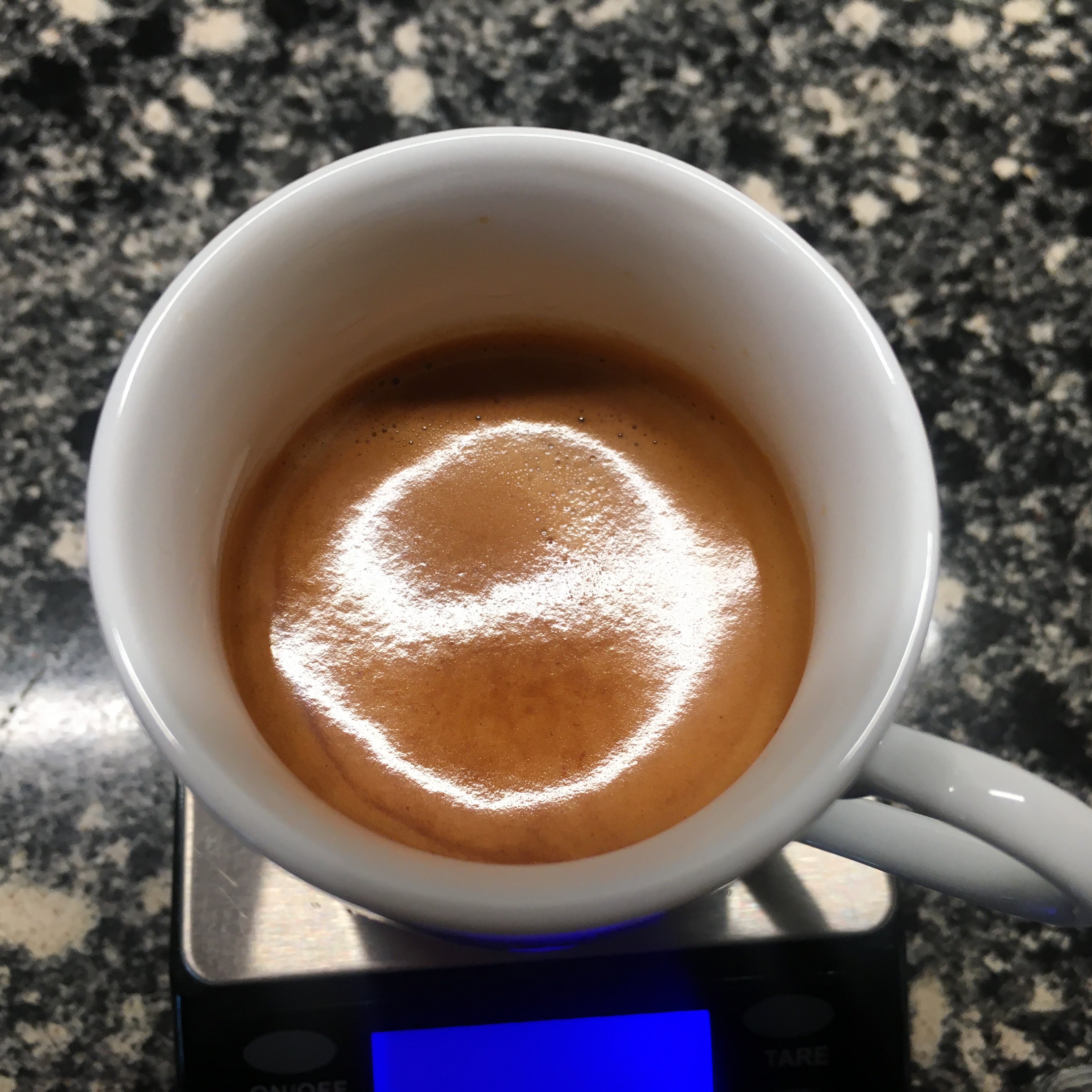 Dank voor je tip Guido, ga ik uitproberen. De pressure kit, de temperatuur meter en de RVS zuiger bekleding (sleeuwe jacket, Coffee Sensor) bij mij werken erg goed. Geeft meer inzicht. Als de broeikop zo'n 70 graden is, start ik met de extractie. Ik denk dat de temperatuur van het extractie water dan op ca. 85 graden zit (in boiler 100 graden, kop 70 graden, extractie water daar tussenin). Is dat een redenering die hout snijdt? Ik weet dat Tudor van CoffeeSensor zorgt dat de kop op 83-86 graden blijft, dat is voor de meeste bonen de goede zettemperatuur, maar ik vind het extractie water/ de koffie dan te heet. Geëxperimenteerd met 14-18 gram koffie in een heel fijne maling (2/3e op de Mignon XL maler). Gewoon 30 ml water en 25 sec doorlooptijd. Haal dan 9 bar, veel kracht nodig, hou het apparaat bijna niet rechtop, maar goed dat de nieuwe hefboom van RVS is ... Maar: geweldige koffie, veel meer smaak, hazelnoot kleurige crema. En gek genoeg geen 'sterke' smaak maar een heel intense zachte smaak, bij gebruik van dezelfde redelijk verse bonen (Espresso blend van Brander1, EkoPlaza, vier maanden geleden gebrand). Zie de foto.