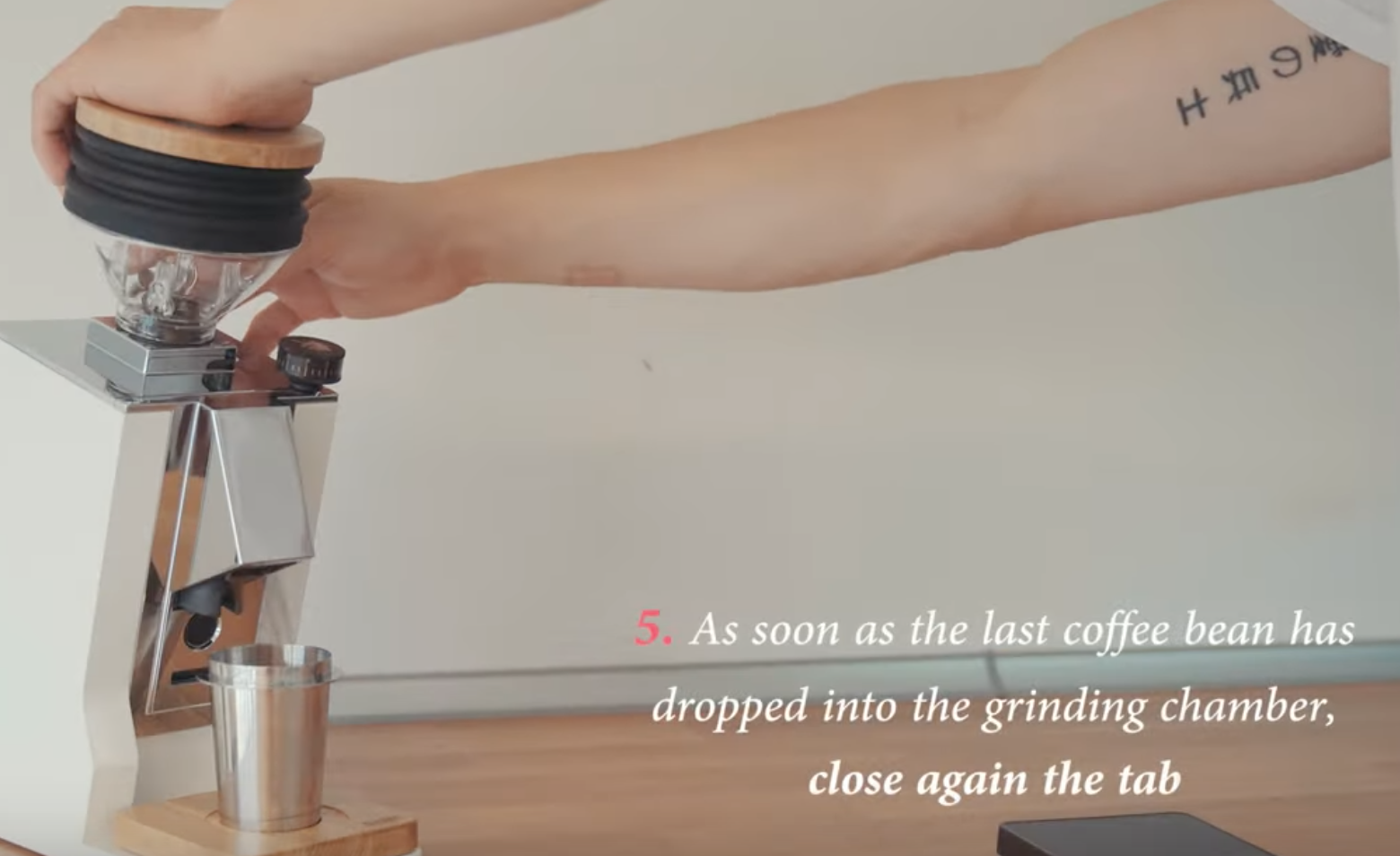 Je kunt de bonen erin gooien, de maler aanzetten en dan pas de schuif open zetten zodat de maalschijven al volop in beweging zijn maar dat vind ik onnodig gedoe om niks. Dat doe je als je denkt dat de motor misschien te zwak is om op gang te komen met boontjes tussen de kaken.