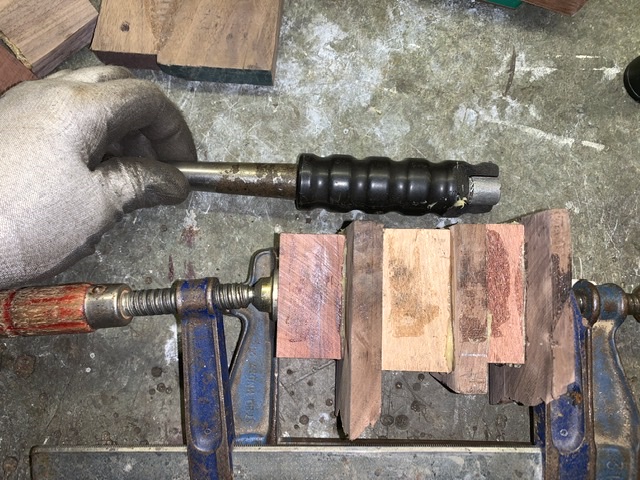 Het bakeliet van de hendel is stuk. Een nieuwe is verkrijgbaar, maar ik heb nog wat leuke blokjes verschillende soorten hout over.