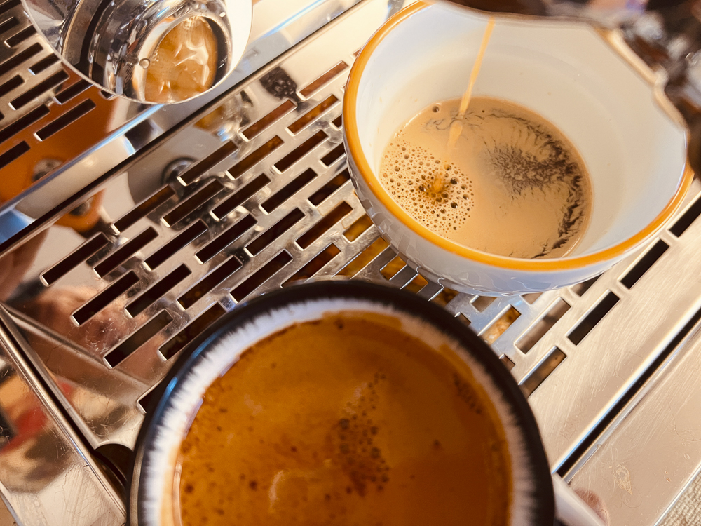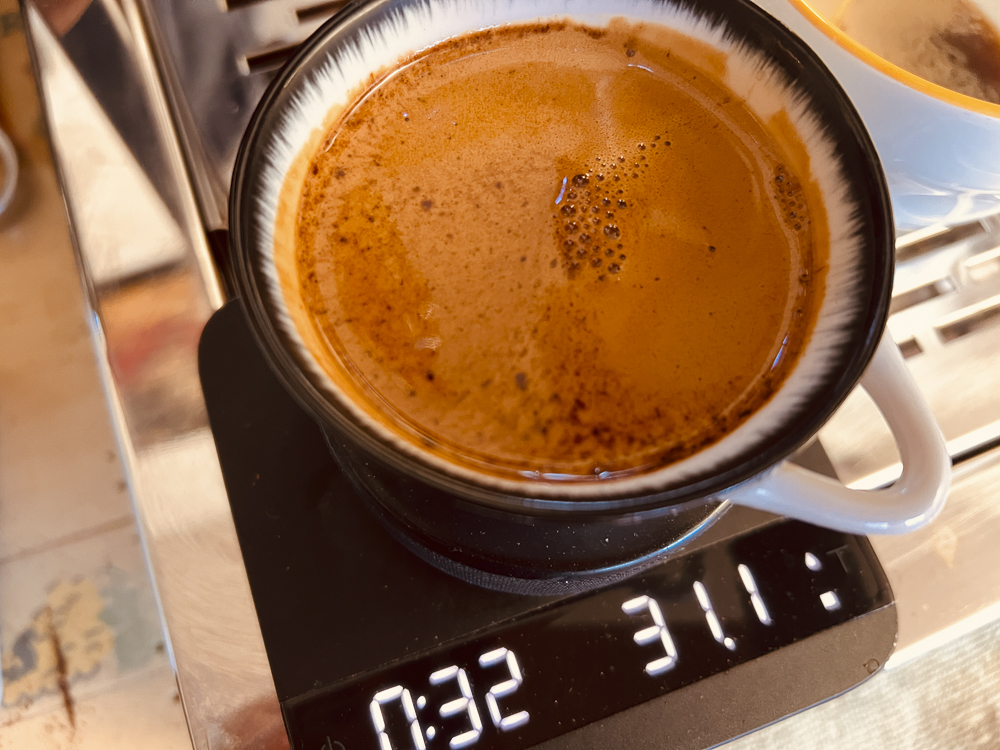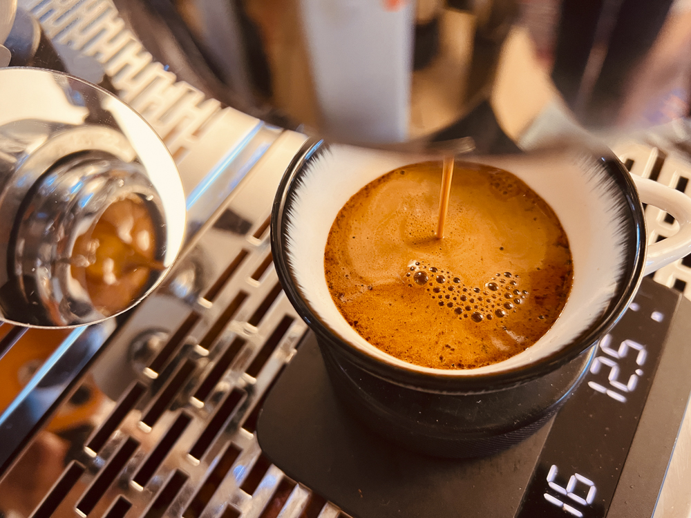 Dan zodra de bodem van het filterbakje vol droppels hangt doorschuiven naar 5 bar en de hefboom omhoog zodat een ferme extractie: