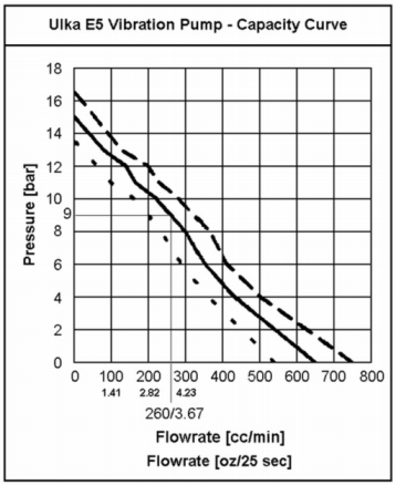 De strega pompt de cilinder vol met z'n Ulka pompje. Die heeft een bepaalde flow afhankelijk van de tegendruk, zie grafiek.