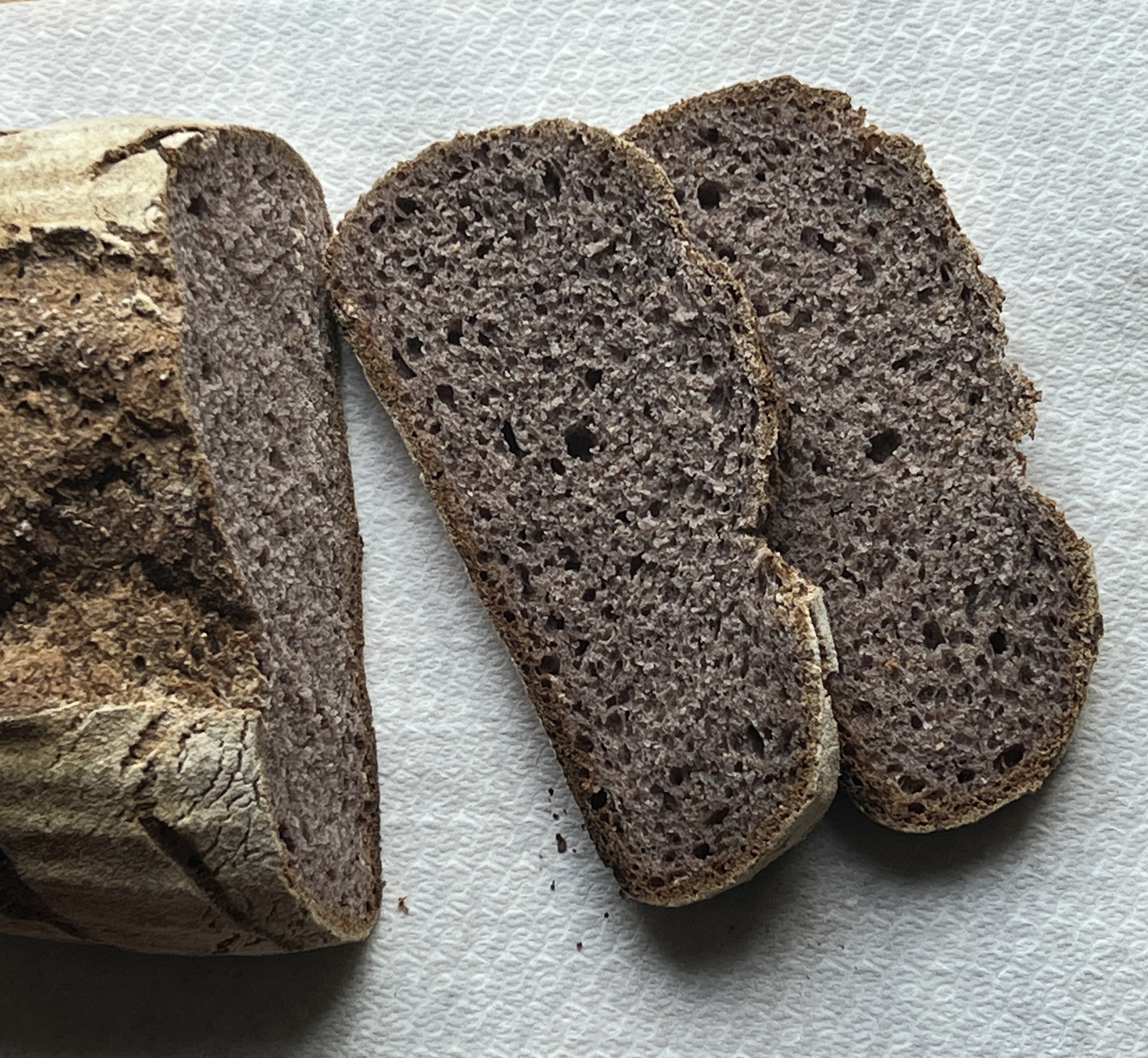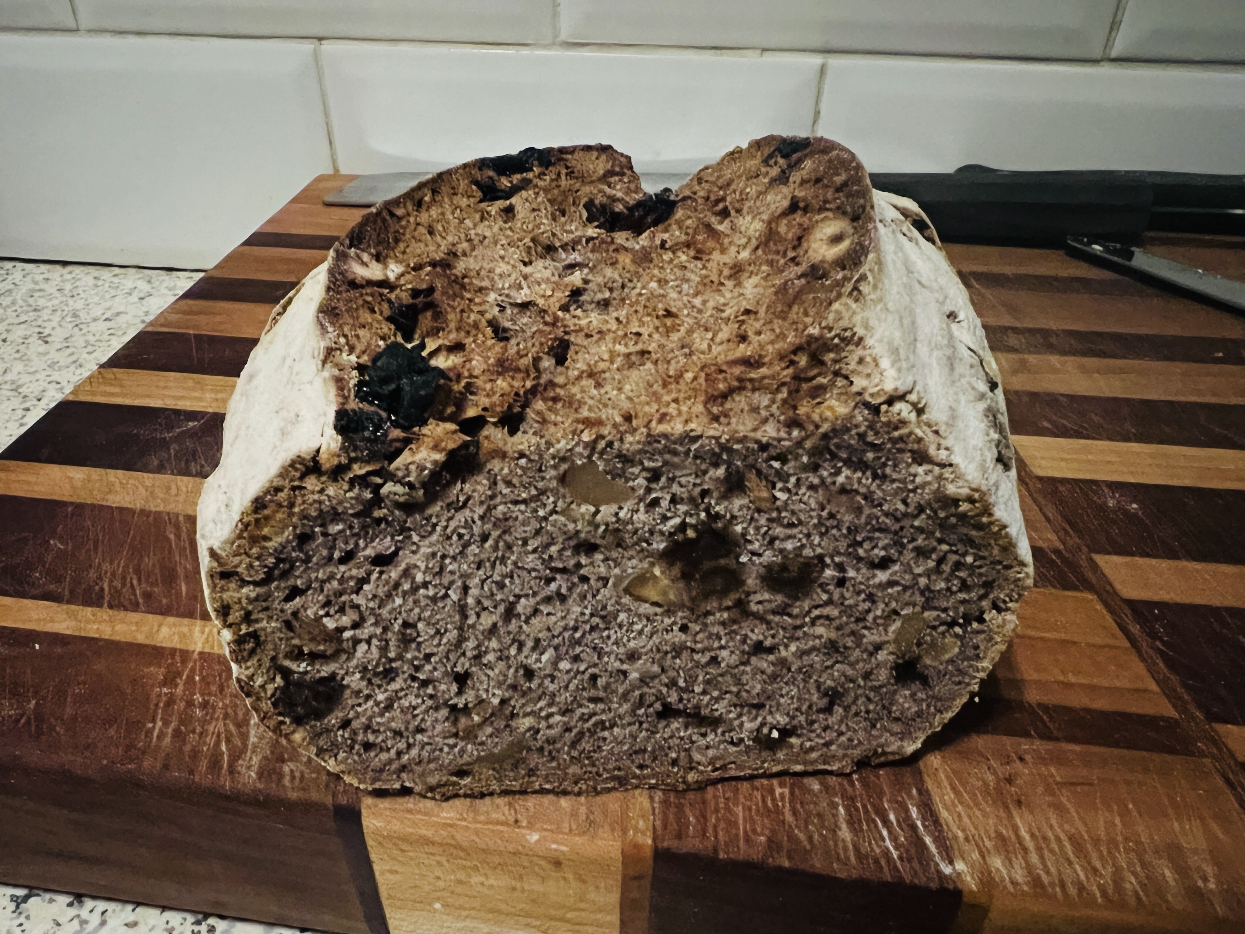 Desem kwam raar uit de koelkast, vorige keer te weinig meel of teveel water bij gedaan dus wat geïmproviseerd met de hoeveelheden rijstemeel rogge en bloem, rozijnen en noten erbij.