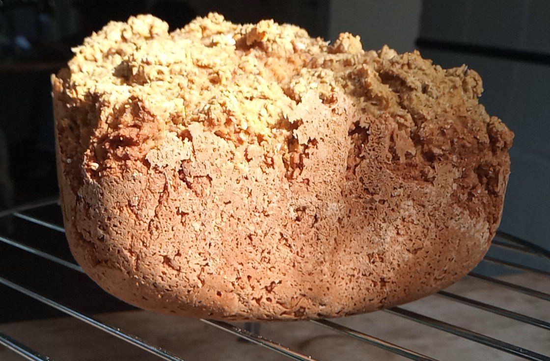 5891En vandaag weer een sodabrood gemaakt. Niet helemaal gelukt dit keer. Ik denk dat dat komt omdat ik nu minder vocht heb gebruikt. Normaal stop ik er 250 cc karnemelk en 300 cc water, nu 250 gram karnemelk en 150 gram water. Er ging minder water omdat de midden-binnen-bovenkant van het brood altijd wat klef bleef. Om uit te proberen.... Niet meer doen.