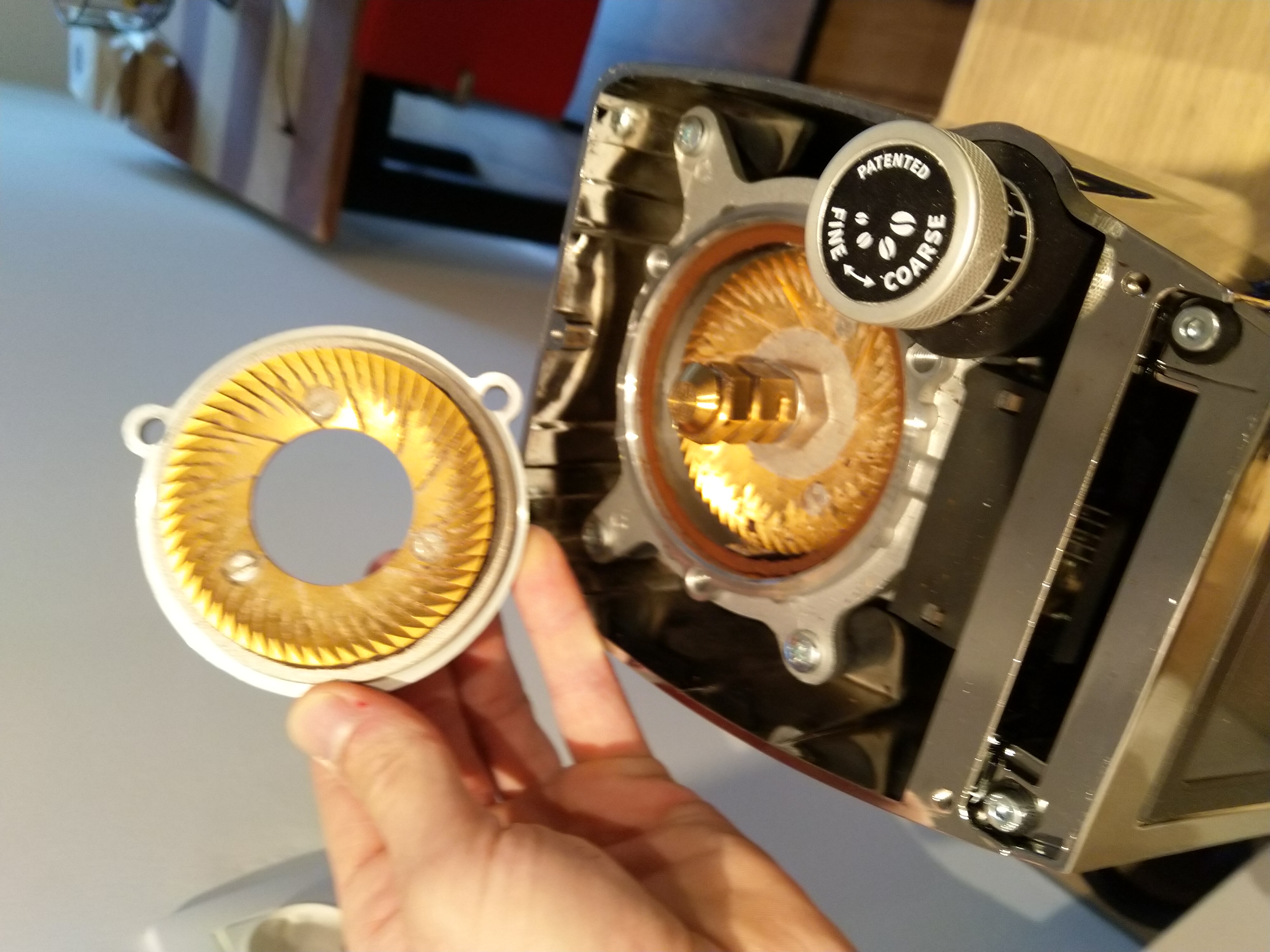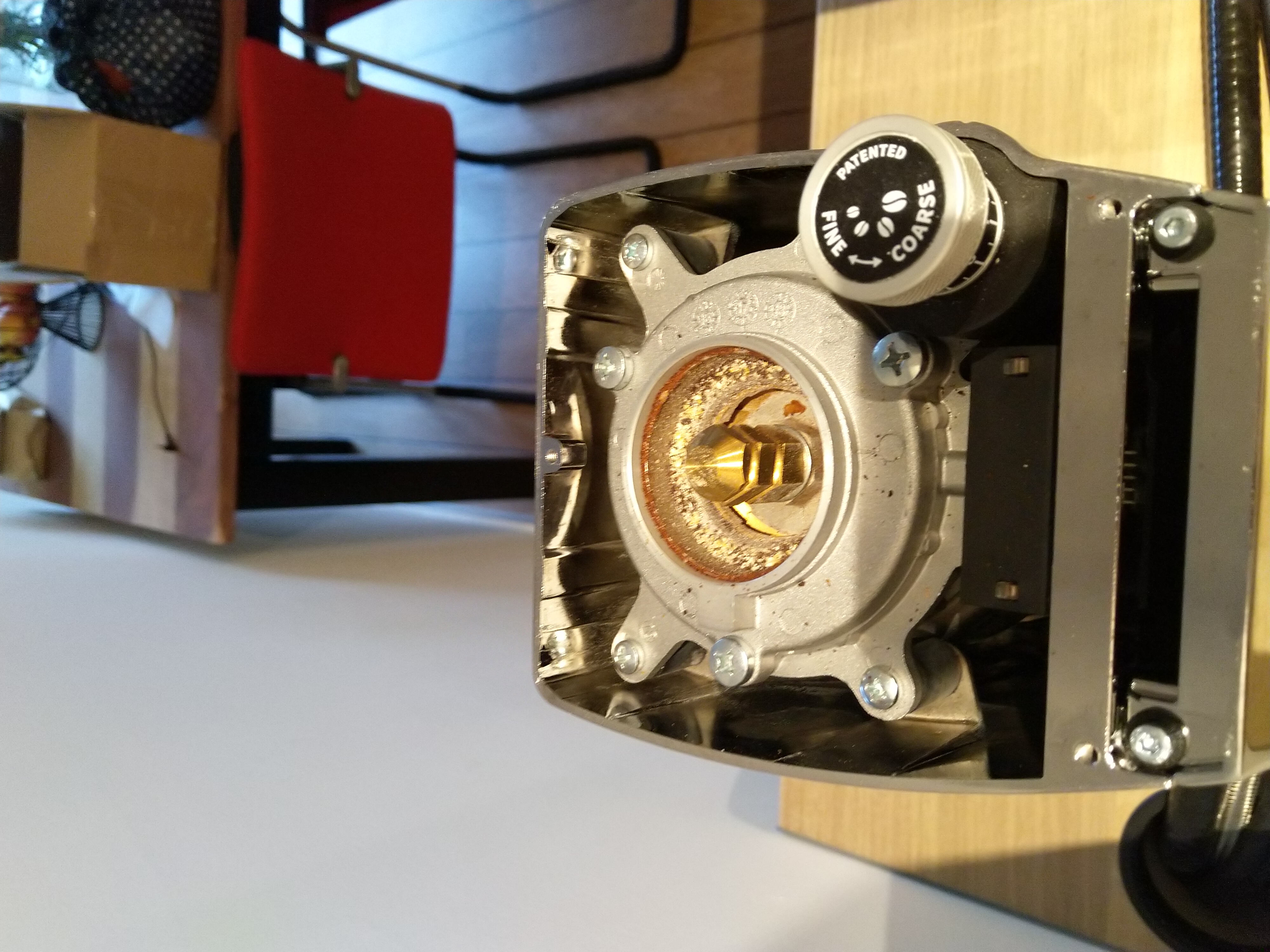 62Vandaag na twee maanden dagelijks gebruik, ik denk een kleine 8 kg koffie, heb ik de molen open gemaakt voor een schoonmaak.