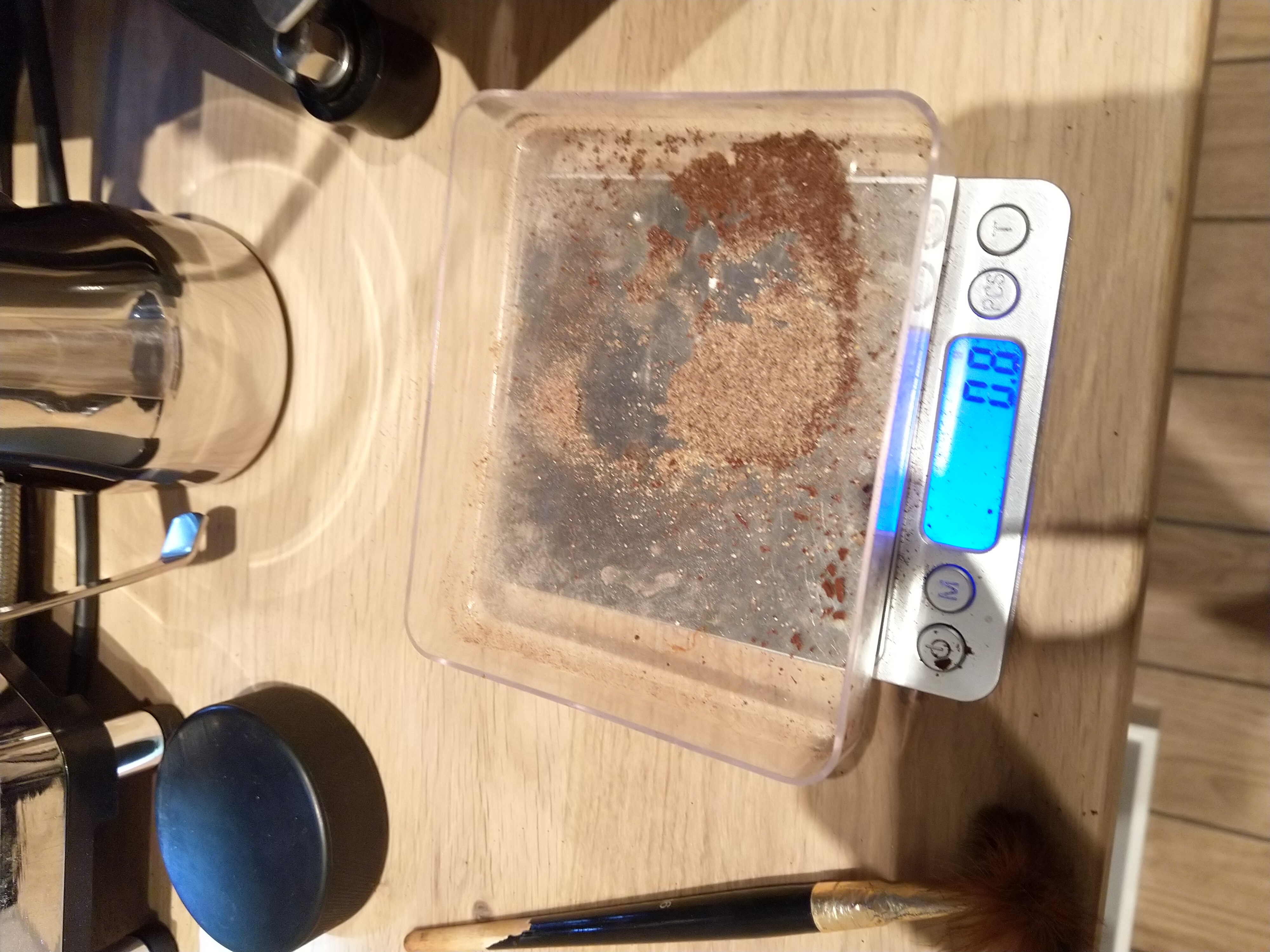 Dit is alles wat ik uit de kamer en schijven en kunnen vegen. Ik weet zeker dat er nog ca een half tot een hele gram tussen de clumpcrusher en de maalkamer zit maar die maal ik er straks met het eerste shot gemakkelijk uit.