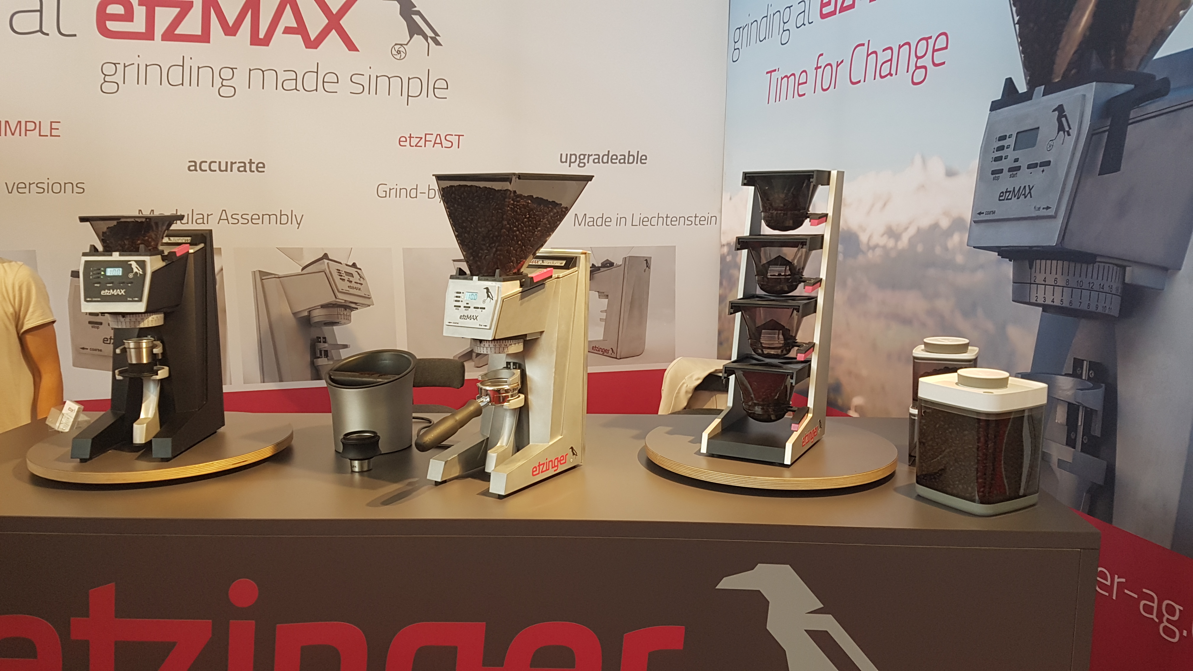 Ook gezellig met de sympathieke mensen van Etzinger gepraat. Ze hadden een 'light' en een 'medium' staan. De light met kunstof behuizing en timer wordt een stuk betaalbaarder dan gedacht, 1050 euro aldus Cristian Etzinger. De versie met gewicht slechts iets duurder (dat verstond ik helaas niet helemaal goed). De medium met gewichtsfunctie en alluminium behuizing wordt 2.000 euro. Beide machines waren ook veel stiller dan de Baratza Sette waarvoor Etzinger het loopwerk ontworpen heeft o.a. door een ander type loopwerk. De light klonk wel iets meer als de Sette. De medium echt als een grote metalen maler. Voor de medium wordt nog gewerkt aan een meer high end aan paneel aan de voorkant met metalen knoppen waarvan er al een mockup stond. Ook heeft men een leuk systeem ontwikkeld om snel van hopper te kunnen wisselen en daarvoor een speciaal rek voor meerdere hopper incl. een single dose accessoire ontwikkeld. Leuk detail: de hoppers kunnen op de hendel met krijt beschreven worden om ze uit elkaar te houden.
