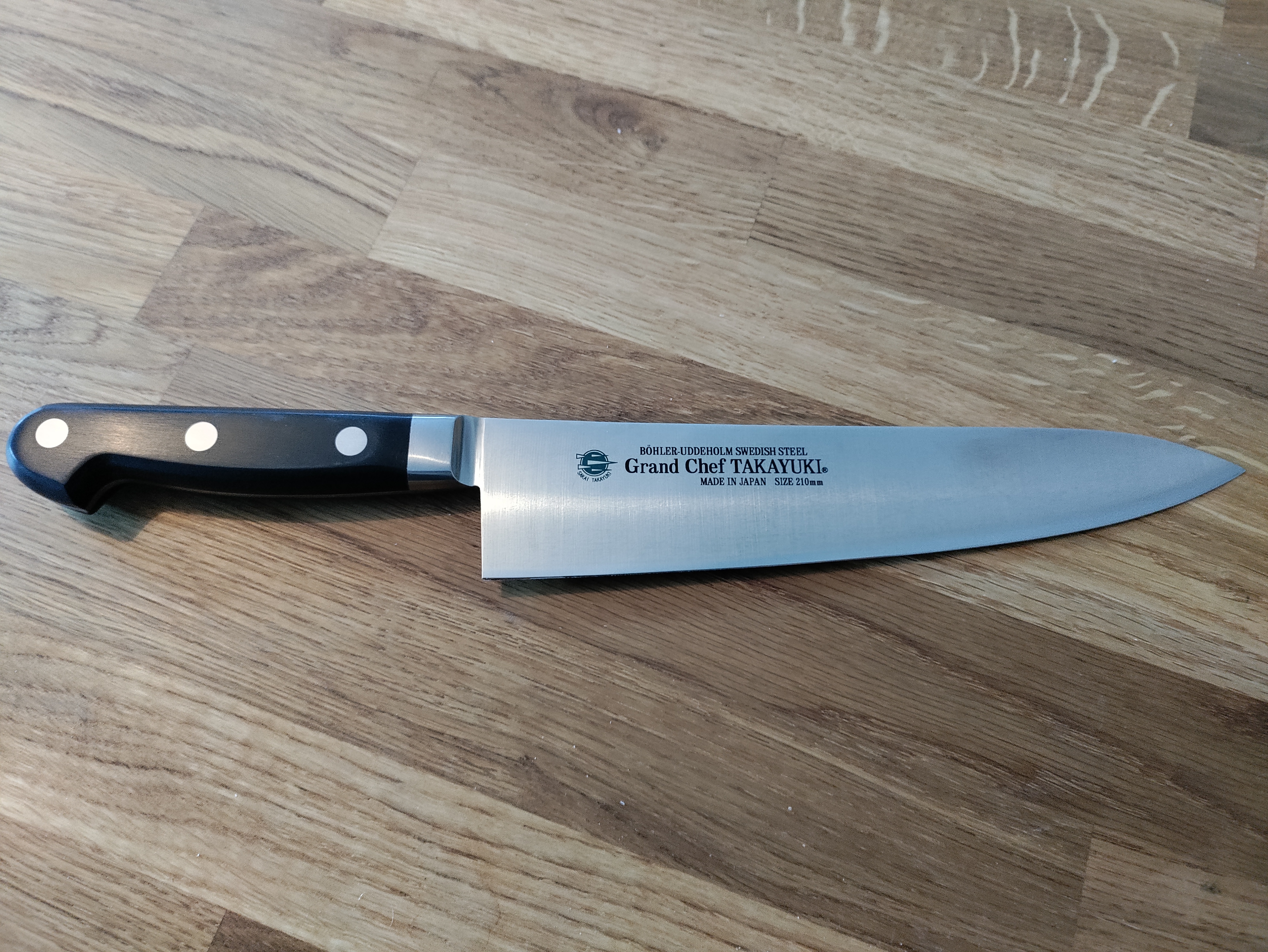Eventueel mag er van mij wel eentje weg (met zwarte handvat). De zwarte 21cm Gyuto, een Sakai Takayuki van Zweeds AEB-L staal. Dit mes zit qua gebruik een beetje tussen de Global en Japanse SG-2 messen in, in de zin dat hij niet extreem dun of scherp is, maar vooral erg sterk en lang zijn scherpte behoudt en relatief makkelijk te slijpen is. Het staat daarom ook wel bekend als een luxe horeca mes.