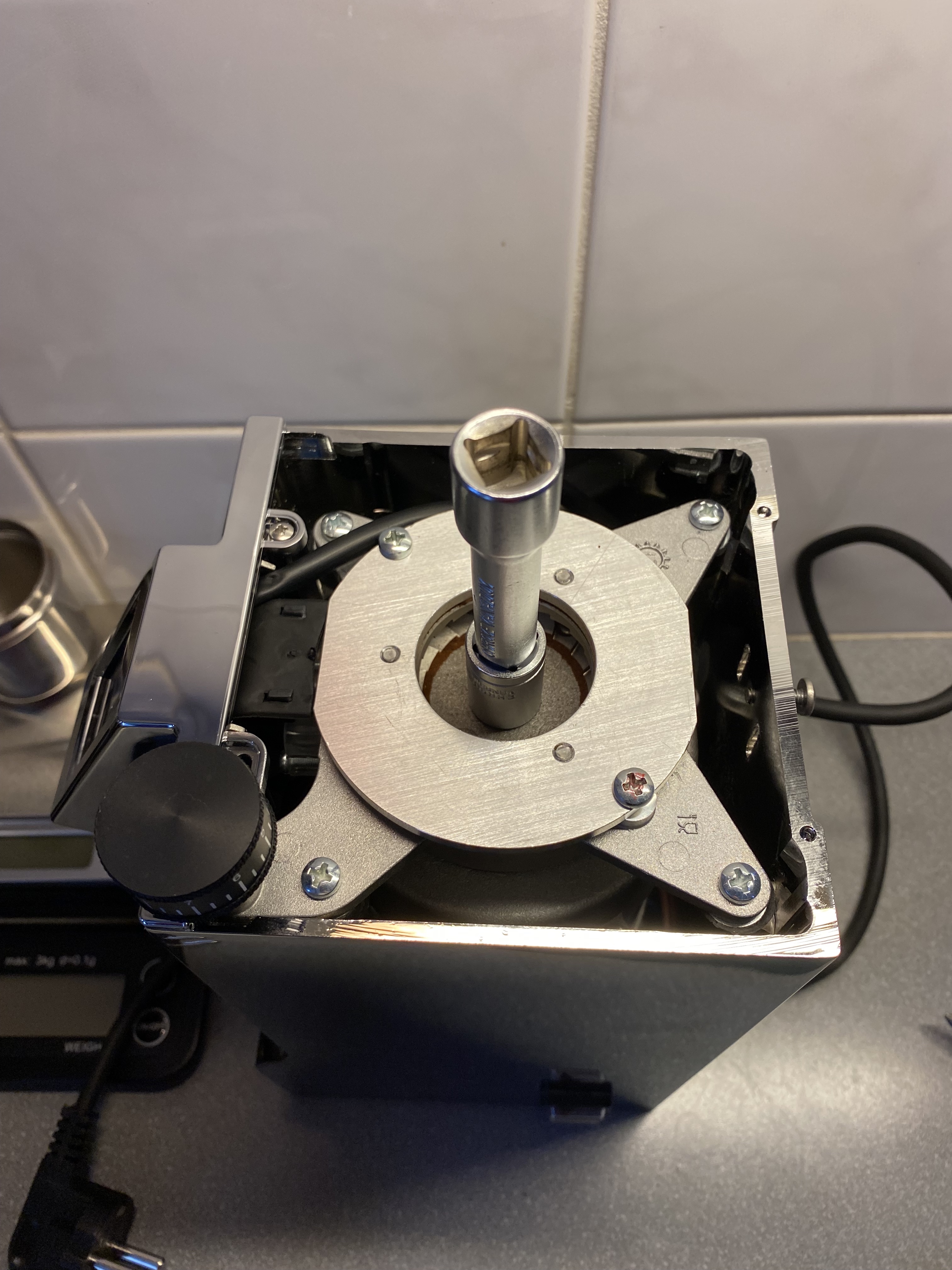 - plaats de verlengde dopsleutel op de moer van de onderste maalschijf
