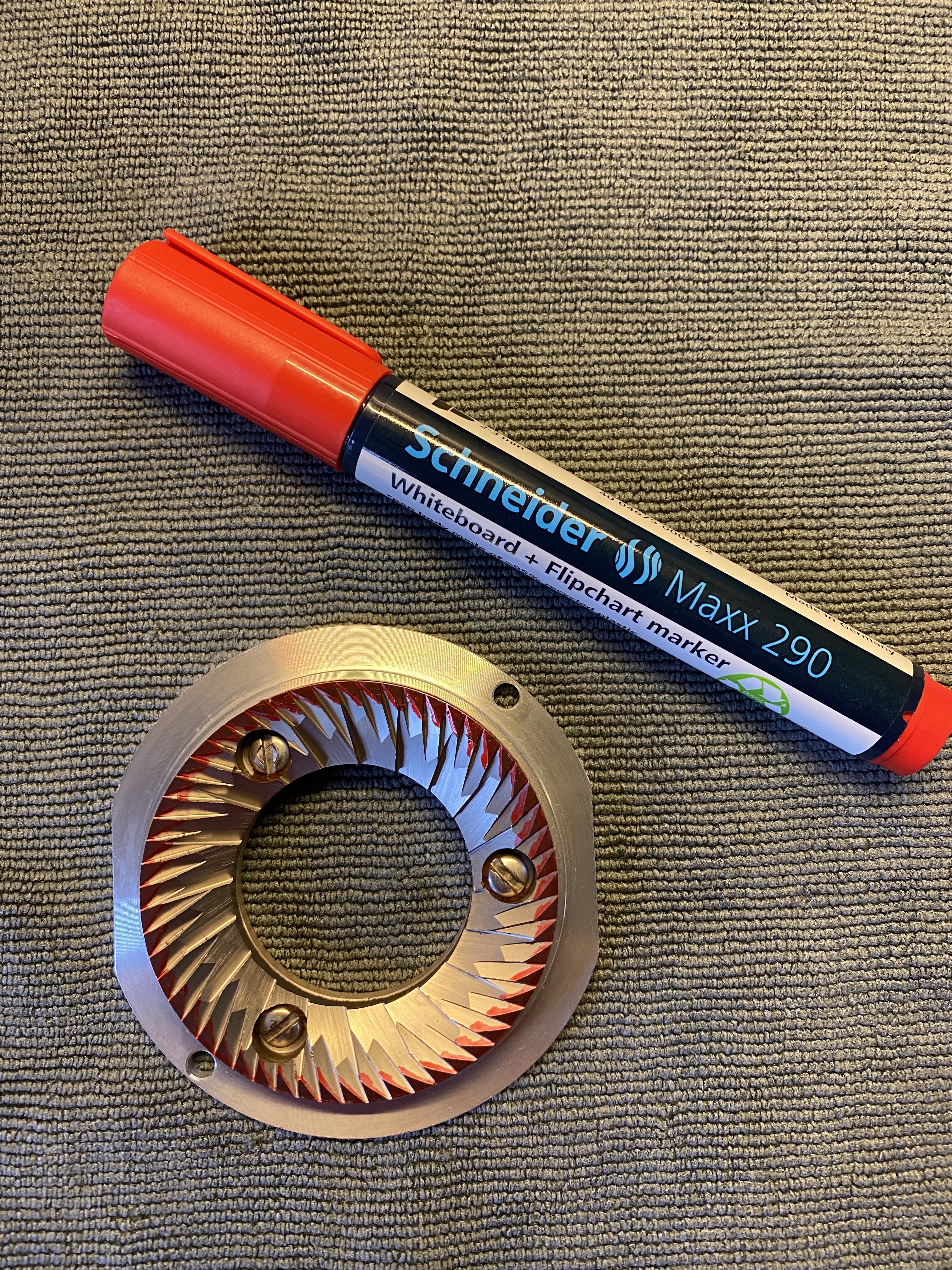 Verder is het vrij simpel. Na een rondje of 10-20 check je het punt dat de ene schijf aanloopt tegen de ander en waar de verf afslijt, staat deze te hoog en wil je dus de nog gekleurde kant(en) ophogen. Doe dit in stapjes en breng de stift opnieuw aan en je zult zien dat een steeds groter deel van de stift afslijt tot het punt dat de kleur rondom verdwenen is. Als ongeveer 85-95% van de stift weg is, kun je er vanuit gaan dat het goed is (100% lukt bijna niet, dan blijf je bezig). Herhaal het proces bij de andere schijf.