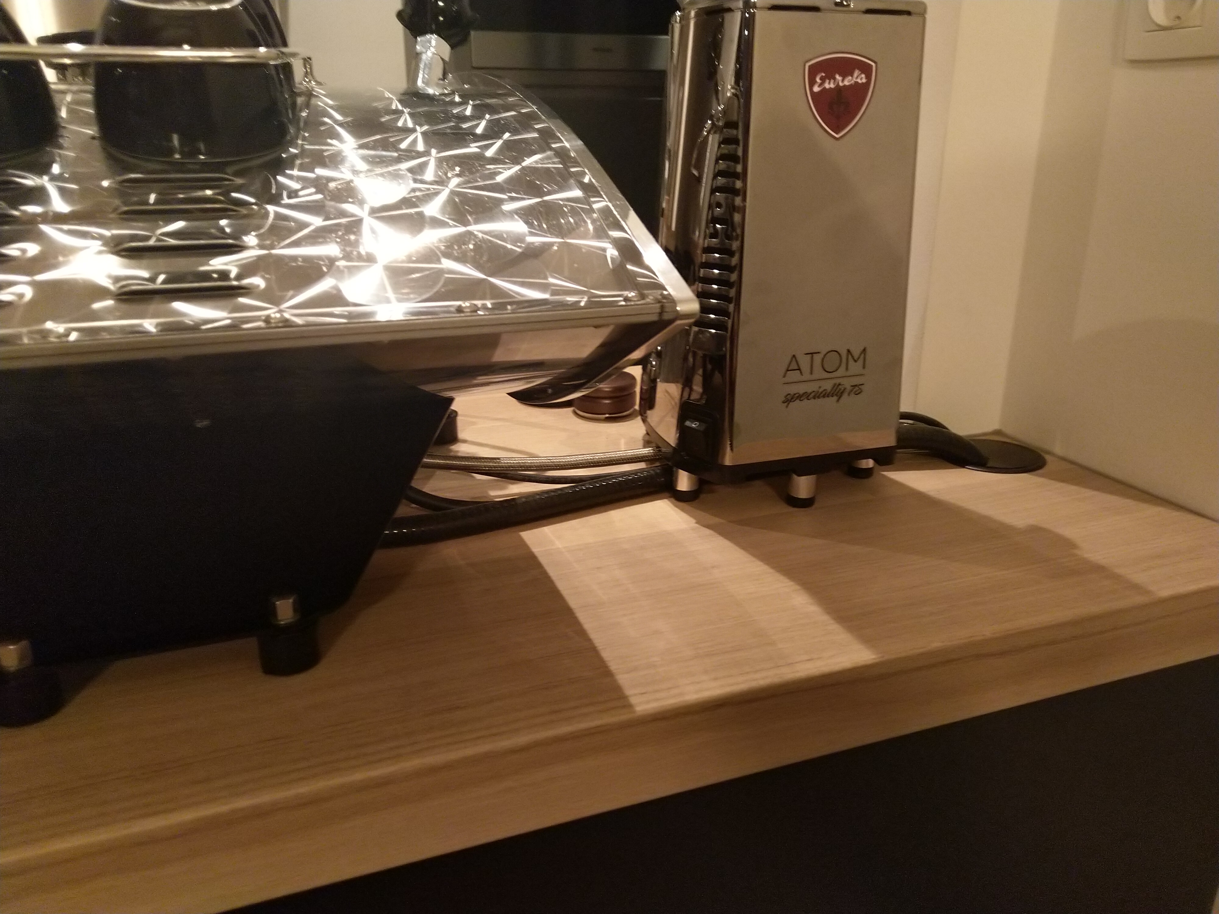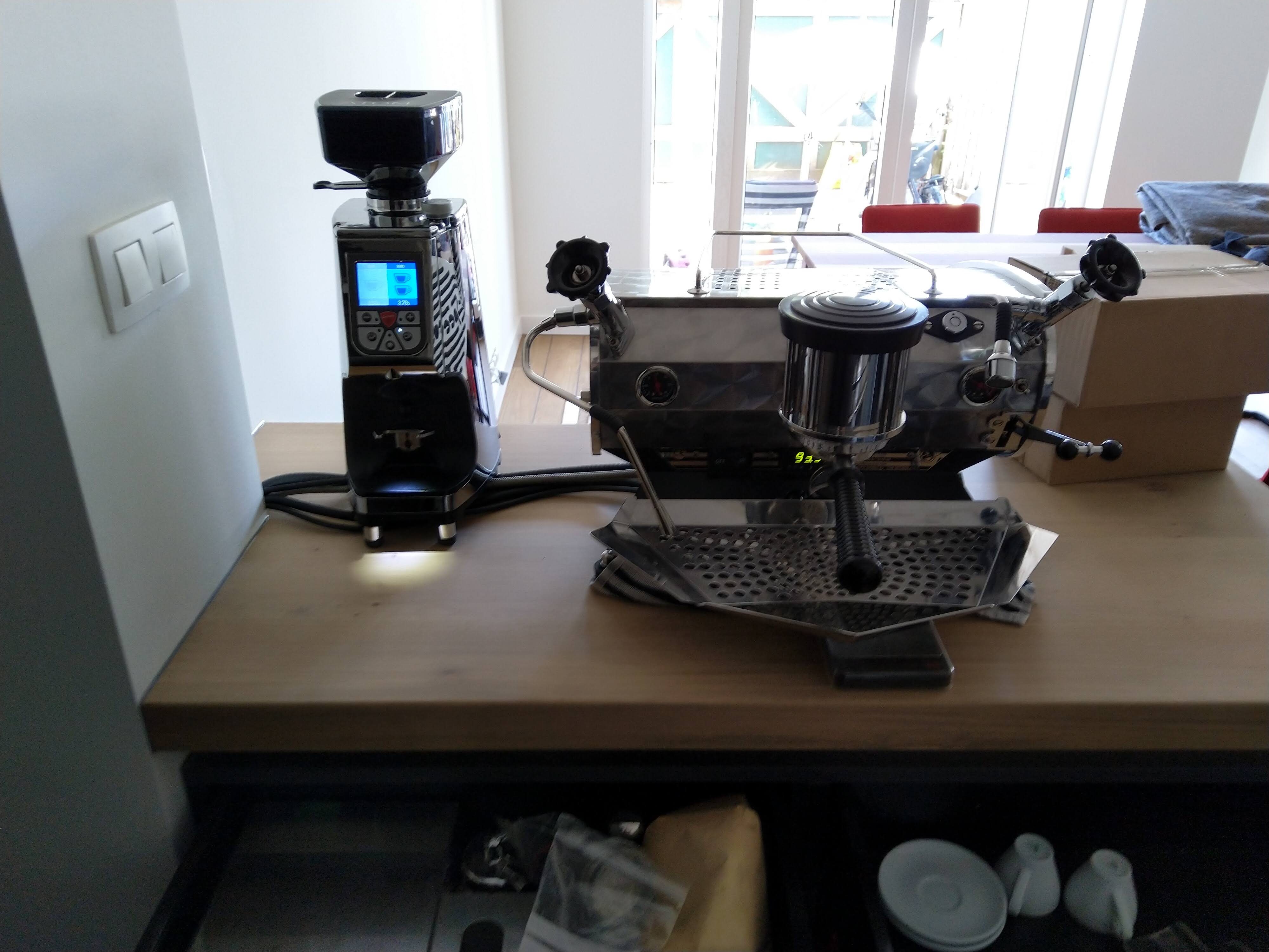 Ik zou hem in jouw geval denk ik ook niet naast de wasbak zetten. Uiteindelijk ben je met de maler, kannetjes, weegschaaltje, kwastje, etc best veel ruimte kwijt en zou dat niet naast de wasbak willen hebben. De wasbak gebruik ik zelf alleen om eens per week de portafilters en afklopbak te kuisen.