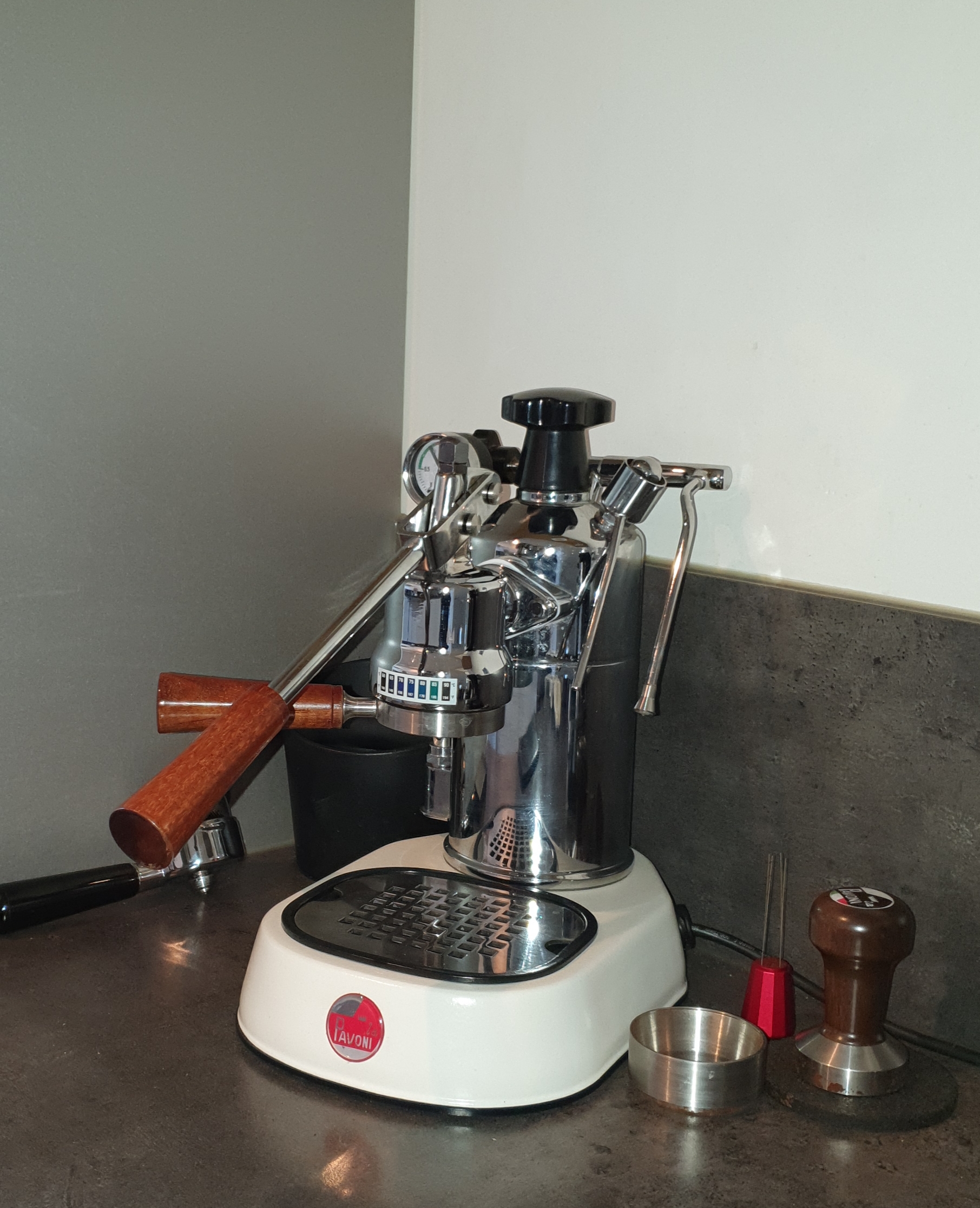 De Pavoni is een stuk vriendelijker in zijn prijs en is gelijk en goede uitdaging in de reden waarom ik een lever wil. Ik wil meer kunnen spelen met druk en meer het ambacht van koffie zetten beleven. Mijn E61 machine werd wat saai. Gegeven moment lukte dat wel.