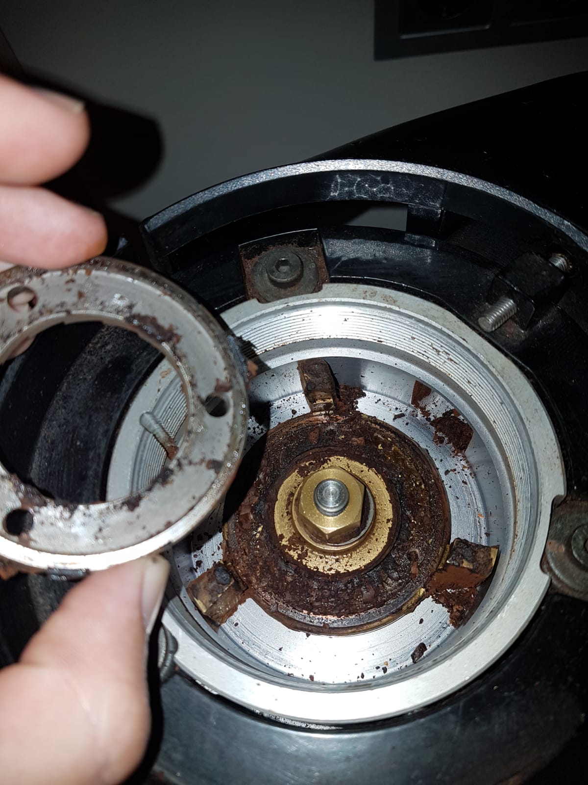3Mee eens. Cafiza is een sterke ontvetter. Zou geen vocht op die vaste schijf gooien, wel een natte doek erop te leggen en laten intrekken. Dan met de borstel en stofzuiger. Hoewel ik me goed kan voorstellen dat onder de maalschijf eenzelfde koek zit. Dan demonteren. Dan blijft uitlijnen van de 2 schijven nog een issue ervan uitgaande dat de schijven vanuit de fabriek goed uitgelijnd zijn gemonteerd. Als het stalen schijven zijn wel goed droogmaken ter voorkoming van roest. Succes!
