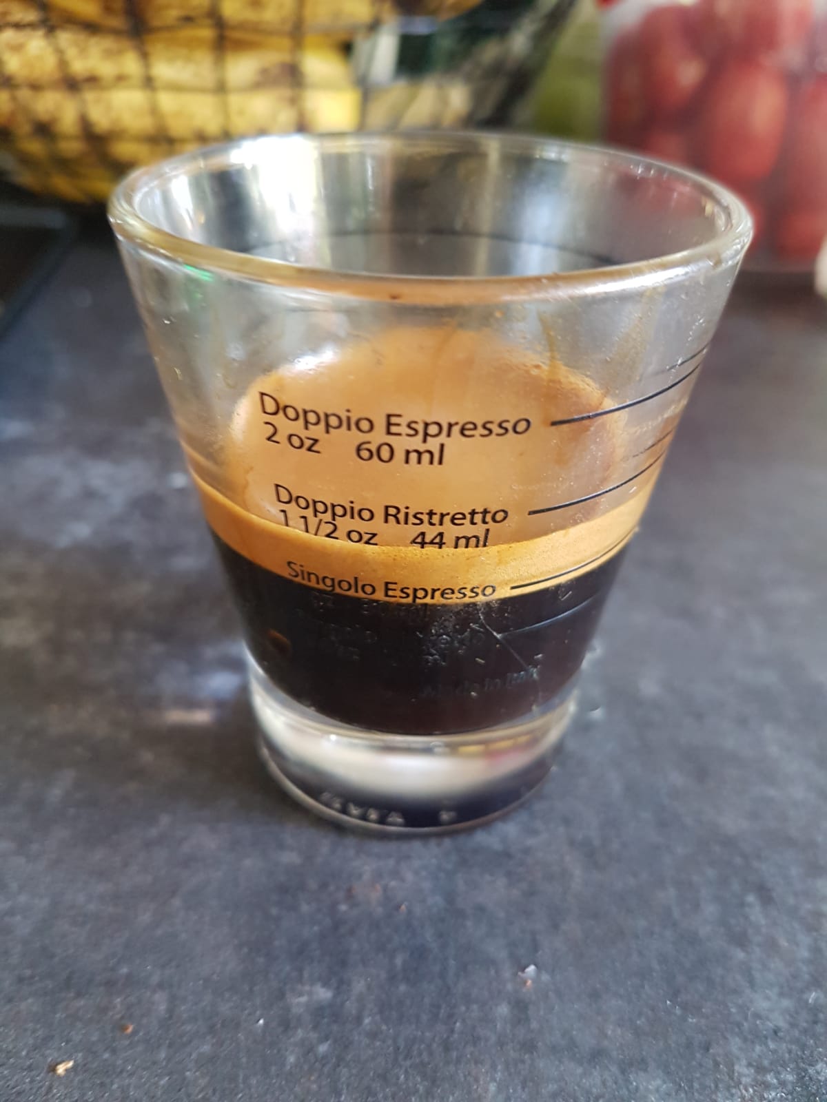 20g koffie in, 30g koffie uit, in 21s dus nog wat te snel maar het begint ergens op te lijken.