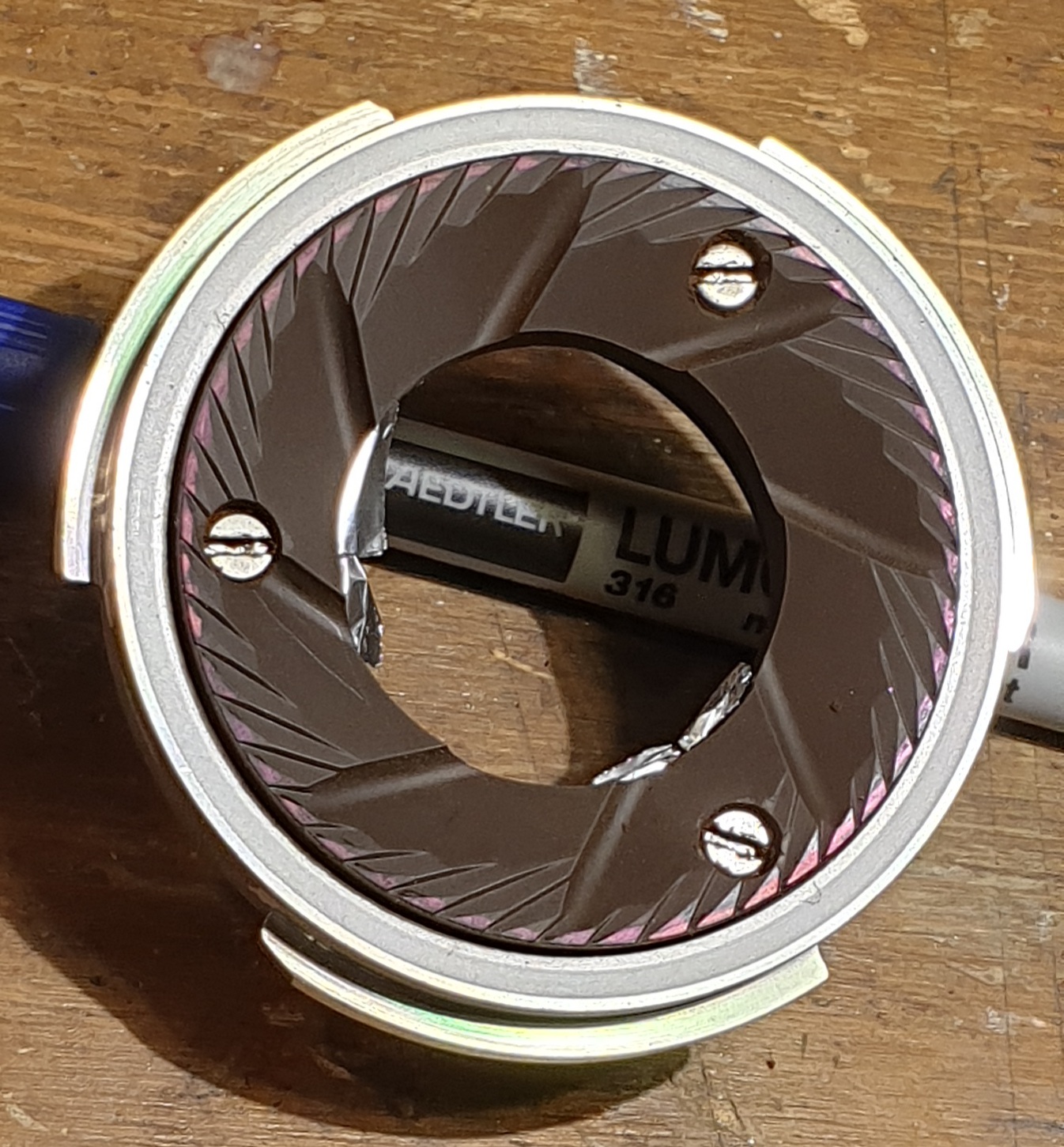 Ik heb alles grondig schoongemaakt en toen de passing van de maalstenen gecontroleerd. Op youtube staat een methode waarbij je met viltpen een spoor tekent op de raakvlakken van de maalschijven, dan de schijven elkaar draaiend laten raken en checken hoe de inkt is afgesleten. De onderste (draaiende) schijf is egaal afgepoetst, maar de bovenste (vaste) schijf ziet er dan zo uit: