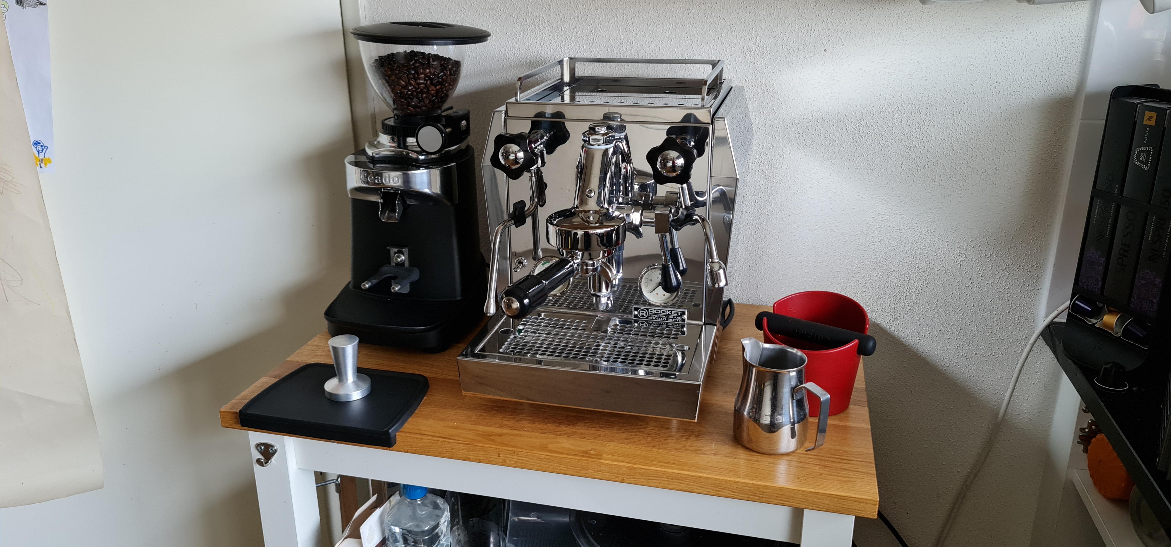 Heel veel jaren geleden begonnen met een Rancilio Silvia met een simpele maler. Na een poos begon het wat meer te kriebelen en moest er wat nieuws komen. Iets waarmee je wel kon stomen tegelijk of direct na het maken van de koffie.