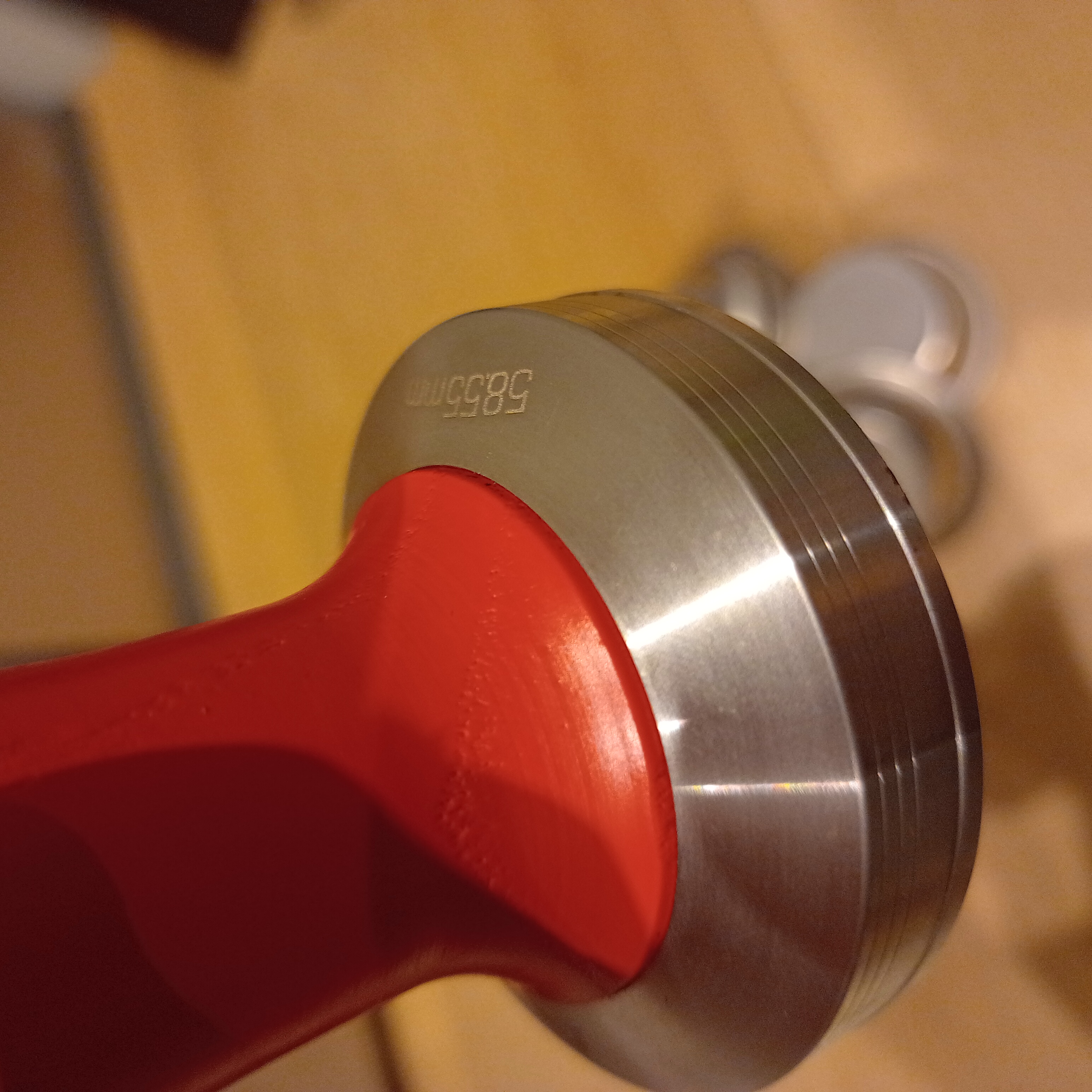 1* PLA481R flat base 58.55mm RVS tamper precies op maat voor de filterbakjes. Met mooie opstaande rand die vastzuigen van de puck voorkomt en hulplijnen die helpen bij recht tampen. Rode houten greep is te vervangen M8 schroefdraad.