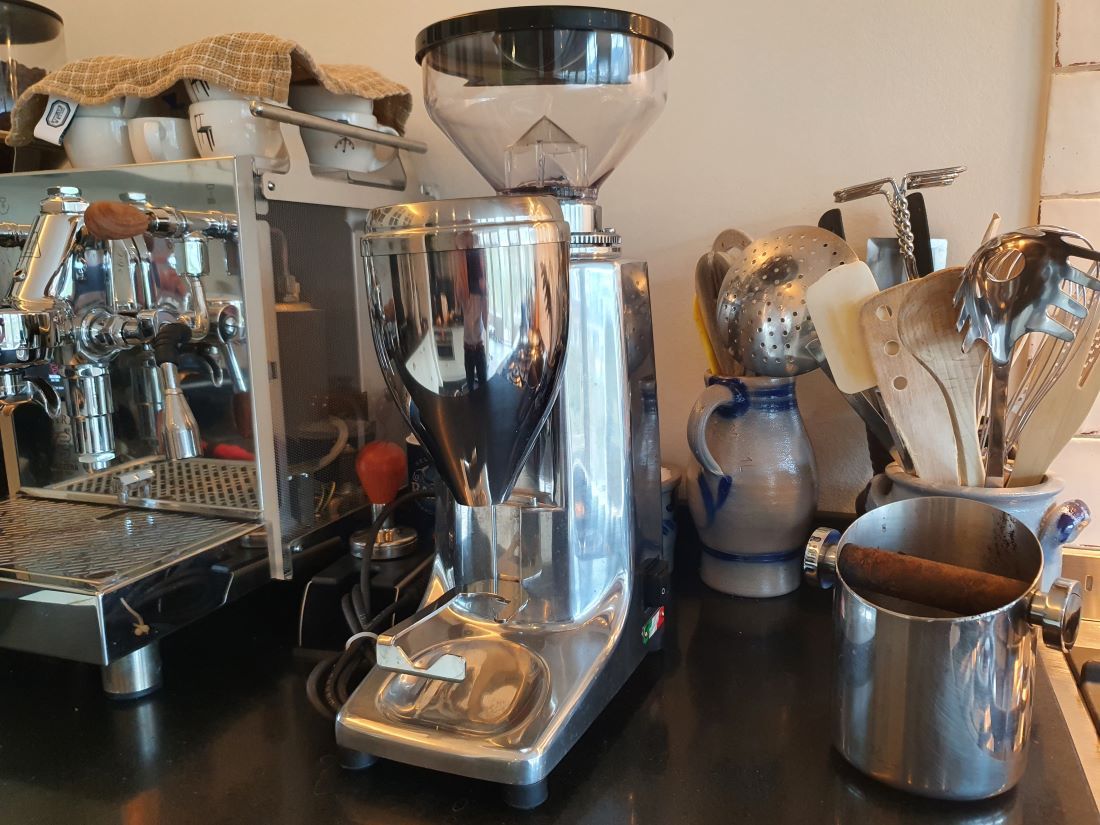 Dat is dus € 100 duurder dan de andere, maar die andere heeft een heel Horeca-leven achter de rug, wat je niet aan het maalsel merkt, maar van buiten ziet hij er wel wat doorleefder uit dan deze Quamar in gepoetste aluminium uitvoering. Vandaar het prijsverschil. En deze heeft de kleine hopper, dus die past onder het keukenkastje. Ook handig.