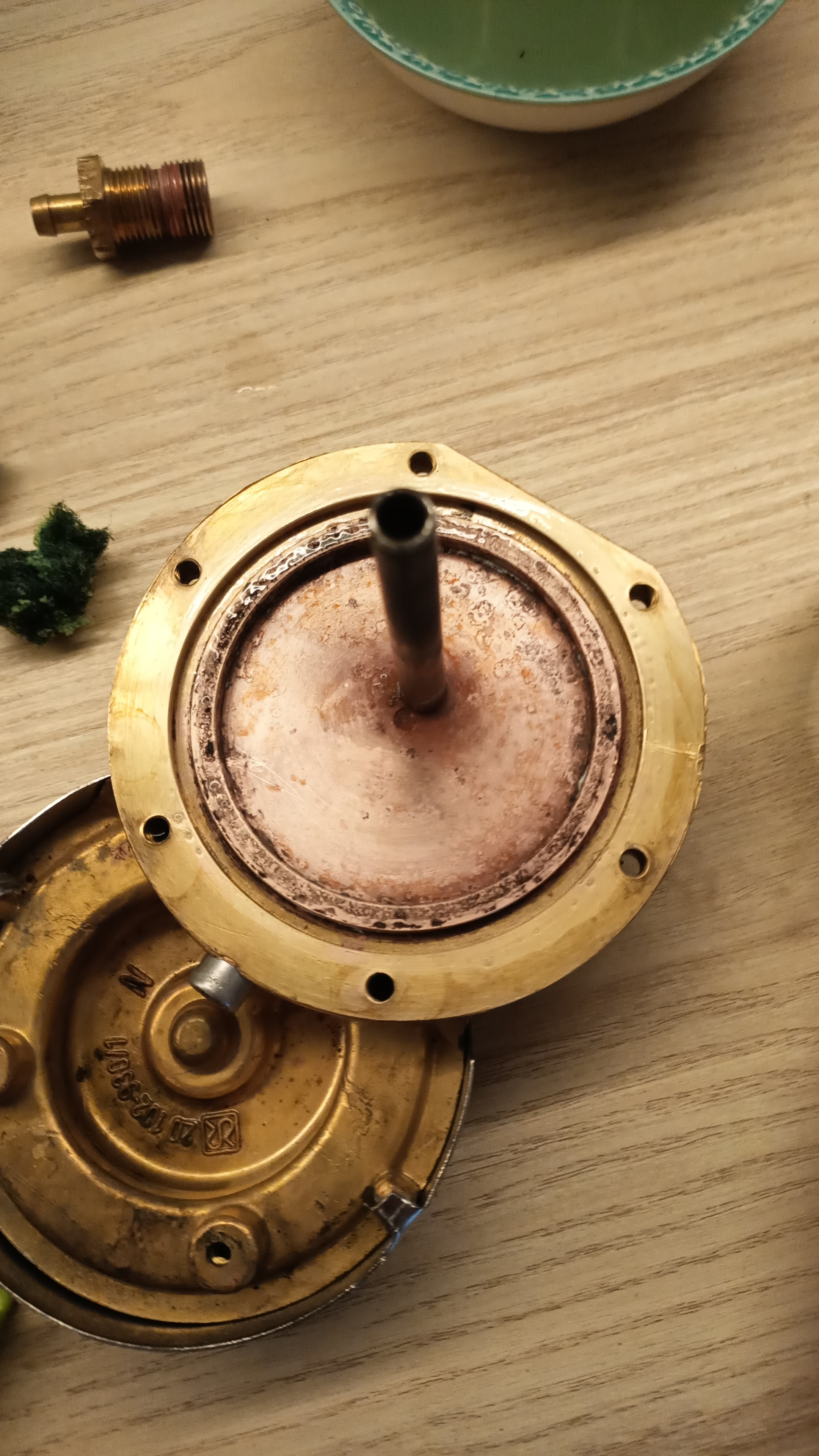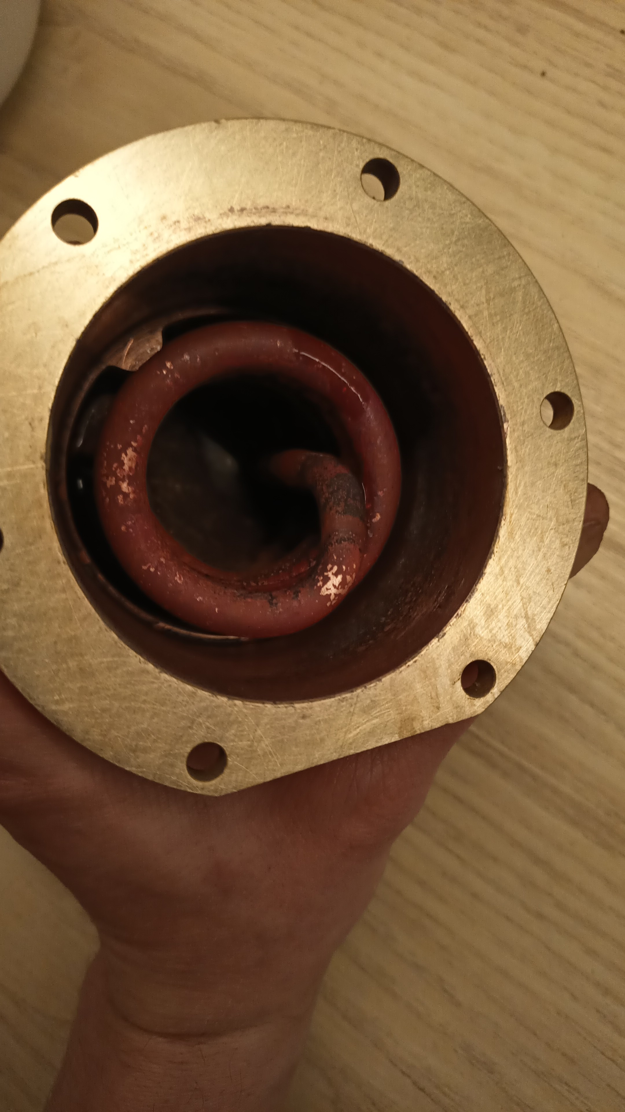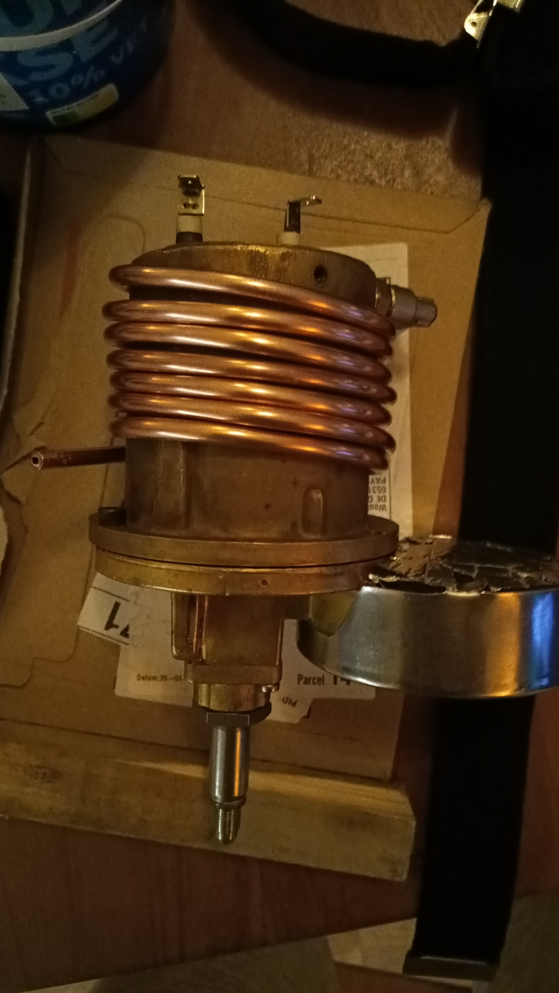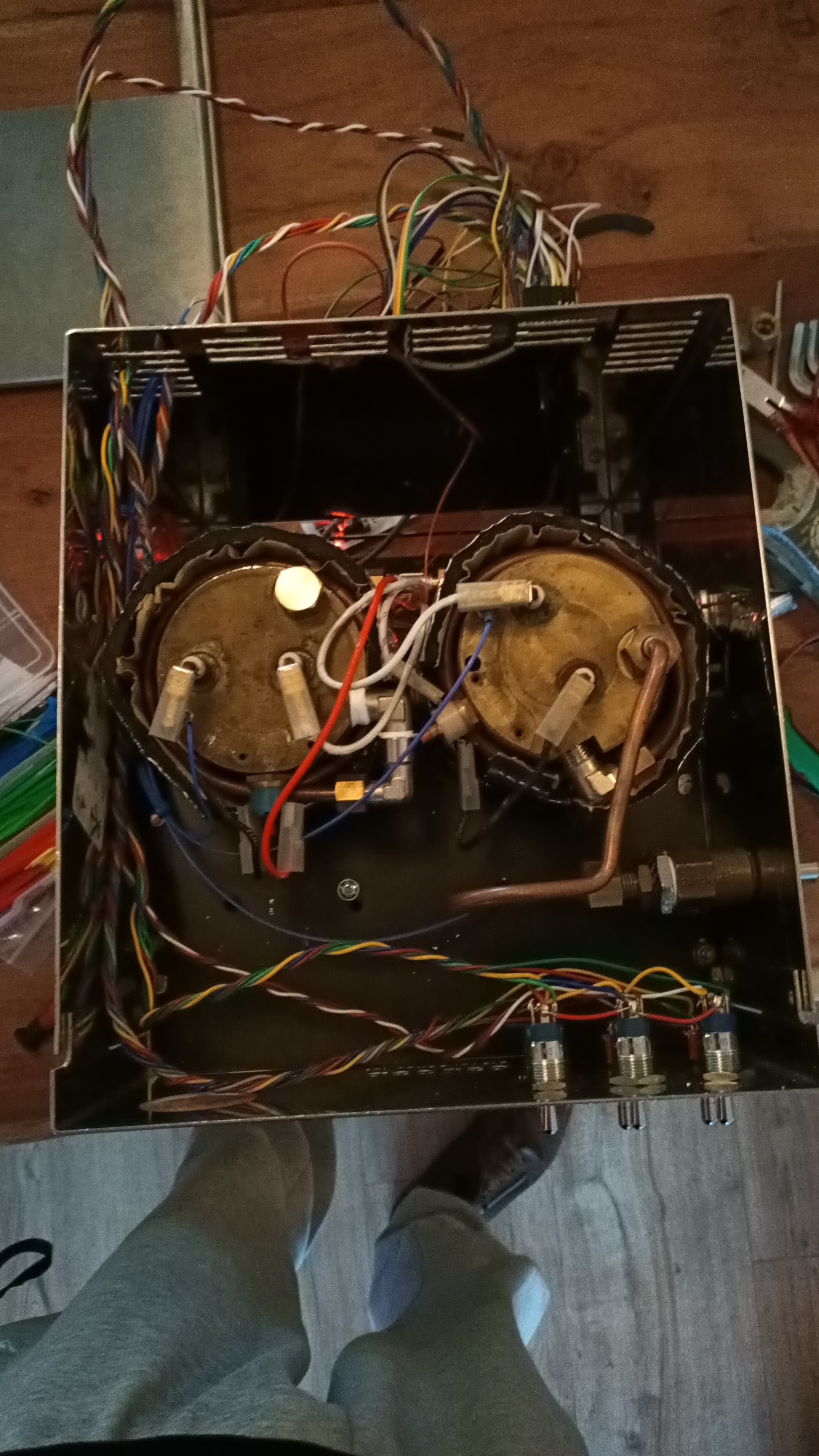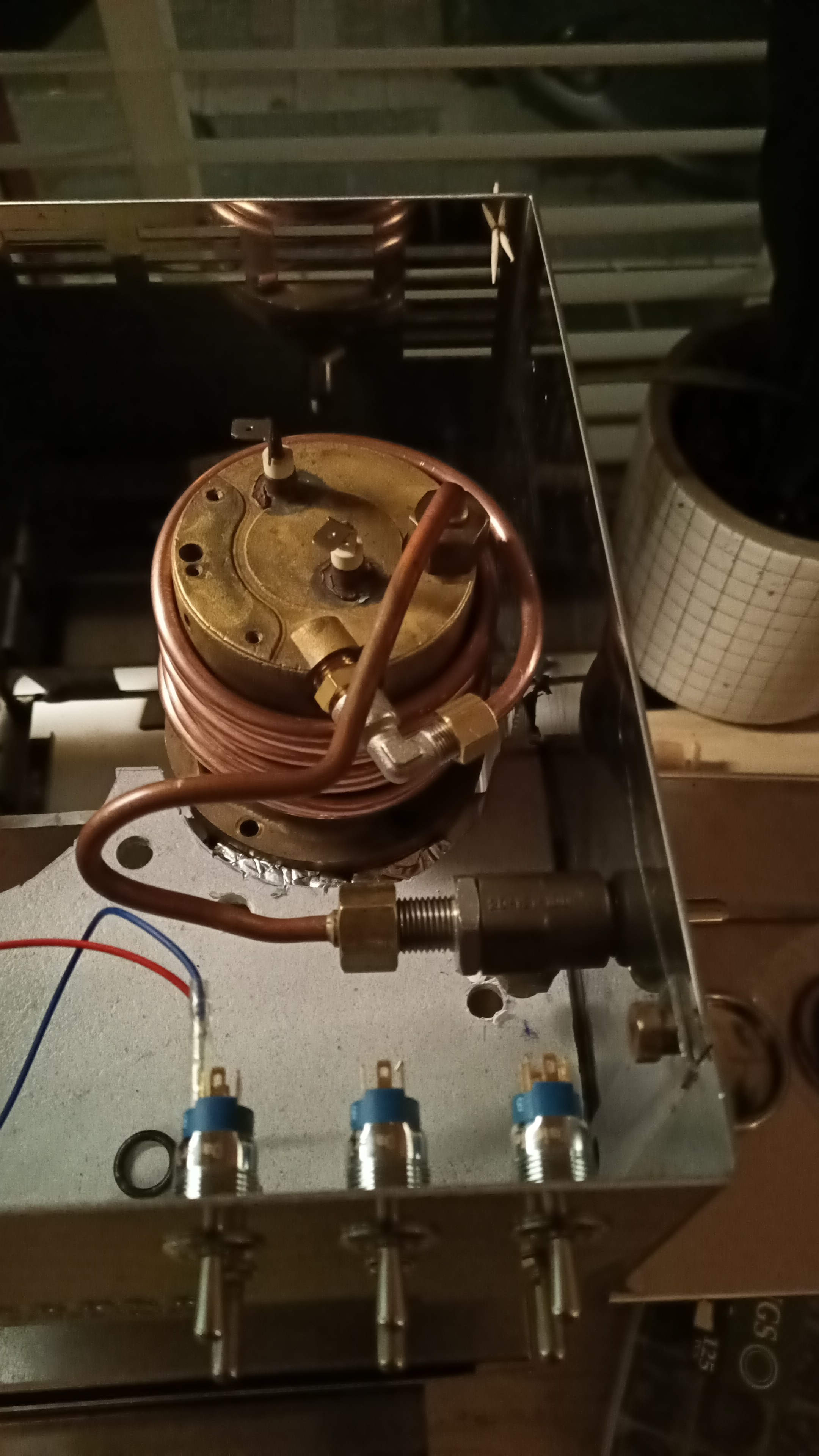 Water wordt door de pomp naar een T-stuk gebracht, waar het water verdeeld wordt over de beide boilers. Het overduk ventiel is naar de pomp verhuisd. Vanaf het T-stuk ben ik overgestapt op 4x6 koperen leiding, die om de boilers gewikkeld zit. Bij de aansluiting van de leiding op de espressoboiler zit een digitale drukmeter. Om de koperen leidingen heeft iedere boiler een isolerende mantel.