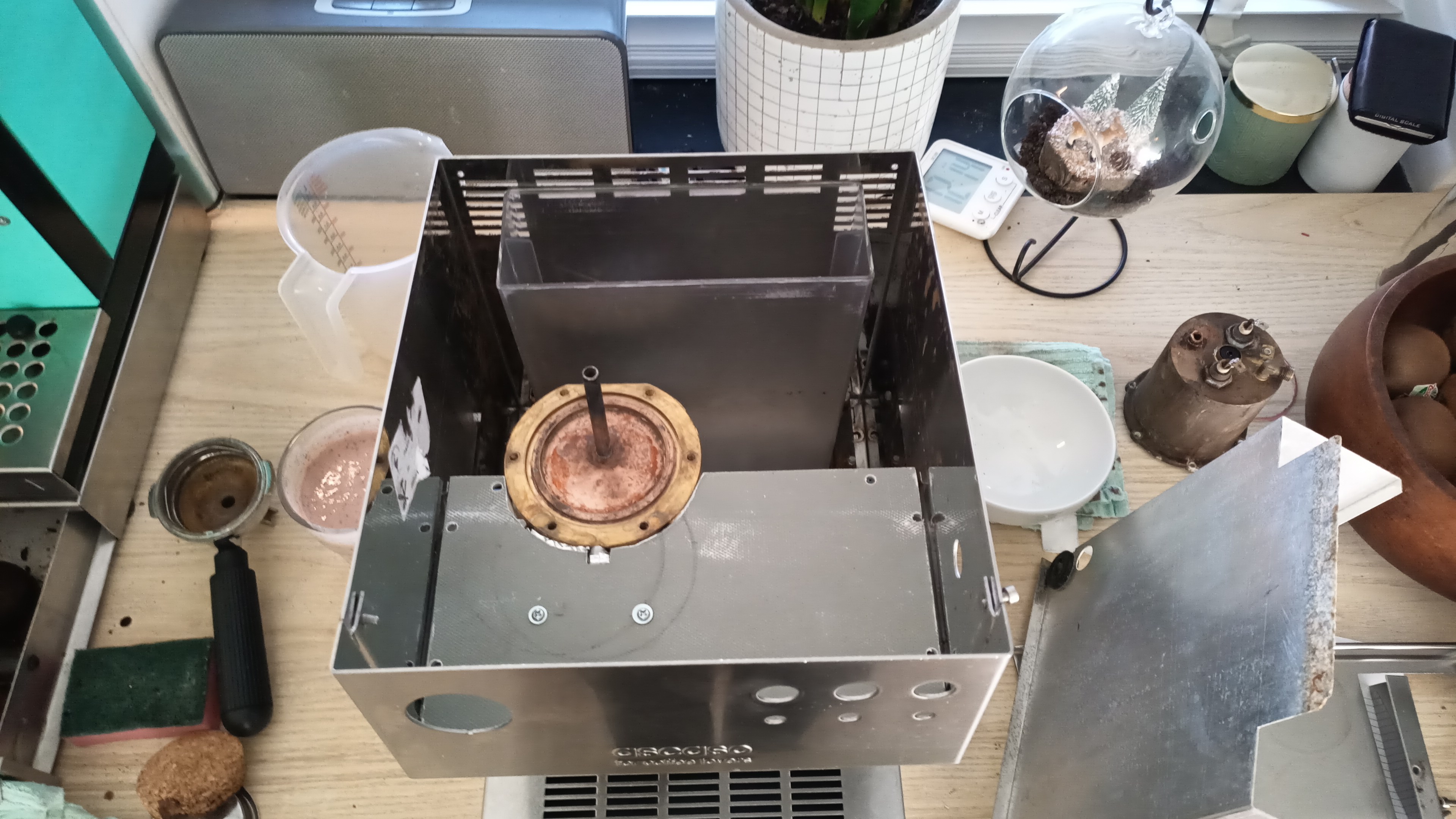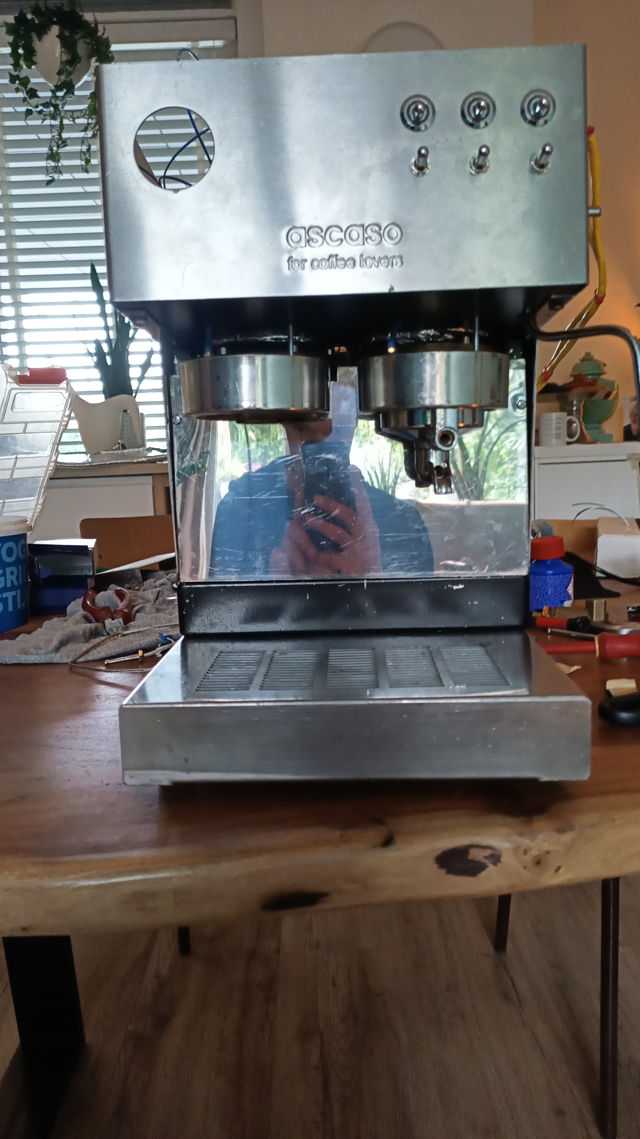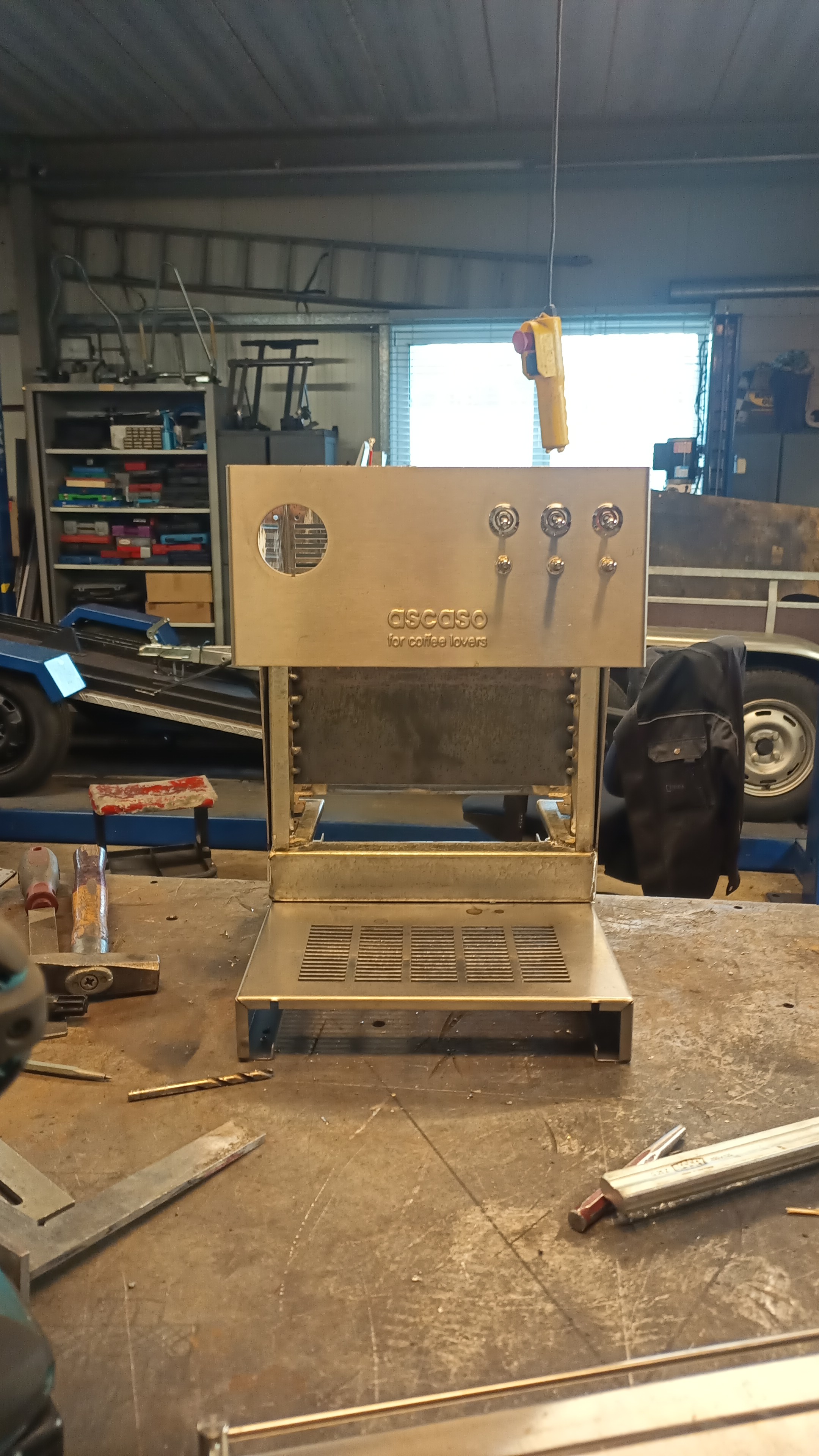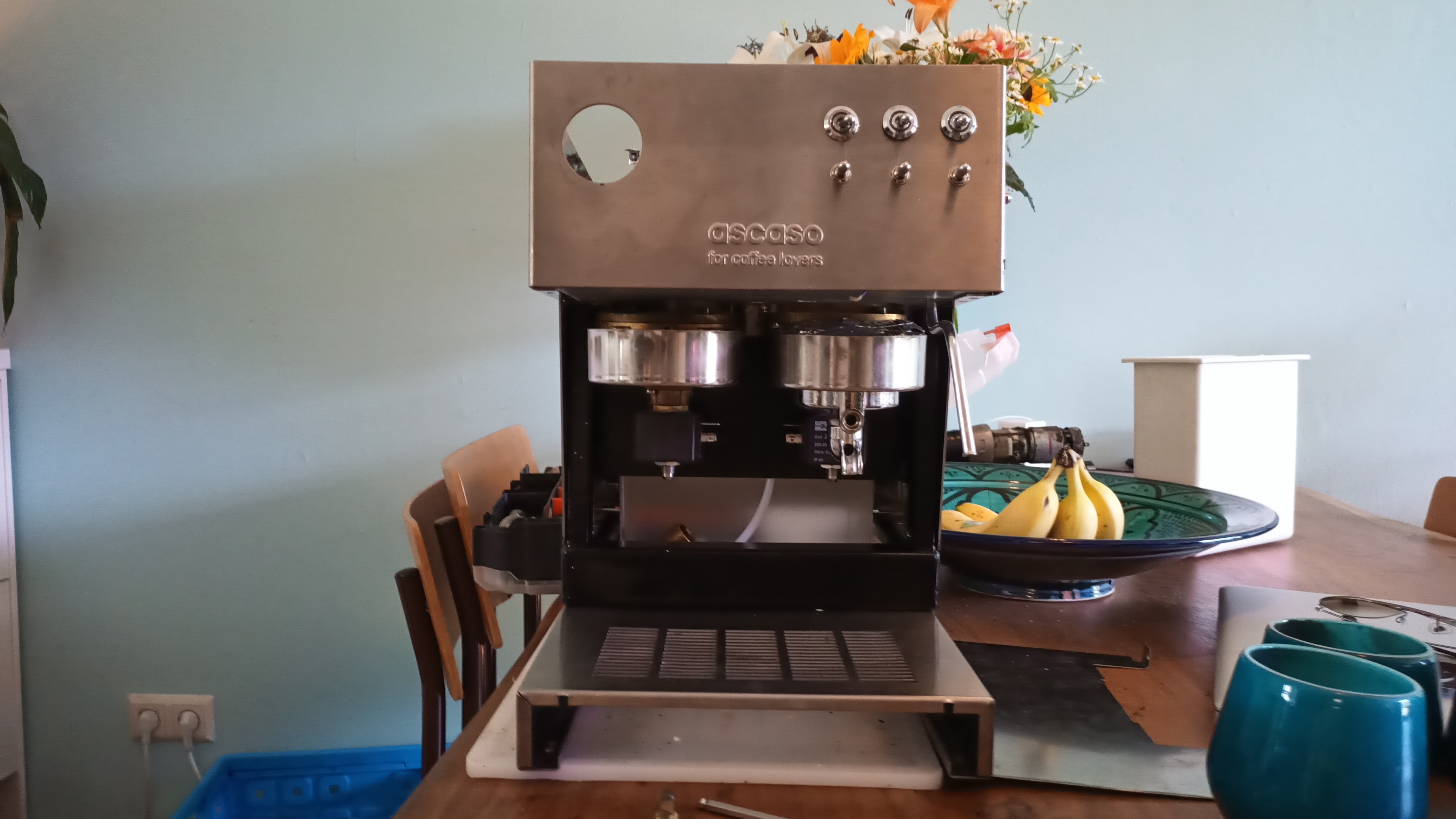 Na enig zoeken kwam er een Ascaso Steel Uno Professional op mijn pad, met allerlei defecten, waar de beide boilers in zouden moeten passen. Om de boilers op hun plek te houden heb ik een nieuw frame gemaakt, dat het bovendeel van de behuizing zodanig verhoogt dat ik mijn weegschaal beter kan gebruiken tijdens het zetten.