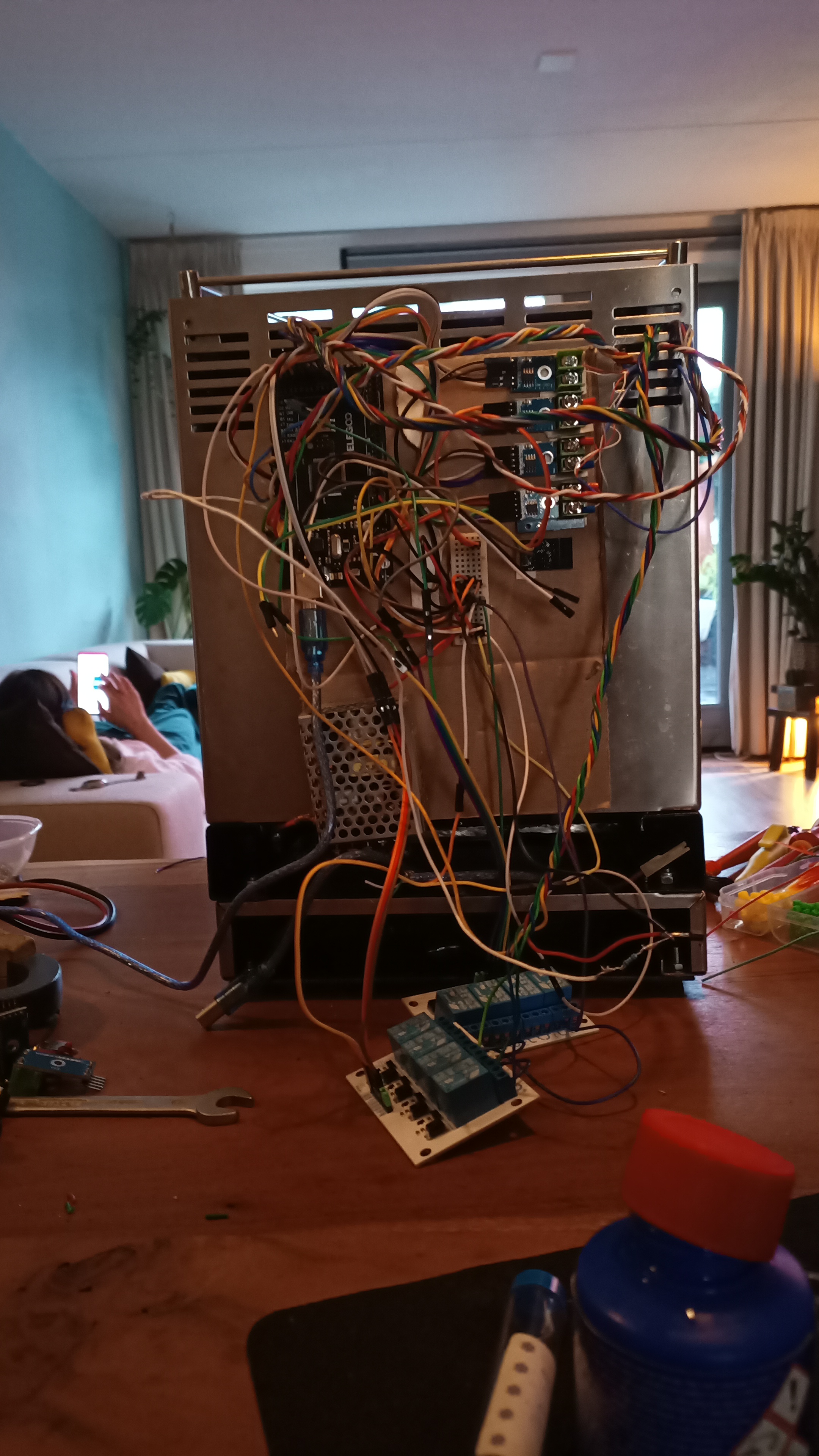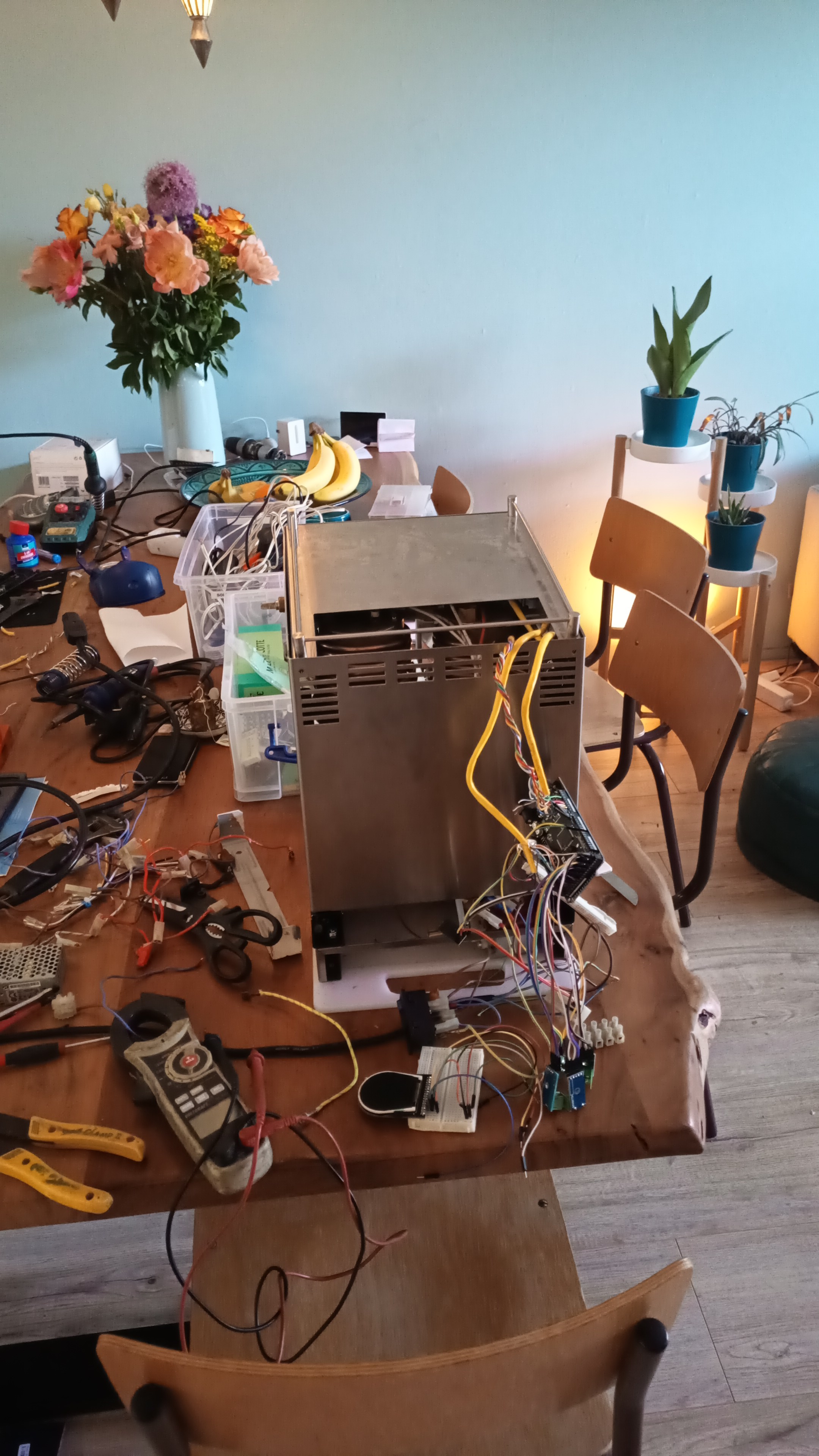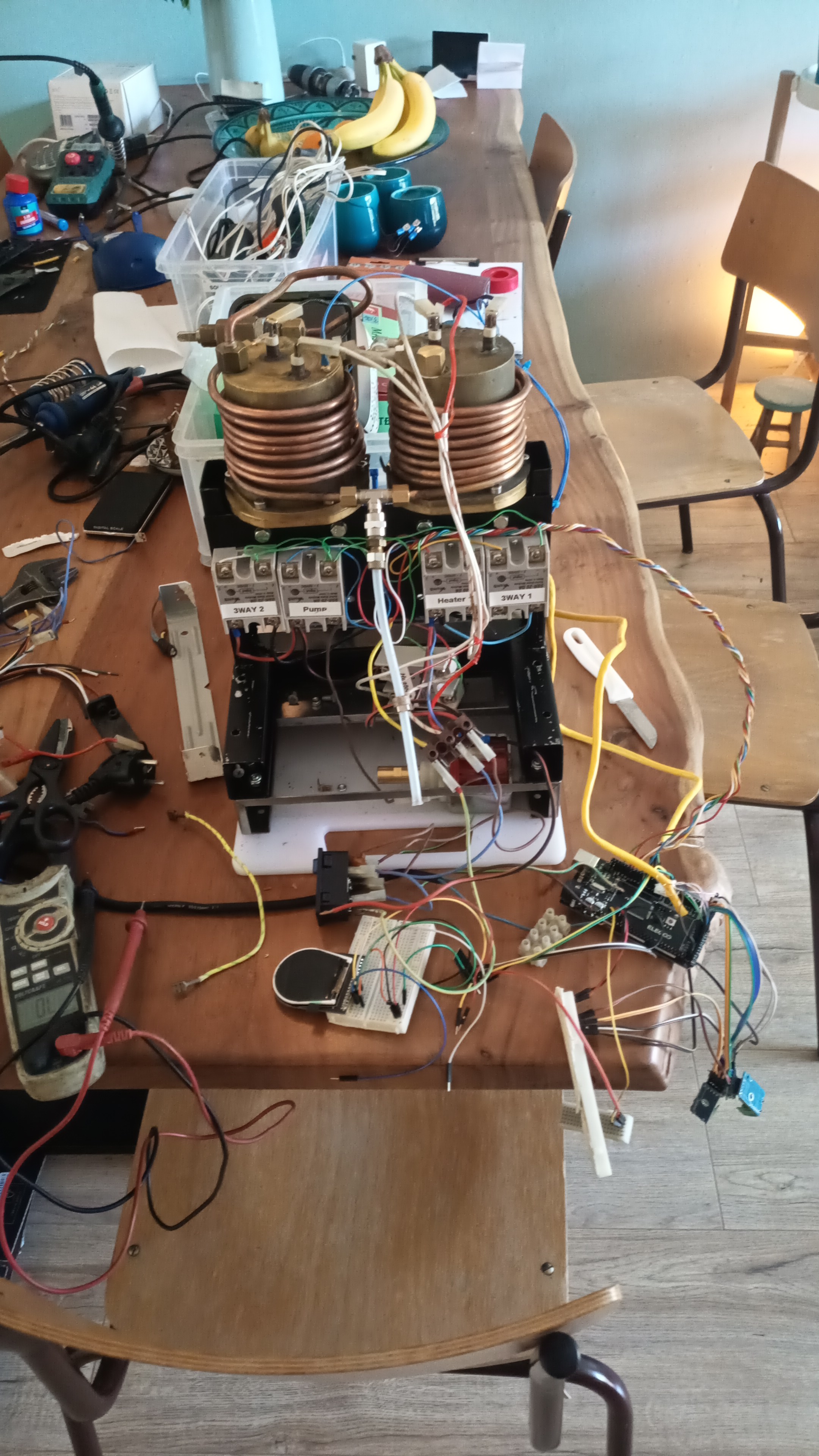 10Dan tijd voor een espresso terwijl alle schakelaars, leds, ssr's en sensoren worden getest. Na het vervangen van een kapot gesoldeerde schakelaar en wat kleine aanpassingen in de kabelboom, is het heuglijke moment daar dat alles werkt. Nu wachten op de laatste onderdelen en de nieuwe software afmaken, waarop een kleine video zal volgen