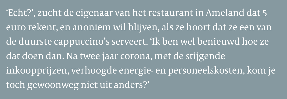 Koffie is wel een sluitpost en je wordt er echt niet rijk van, en door Coronamaatregelen en een nmm kunstmatig, en, naar ik vooralsnog neig te concluderen, kunstmatig geregisseerde energiecrisis zal de horeca en veel andere kleine ondernemer het intens moeilijk krijgen. Ik heb erg te doen met het MKB. Laten we hopen dat een strenge winter uitblijft.