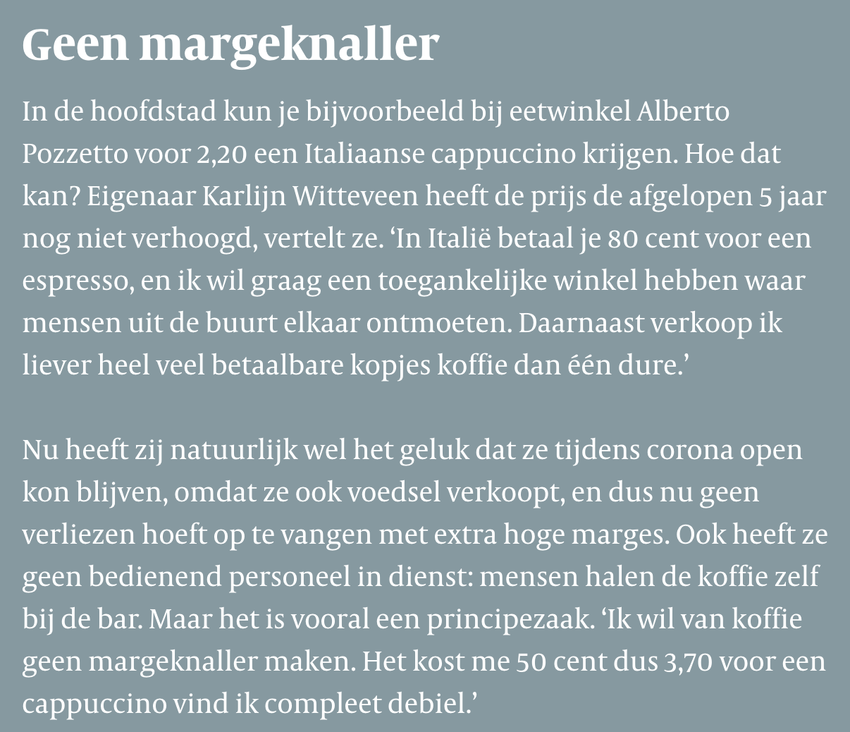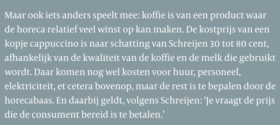 Overigens staat in het slot van het desbetreffende en dienaangaande artikel dat men toch wel een cappuccino blijft kopen, gewoon om toch af en toe een luxe gevoel te hebben.