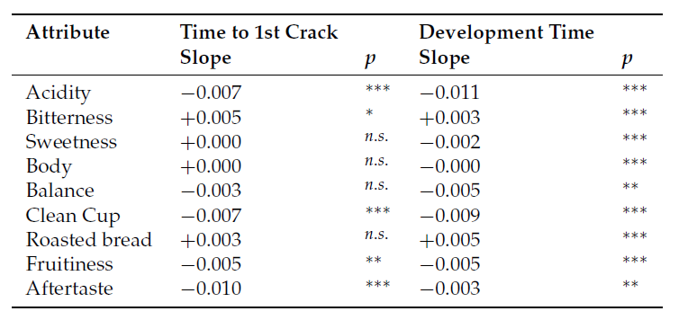 Het betreft de correlatie tussen de tijd in beide fasen en het toenemen/verminderen van de smaakprofielen. Ergo, hoe langer de tijd in een bepaalde fase hoe meer of minder (+ of -) een bepaalde smaak zich voordoet.