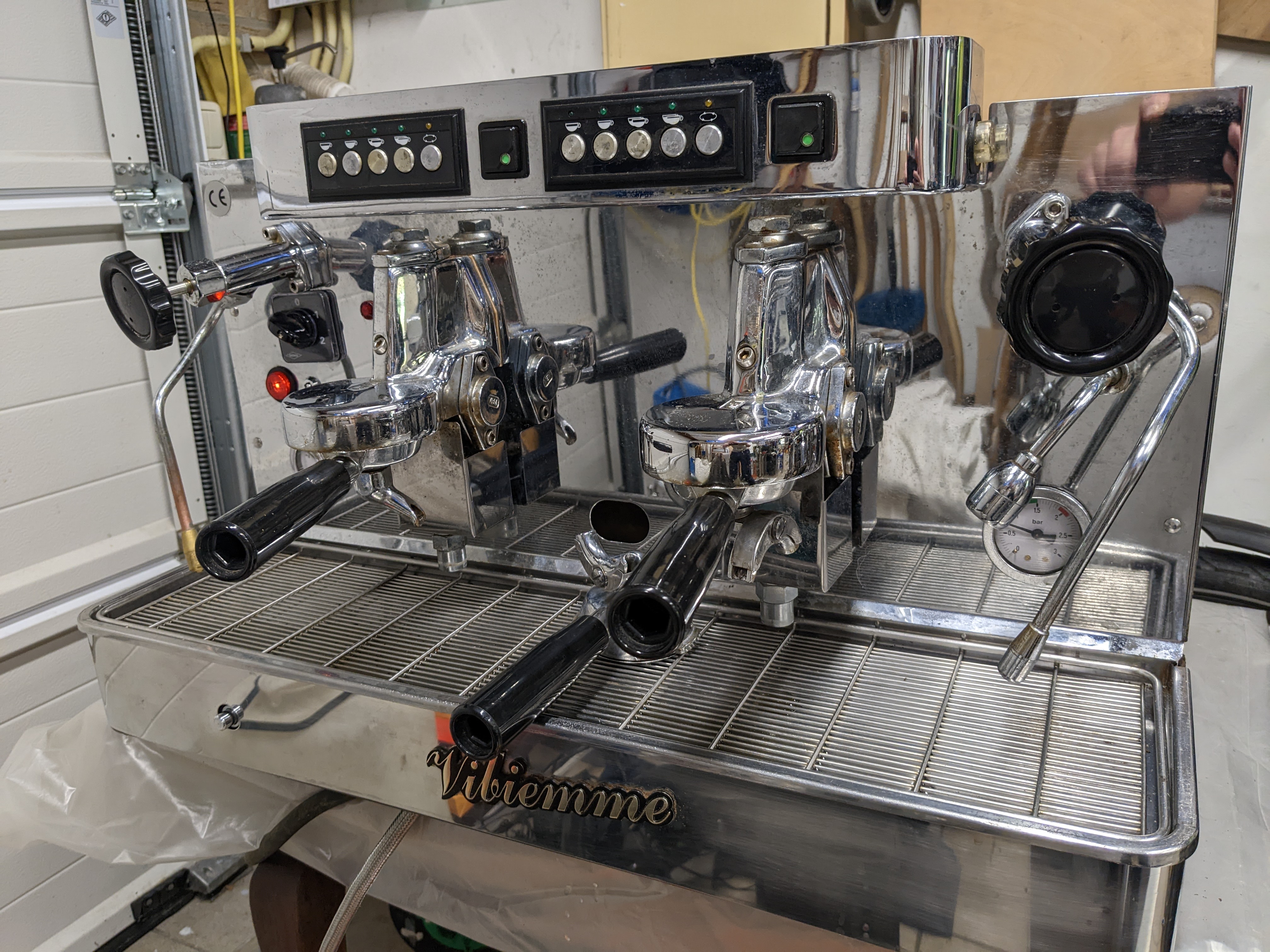 De hobby is zich aan het uitbreiden. Niet zo lang geleden kon ik een oudere Vibiemme 2 groepen horeca machine uit 1999 overnemen. Deze komt uit een lunchroom die ik ken en heeft een aantal jaren stil gestaan. Helaas heeft dit tot gevolg gehad dat deze verstopt, defect?, in ieder geval niet meer werkt. Allereerst heb ik geen verstand van de werking, bediening van dit soort machines.