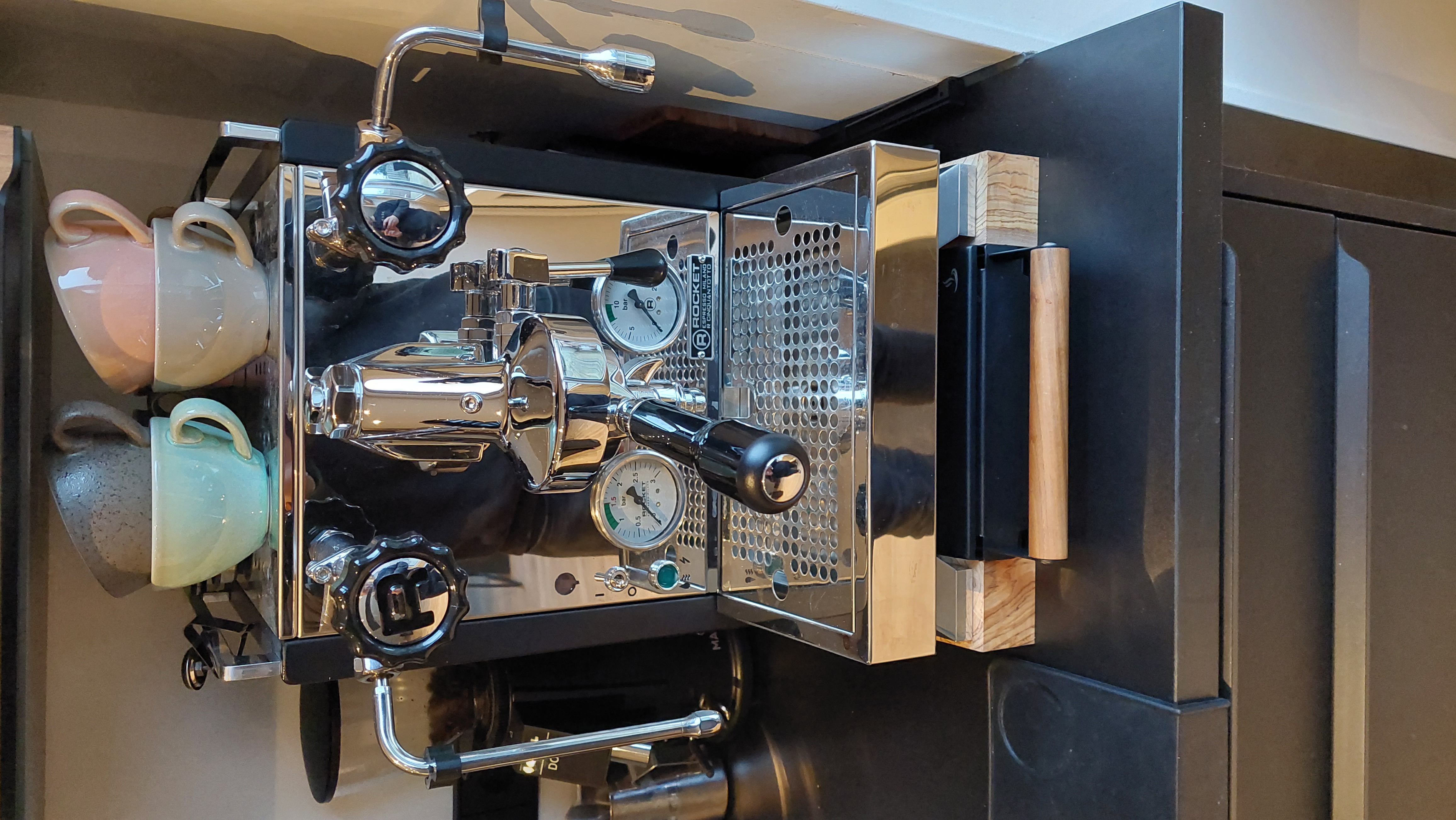 Na een tijdje sparen en onderzoeken had ik bijna een VBM domobar Super gekocht. Echter was die nergens meer op voorraad. Er was wel een nieuwe versie, maar die had een niet zo klassiek ogende futuristische uitstraling. Toen ben ik wat door gaan zoeken (en sparen) en heb ik uiteindelijk een Rocket R58 gekocht, vergezeld door een Macap M2E Domus. Ik heb de zijpanelen van de Rocket zwart gewrapped (Natuurlijk moet het er op het aanrecht ook goed uitzien).