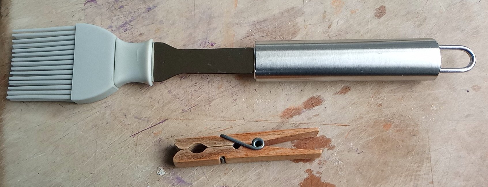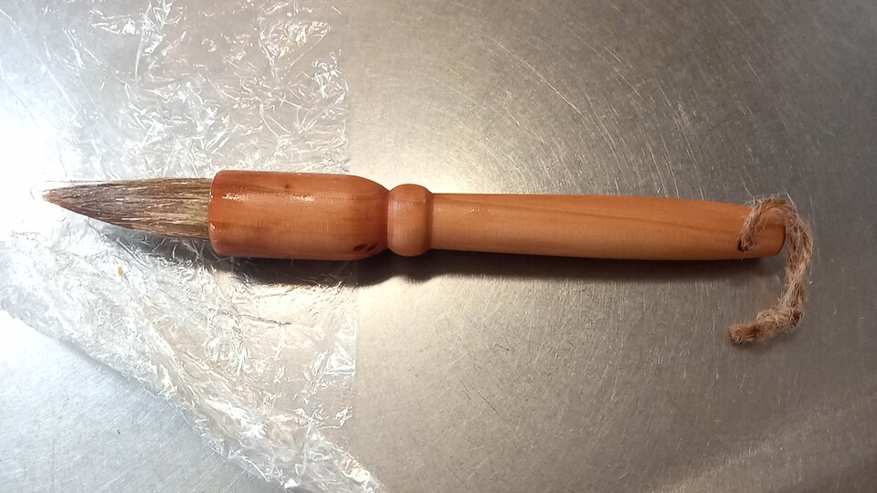 Als ik brood ga bakken in een broodbakblik of pizza ga bakken op een bakplaat, dan worden deze ingevet. Dat doe ik met een kwastje van varkenshaar in een houten steel, gedept in de olie. Na het invetten haal ik een vel papier van de keukenrol over de haren om het meeste overtollige vet er af te halen en rol ik de punt in het plastic en verdwijnt de kwast in de koelkast.