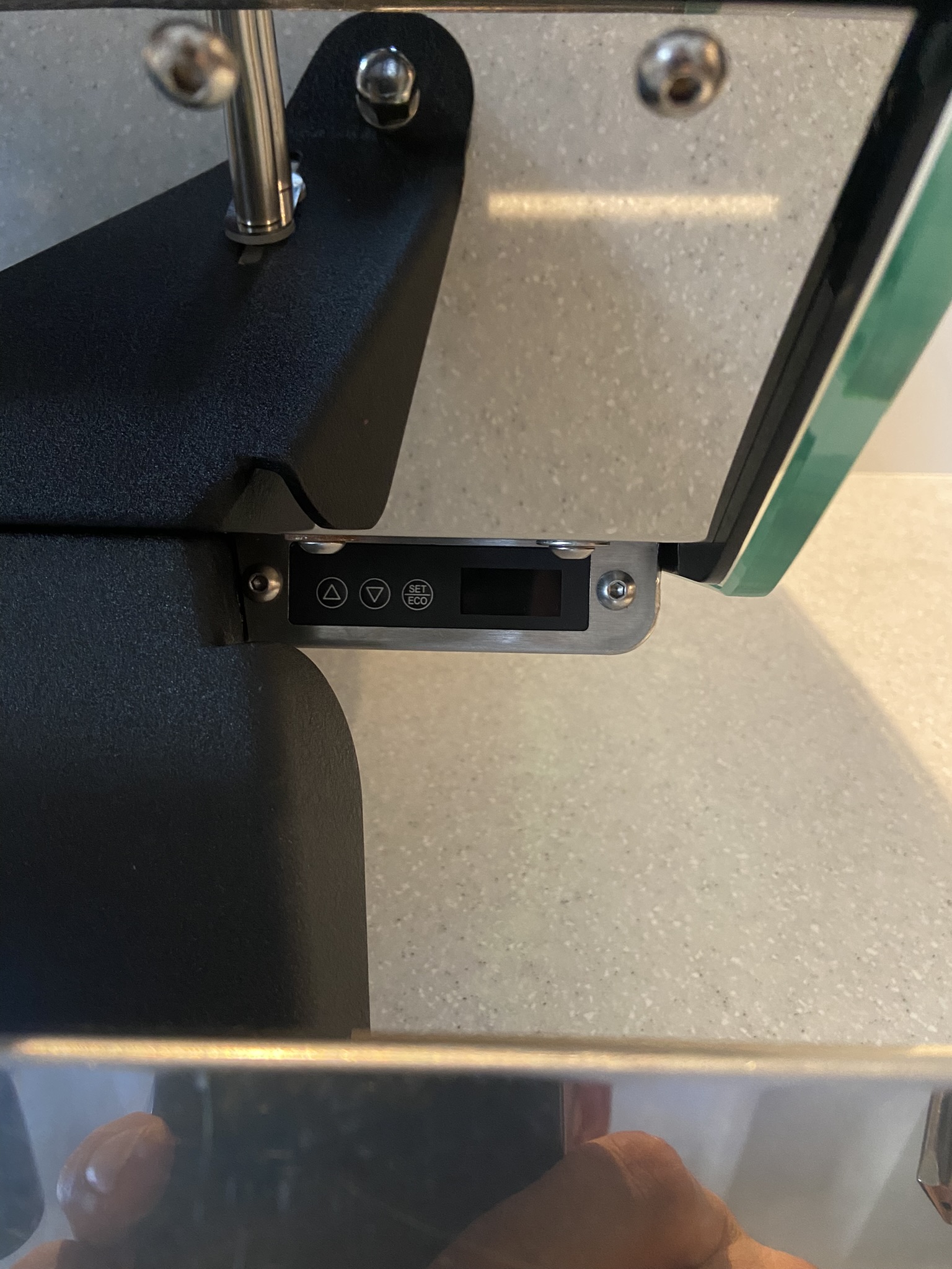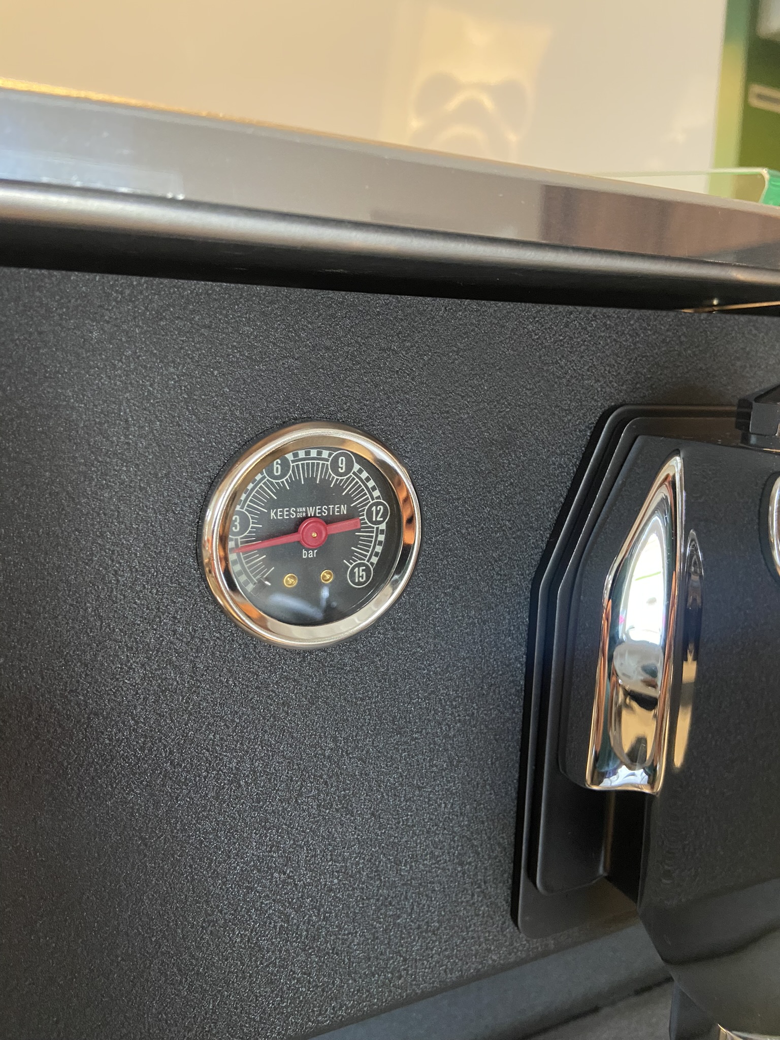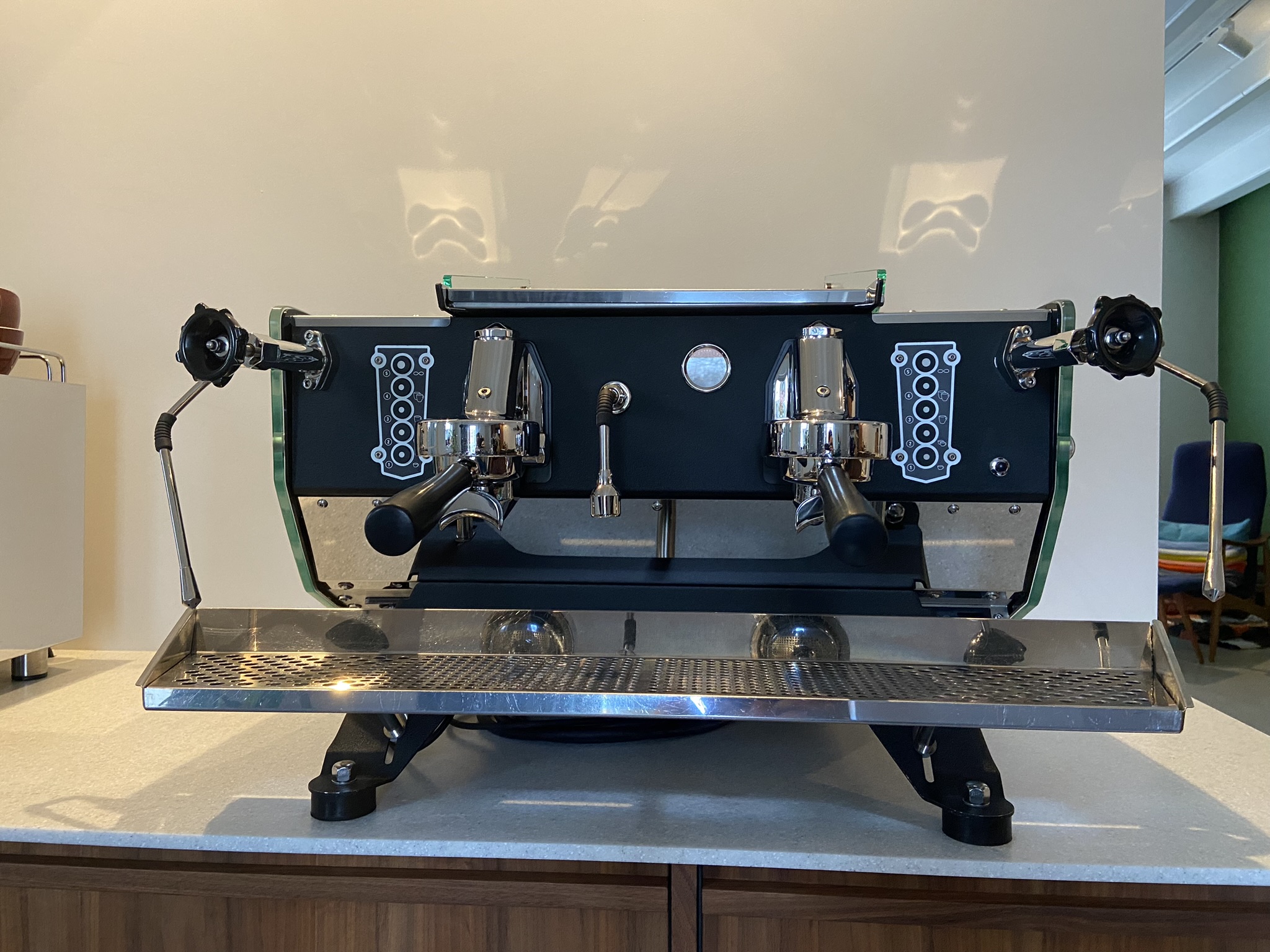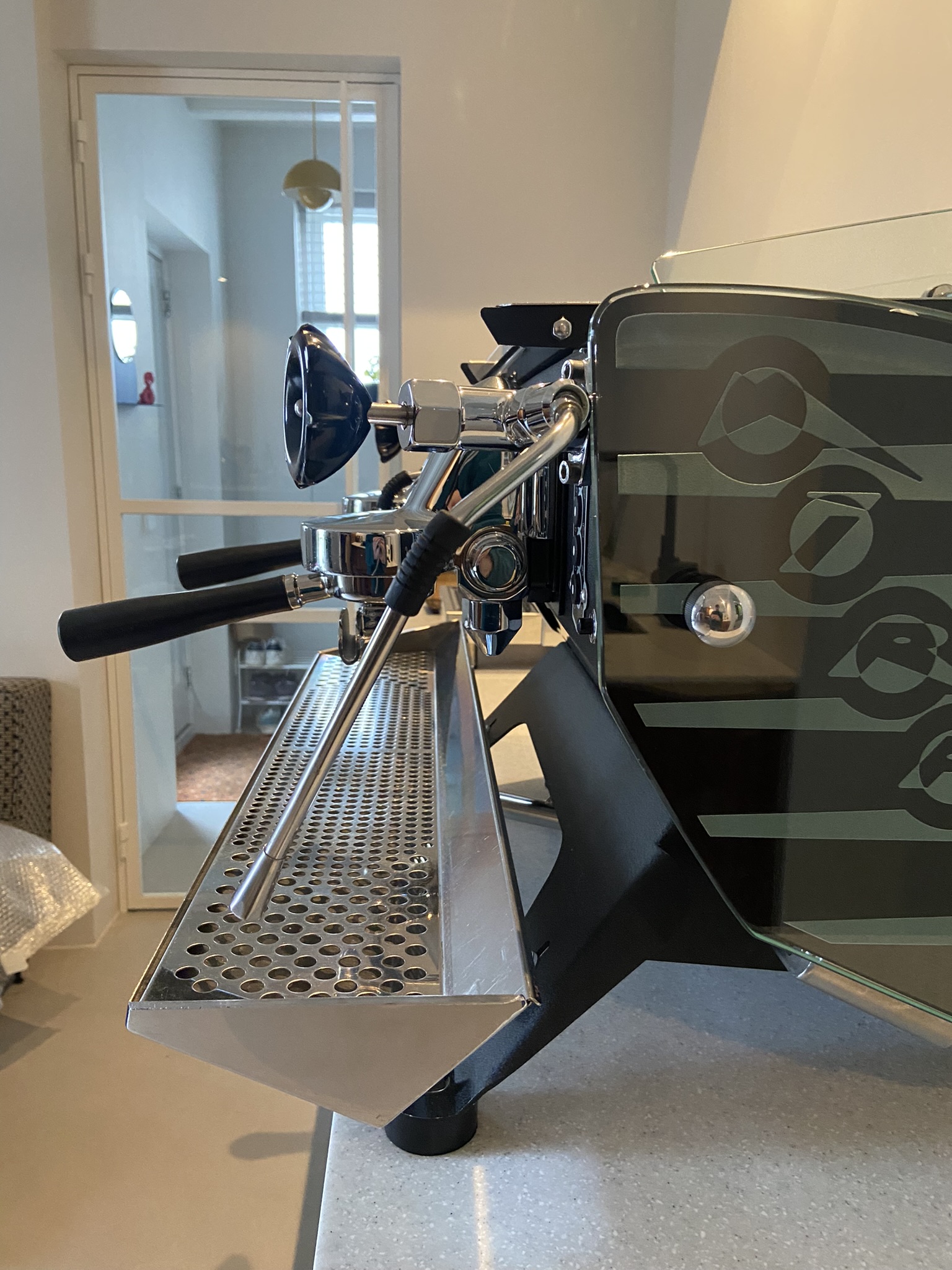 De machine is voorzien van crackle black front body panel en frame, PID, glazen zijpanelen, het nieuwe model touchpad en drukmeter en nieuwe filterdragers met filters.