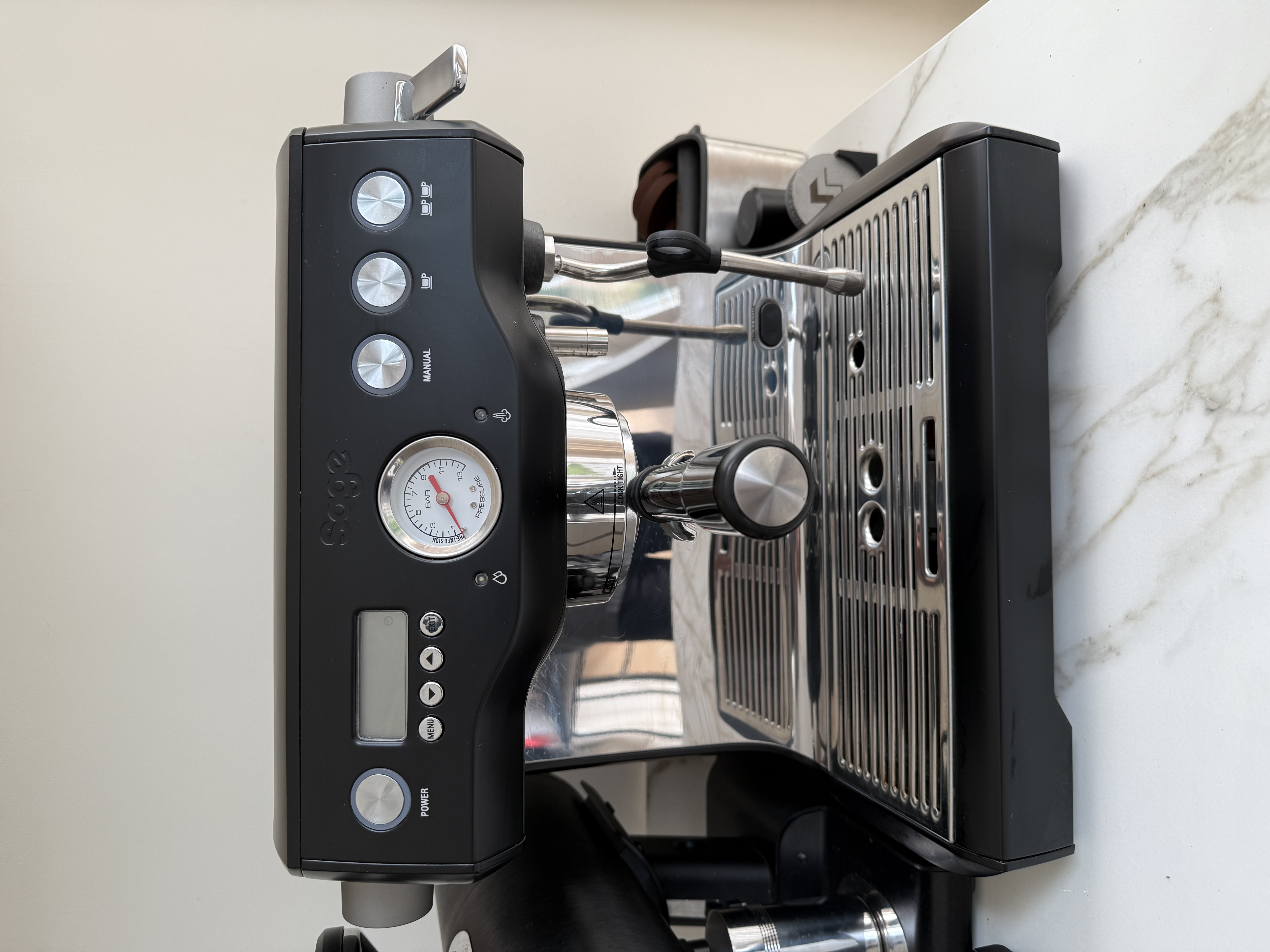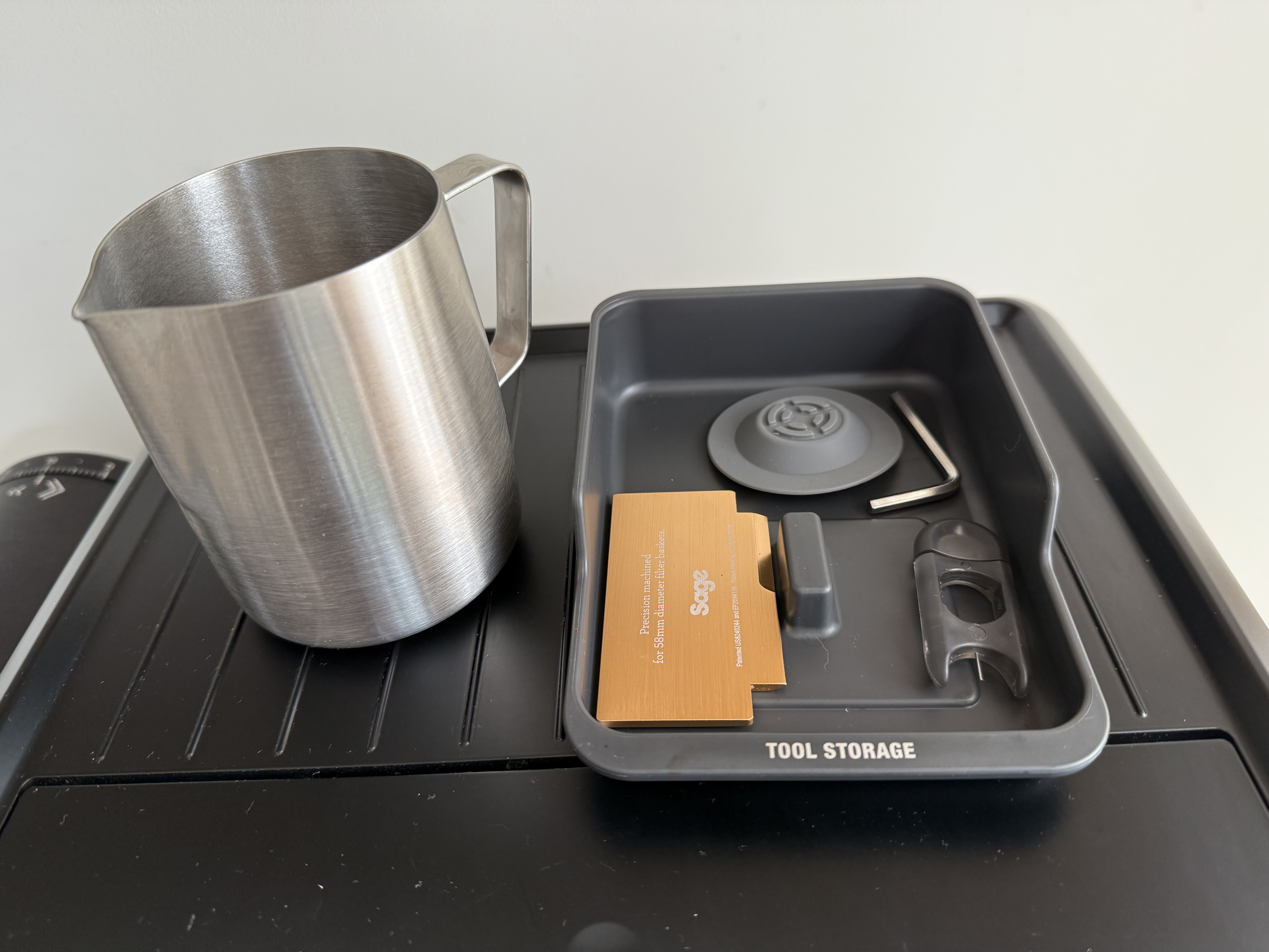 De machine komt met een melk kannetje en 2 portafilters, een originele dubbele uitloop en een bodemloze portafilter. Beide van Sage zelf.